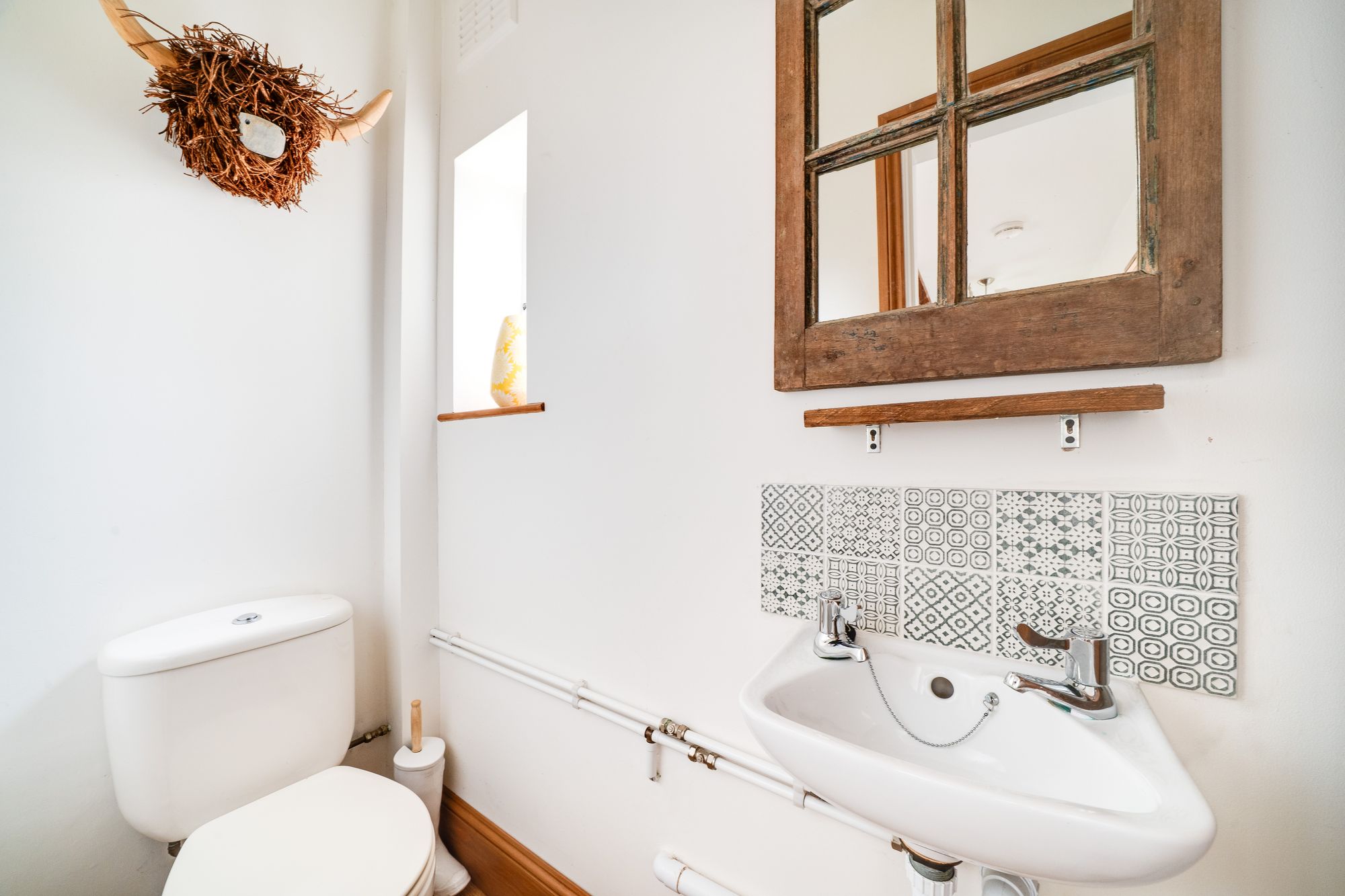 The lounge is a particularly well-proportioned and characterful space, featuring amulti-fuel burner with tiled hearth, and double glazed French doors opening out onto the rear patio and garden. A guest cloakroom with WC and hand wash basin completes the ground floor accommodation.