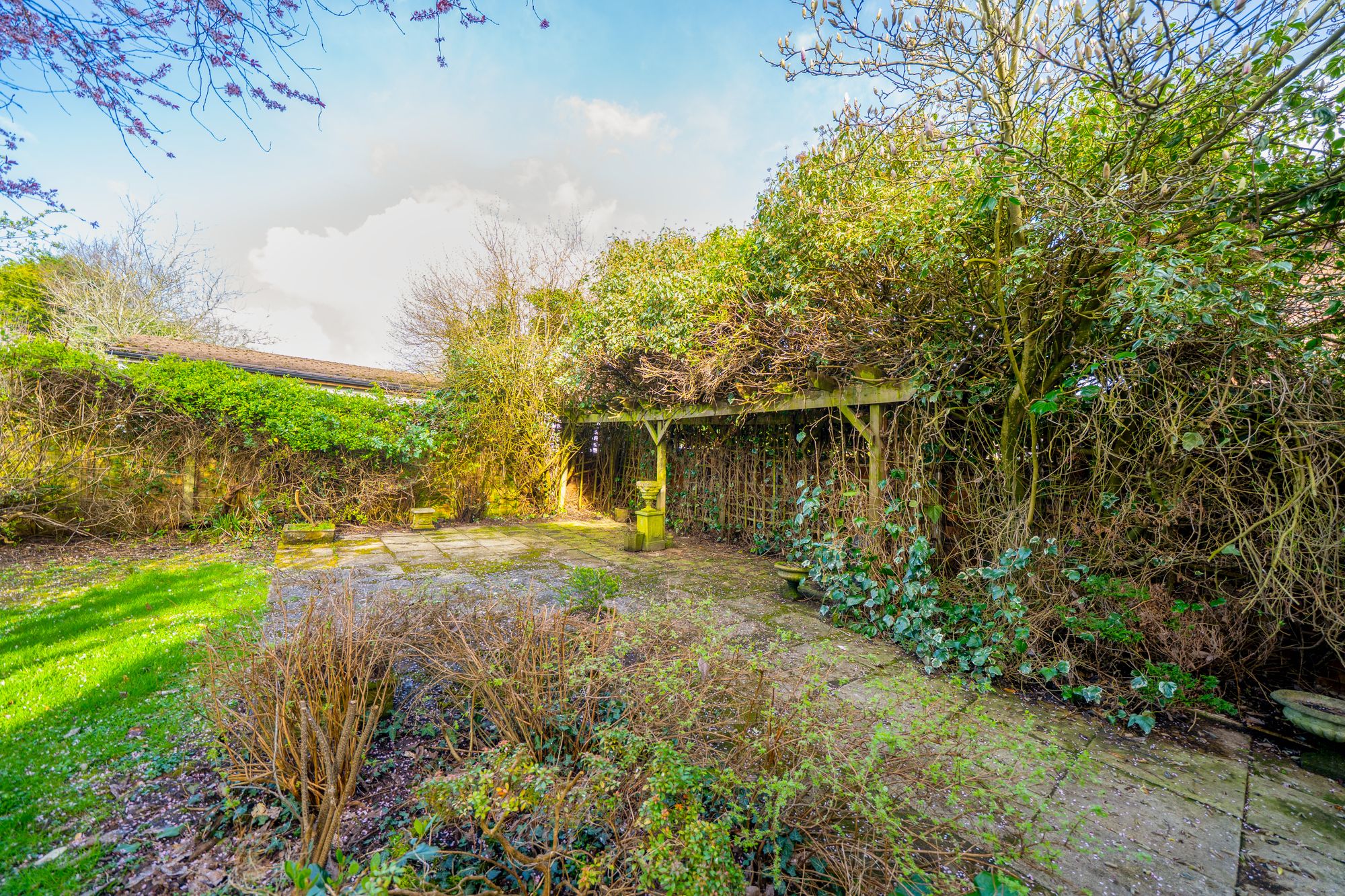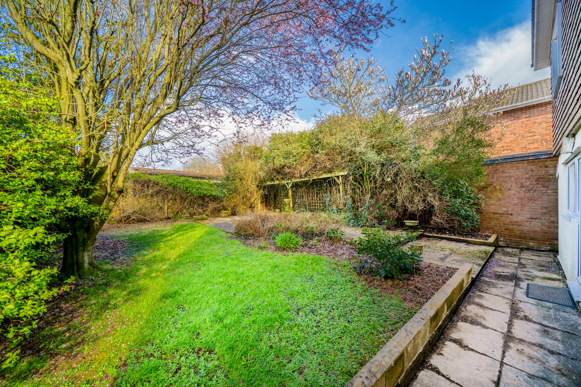 Externally, the gardens are a notable feature, with a combination of lawn and paved seating areas ideal for outdoor dining and relaxation. Mature planting provides privacy and seasonal interest, while a pergola offers a charming focal point and sheltered seating area.