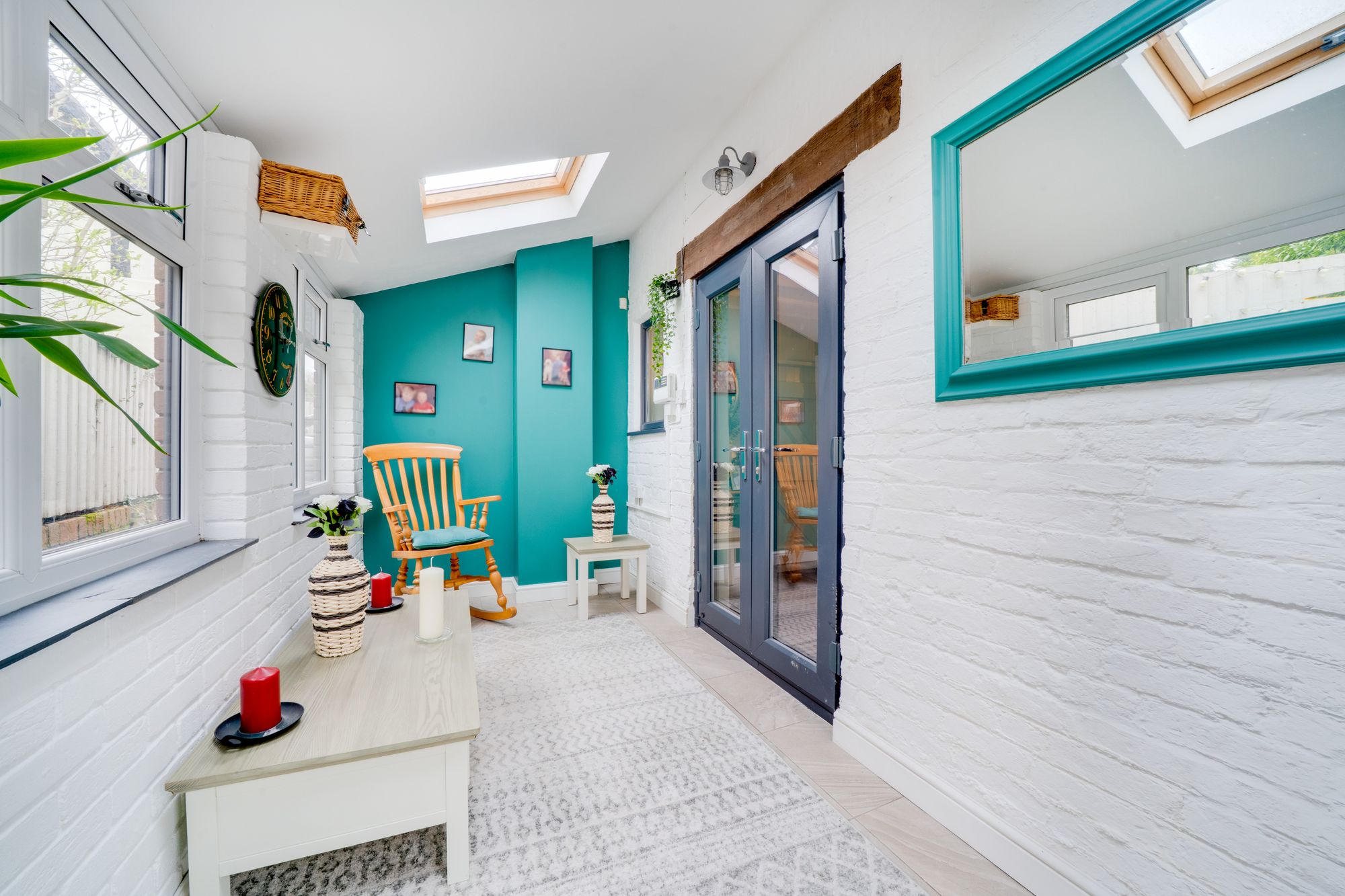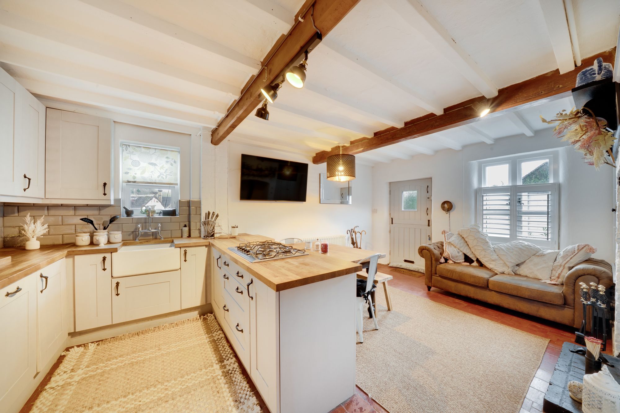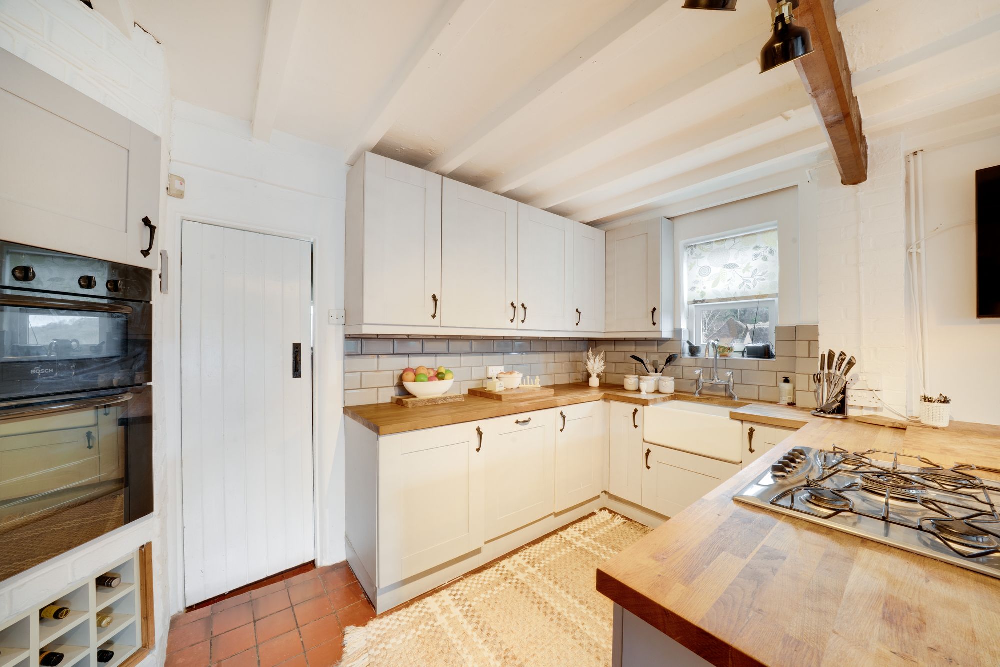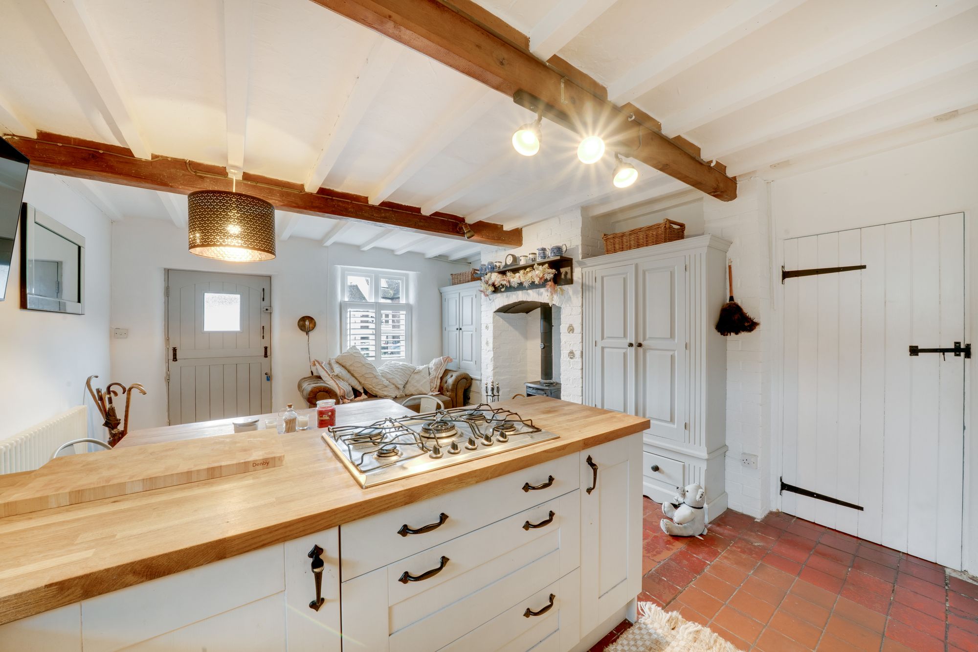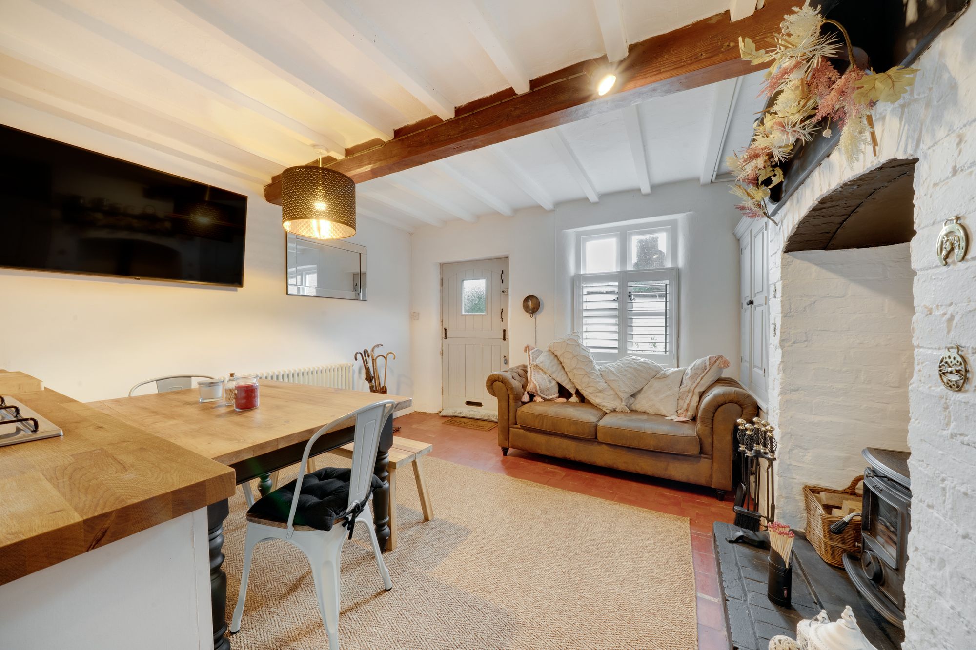 Internally, the property has been thoughtfully arranged to create a warm and inviting home. The dining kitchen forms the heart of the house, a stylish and sociable space, perfectly suited to both everyday living and entertaining. From here, the accommodation flows naturally into the living room, where a wood-burning stove creates a cosy focal point, enhancing the character and comfort of the space. A delightful garden room provides additional versatility, offering a light-filled area ideal for relaxing or enjoying views of the outside terrace, while a separate utility room adds a practical element to the ground floor layout.