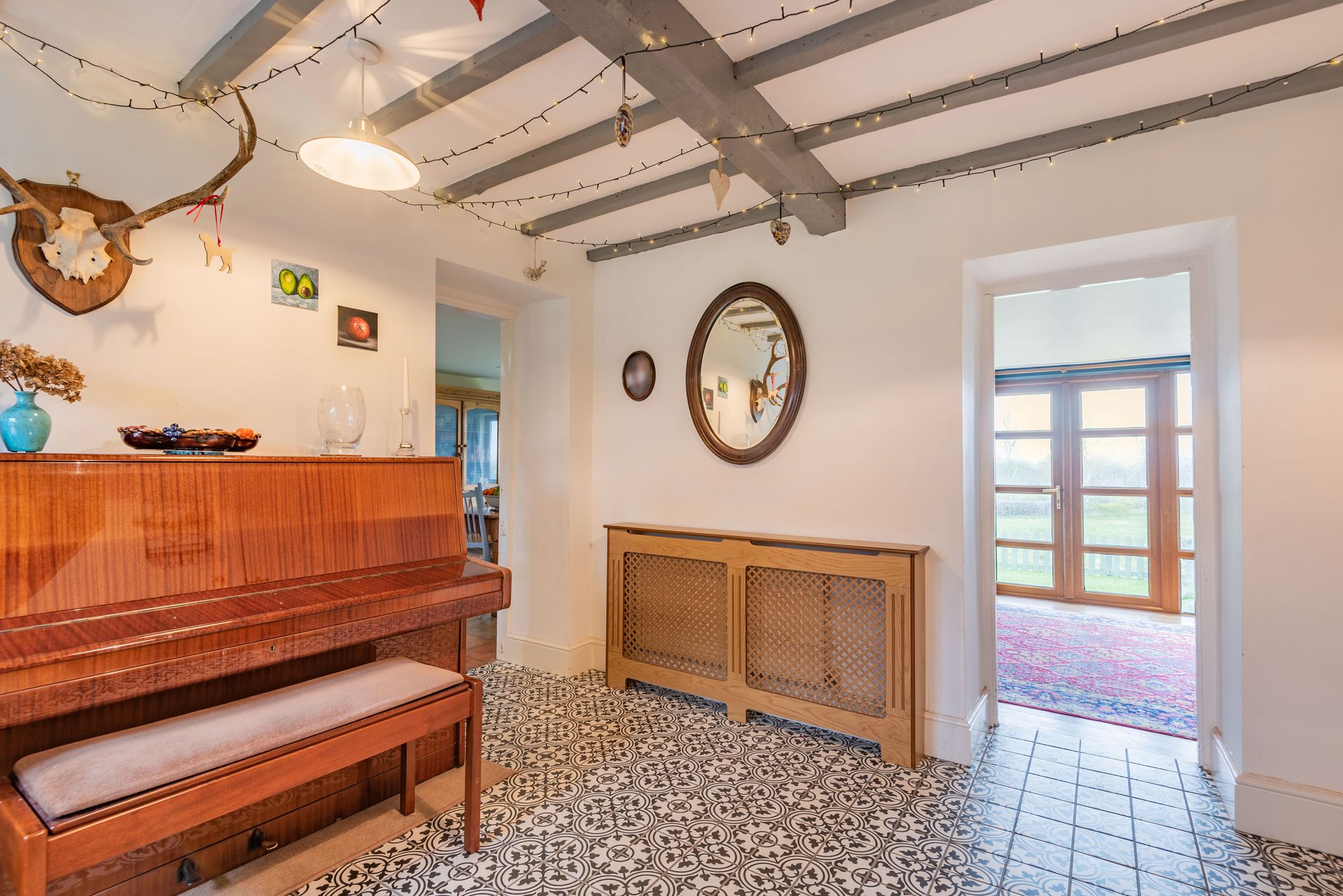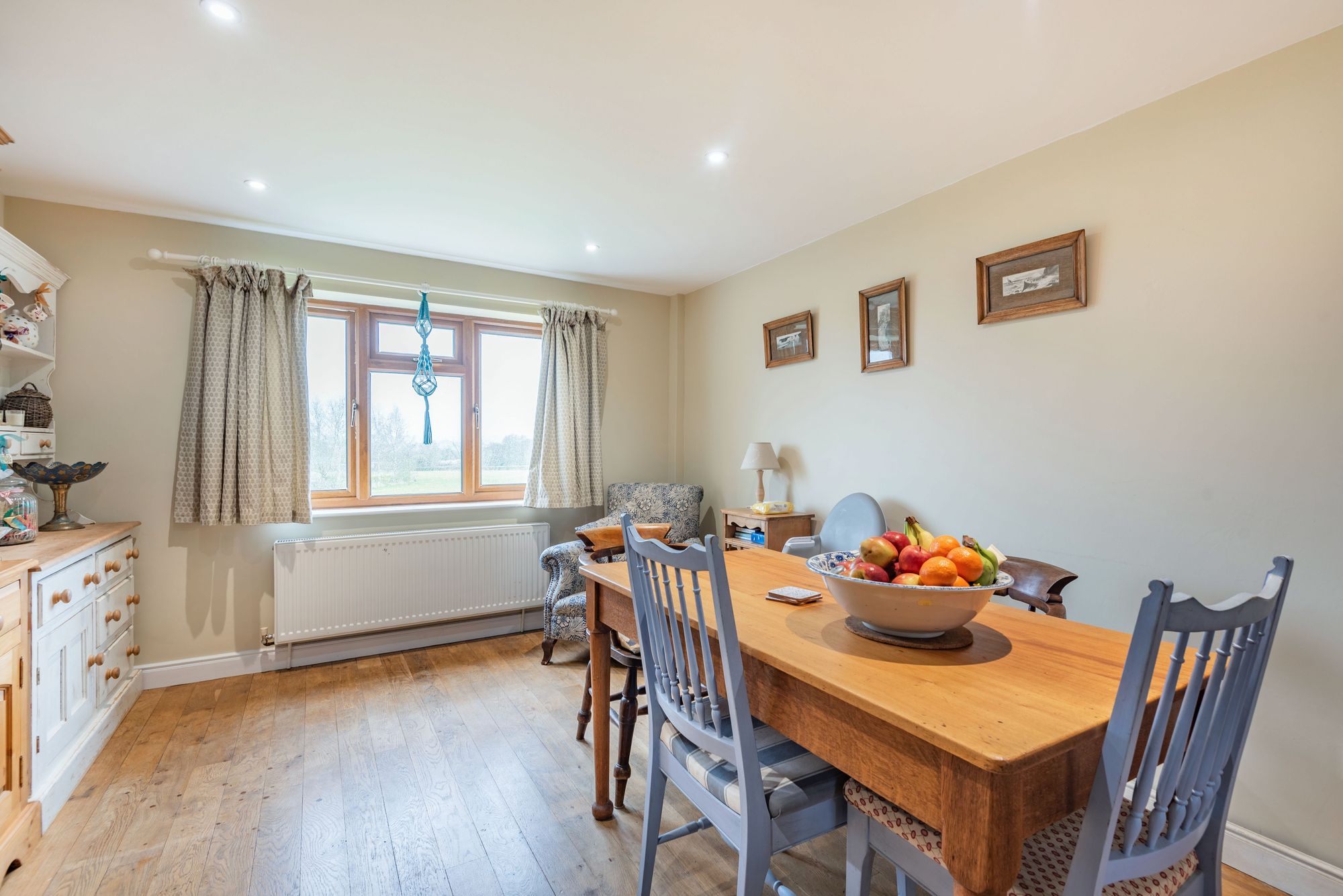 The cosy, snug style lounge offers a multi fuel burner with fire place surround, wood flooring and French doors leading out to the rear garden with delightful rural backdrop.