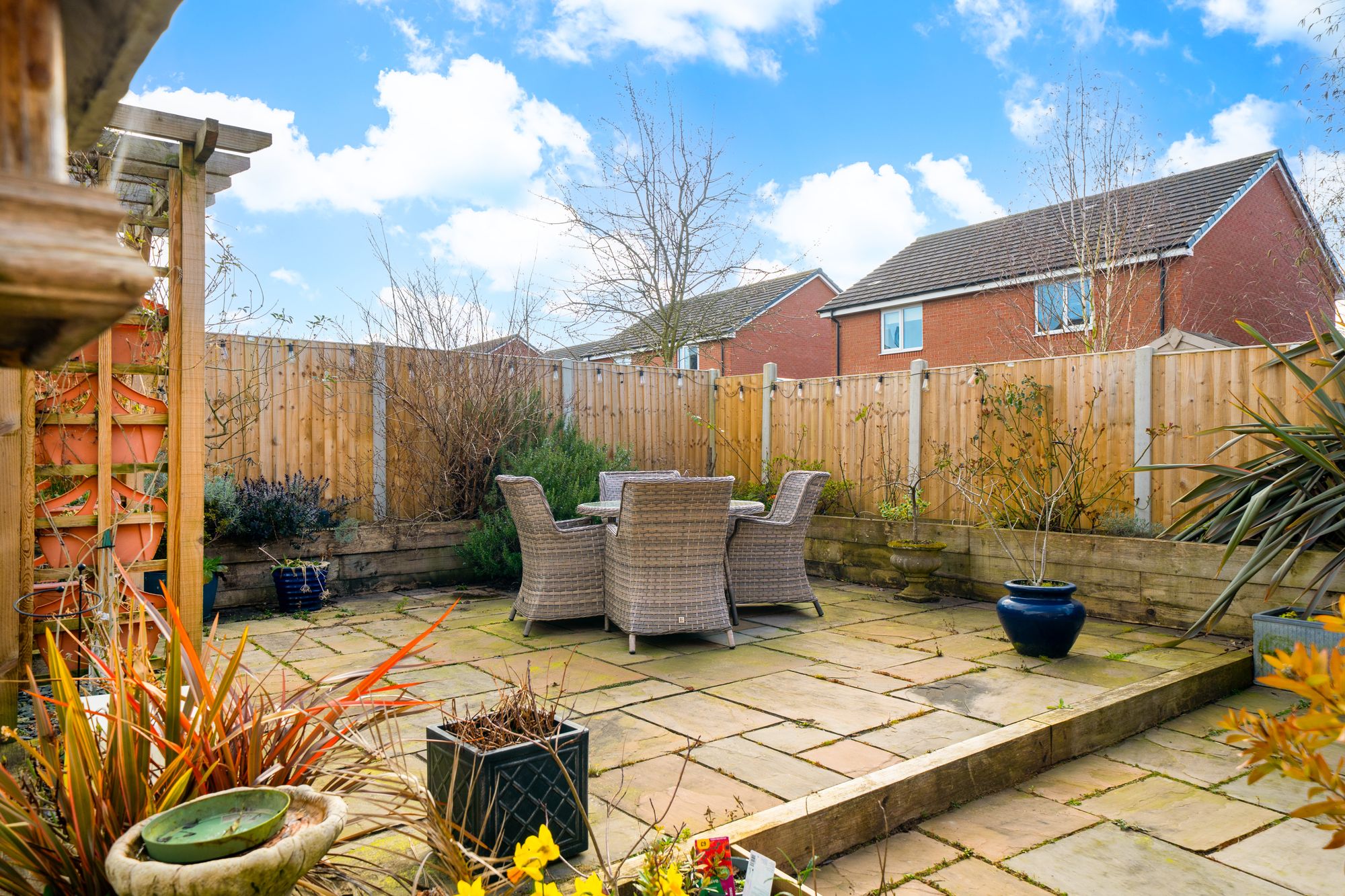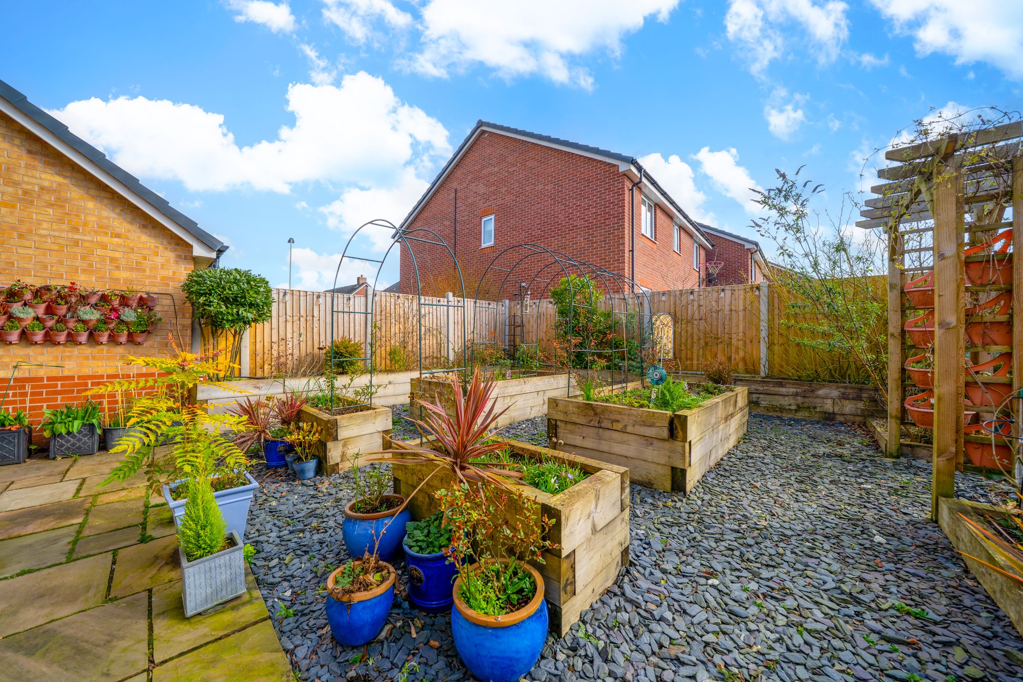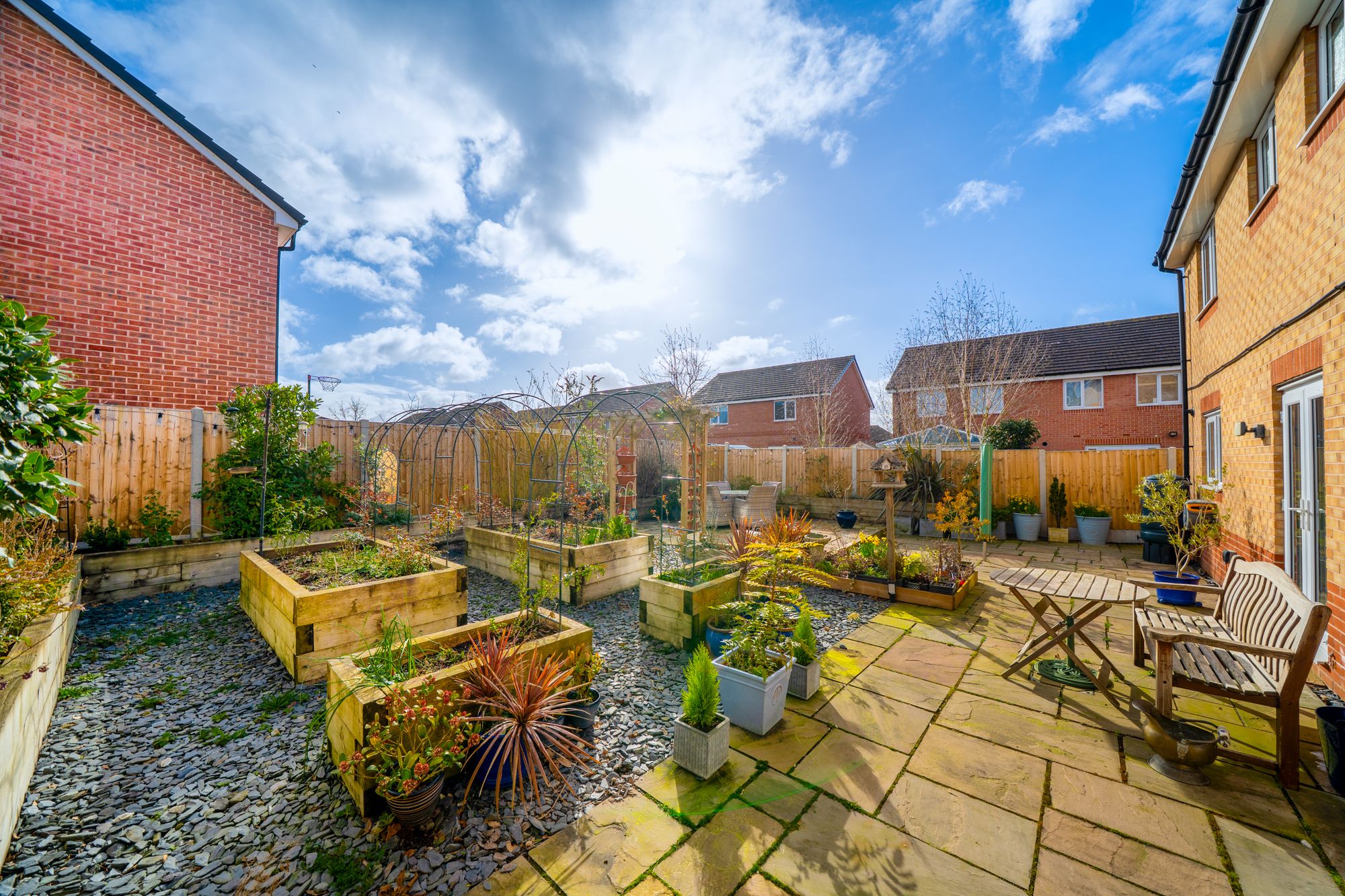 Outside, the rear garden has been designed with low maintenance in mind and is mainly paved with gravel areas, creating an attractive and easy-to-manage outdoor space ideal for relaxing or outdoor dining.