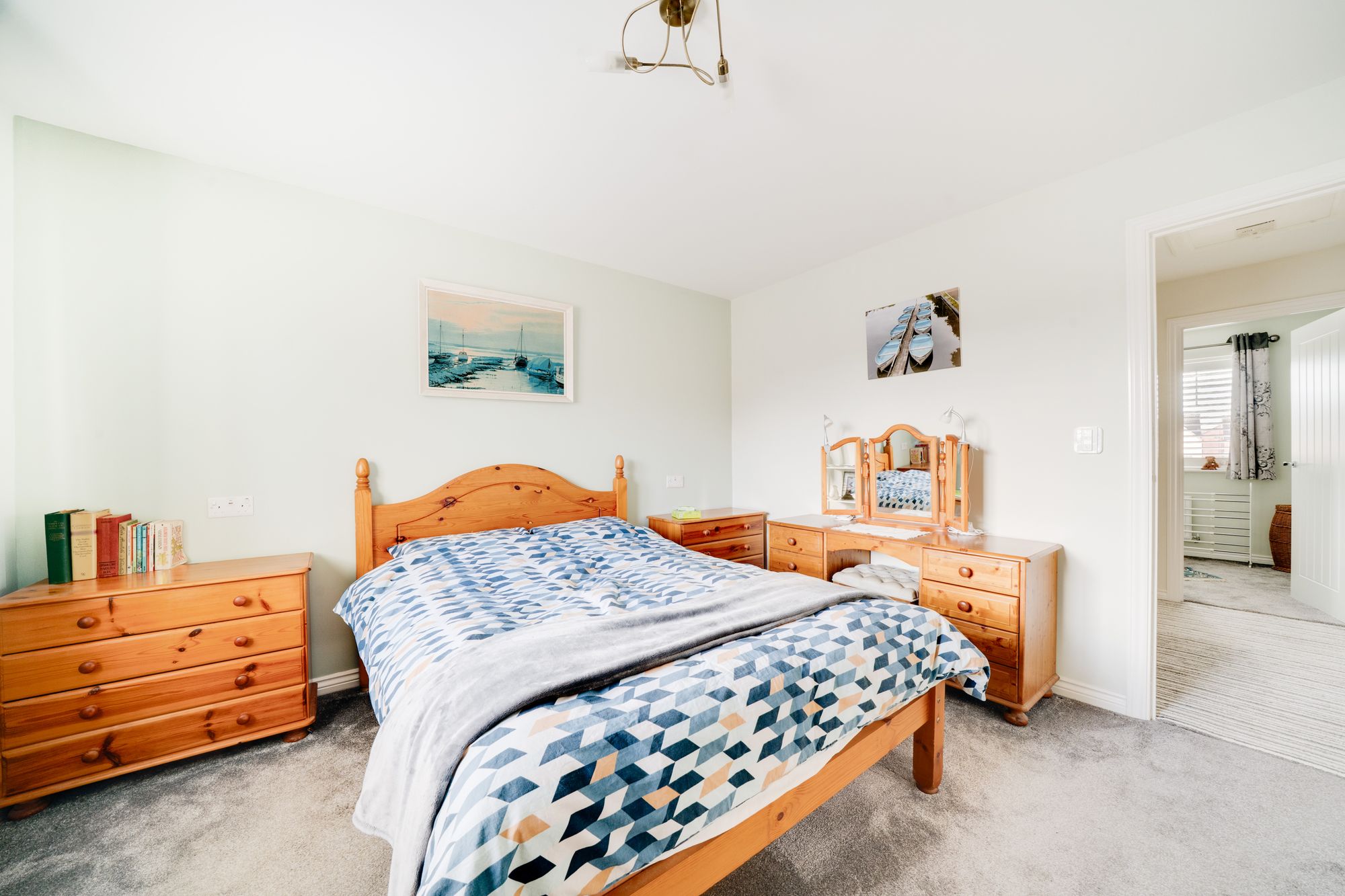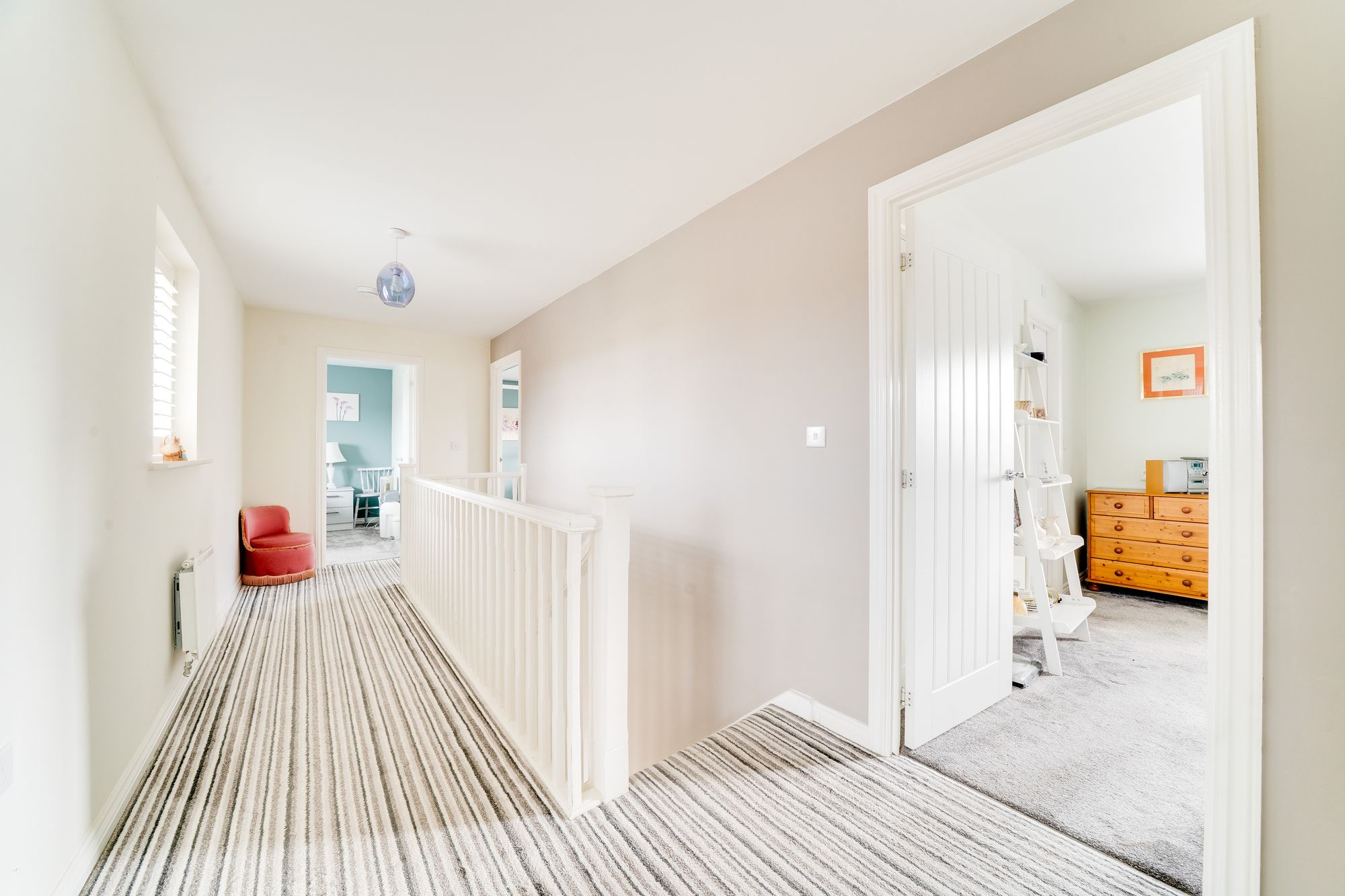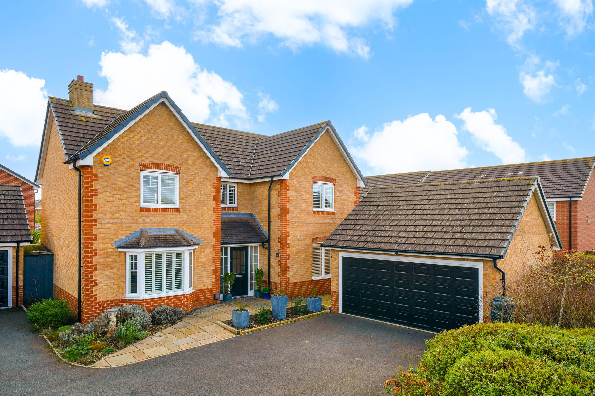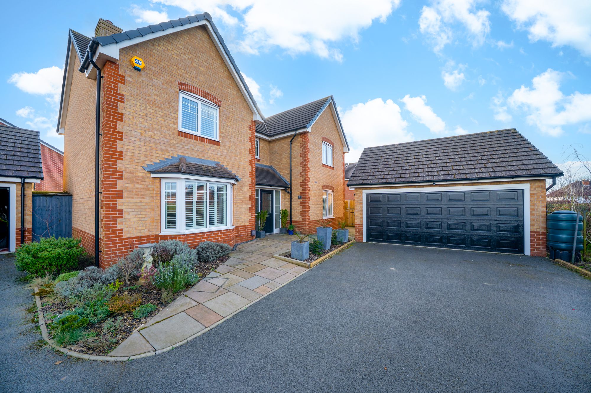 Upstairs, the first floor offers four well-proportioned bedrooms arranged around a central landing. The principal bedroom benefits from its own private en-suite, while a second bedroom also enjoys en-suite facilities. Two further bedrooms are served by a modern family bathroom, making the layout particularly well suited for family living or visiting guests.
