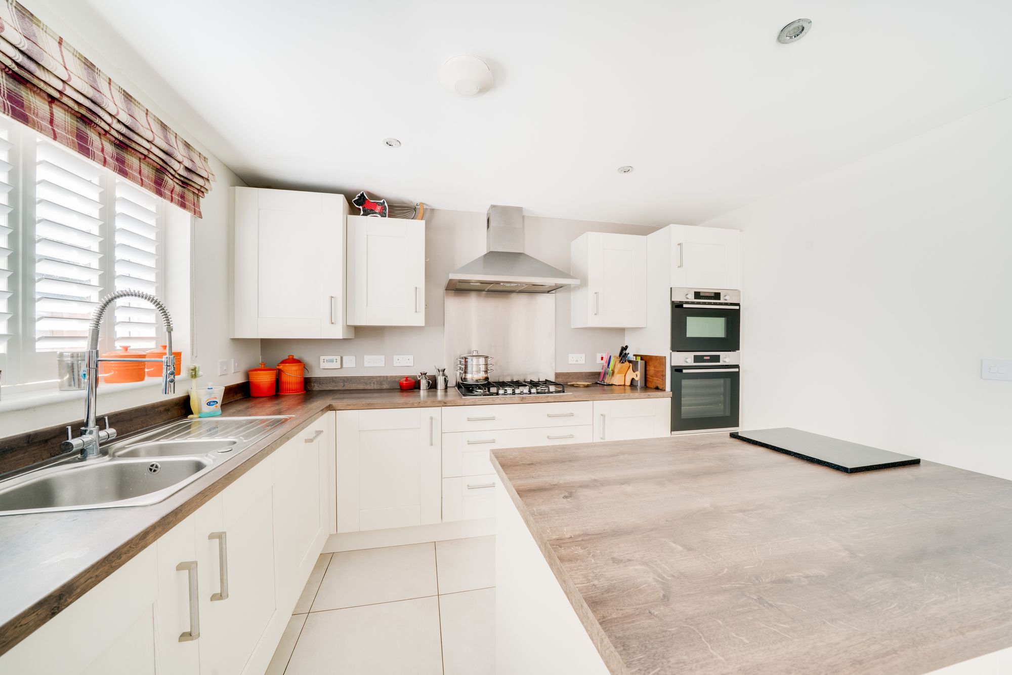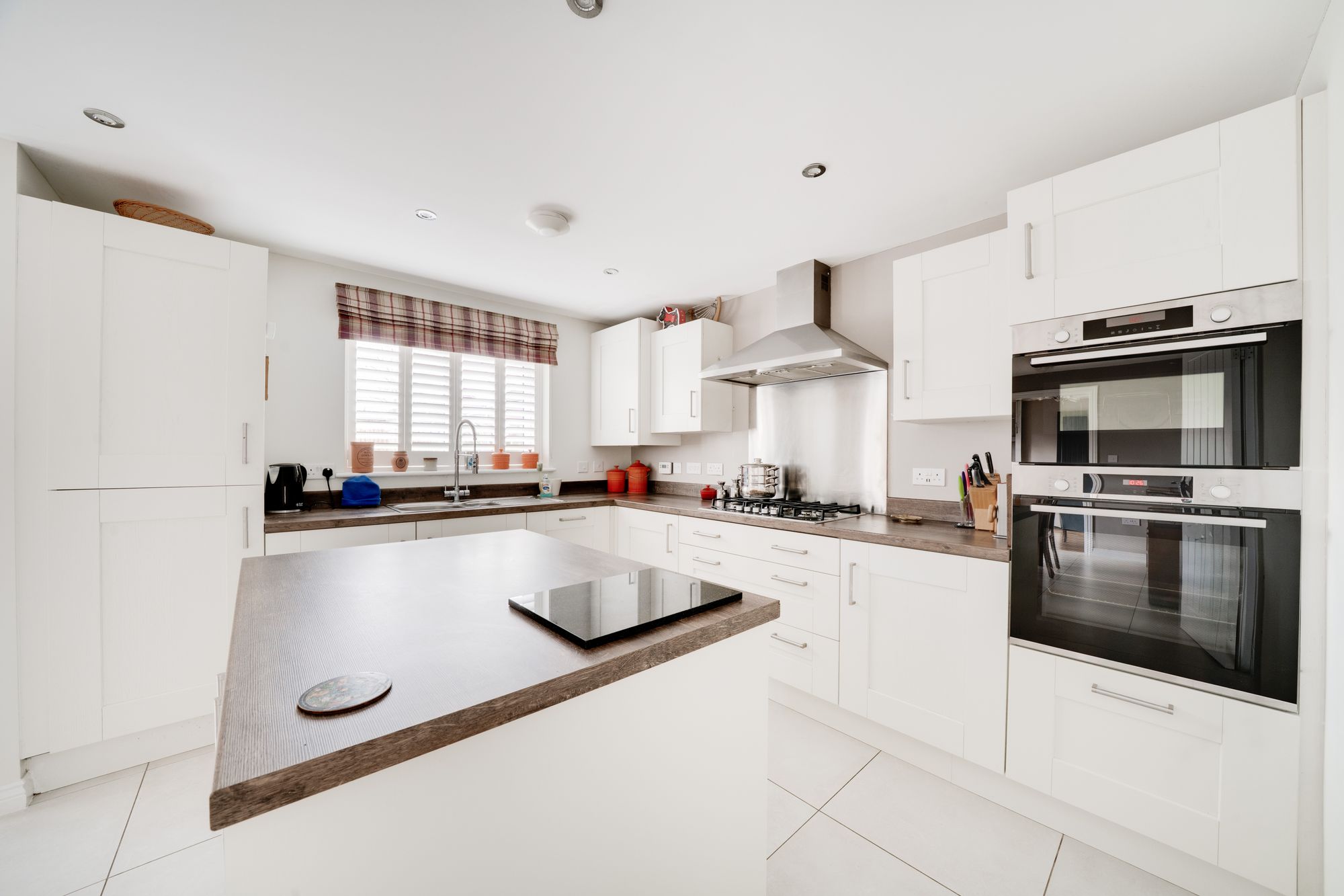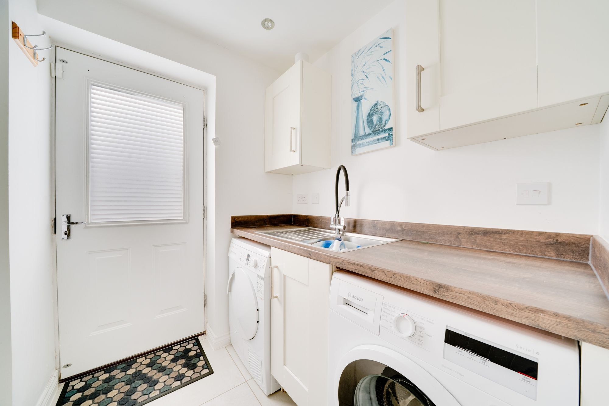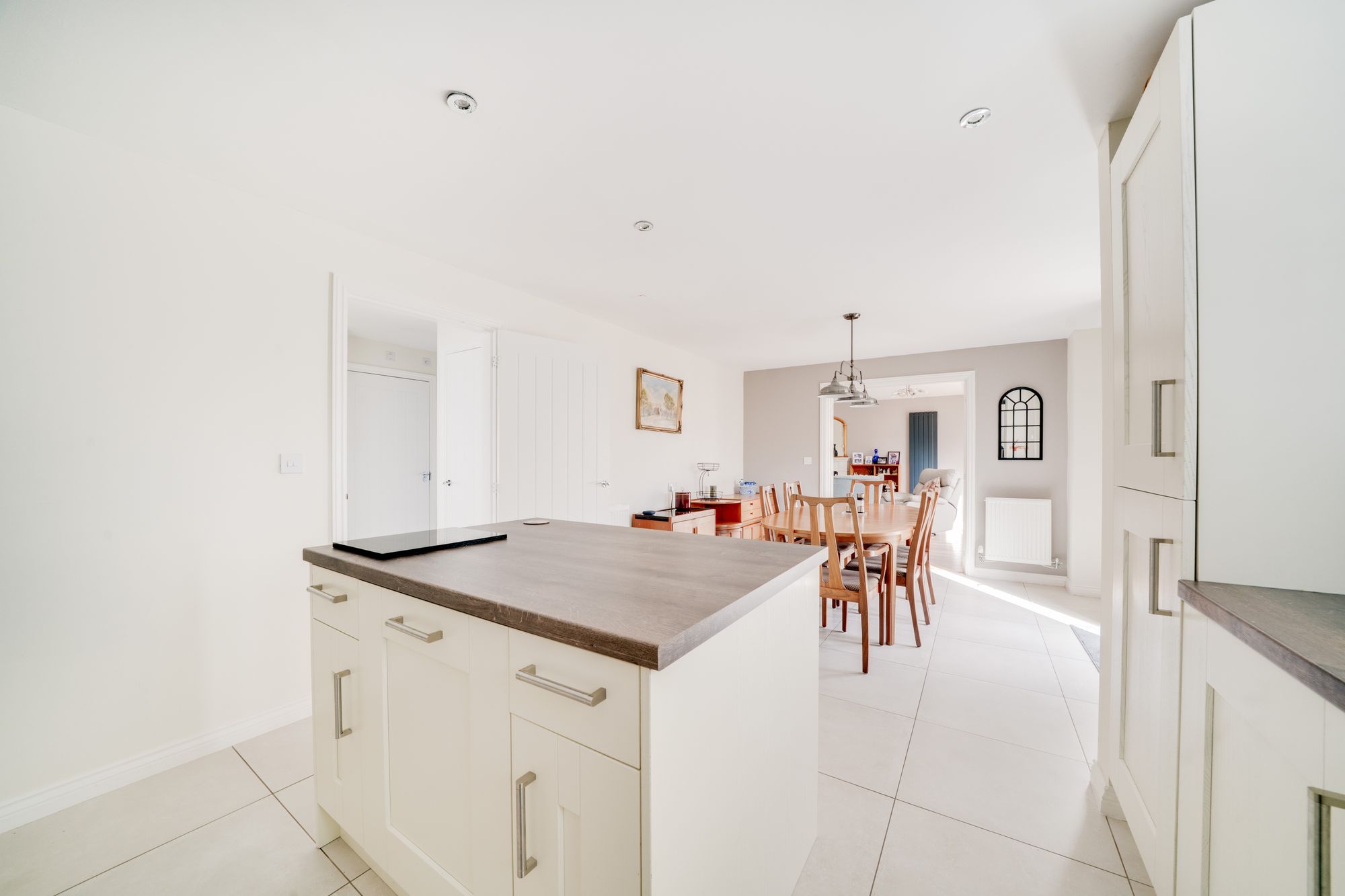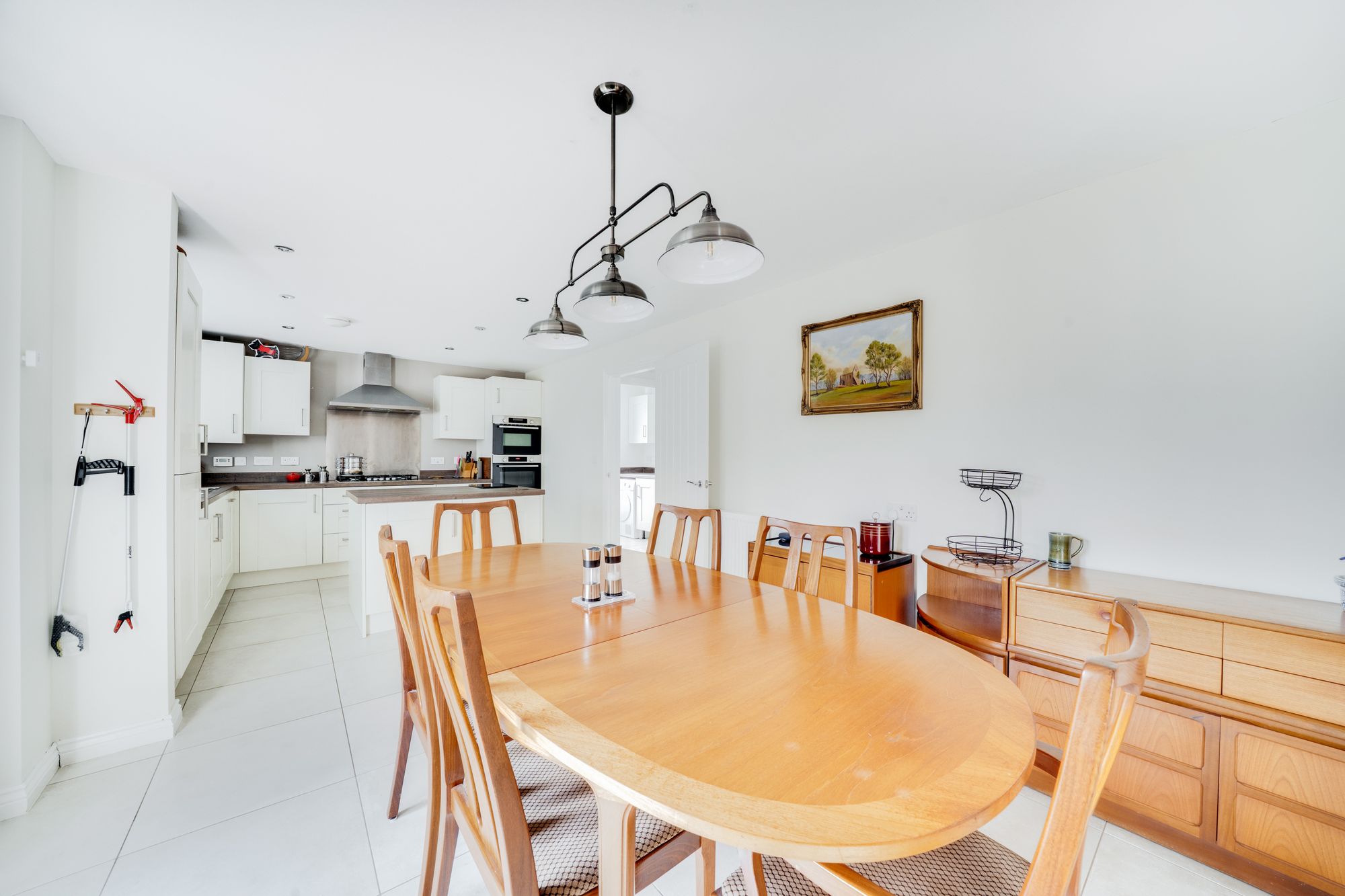 At the heart of the home is a stylish and fully integrated kitchen and dining area. This modern kitchen/diner is thoughtfully designed with contemporary cabinetry and integrated appliances, offering a sociable and practical space for everyday family life as well as hosting guests. A separate utility room provides additional storage and laundry space, helping to keep the main kitchen area uncluttered.