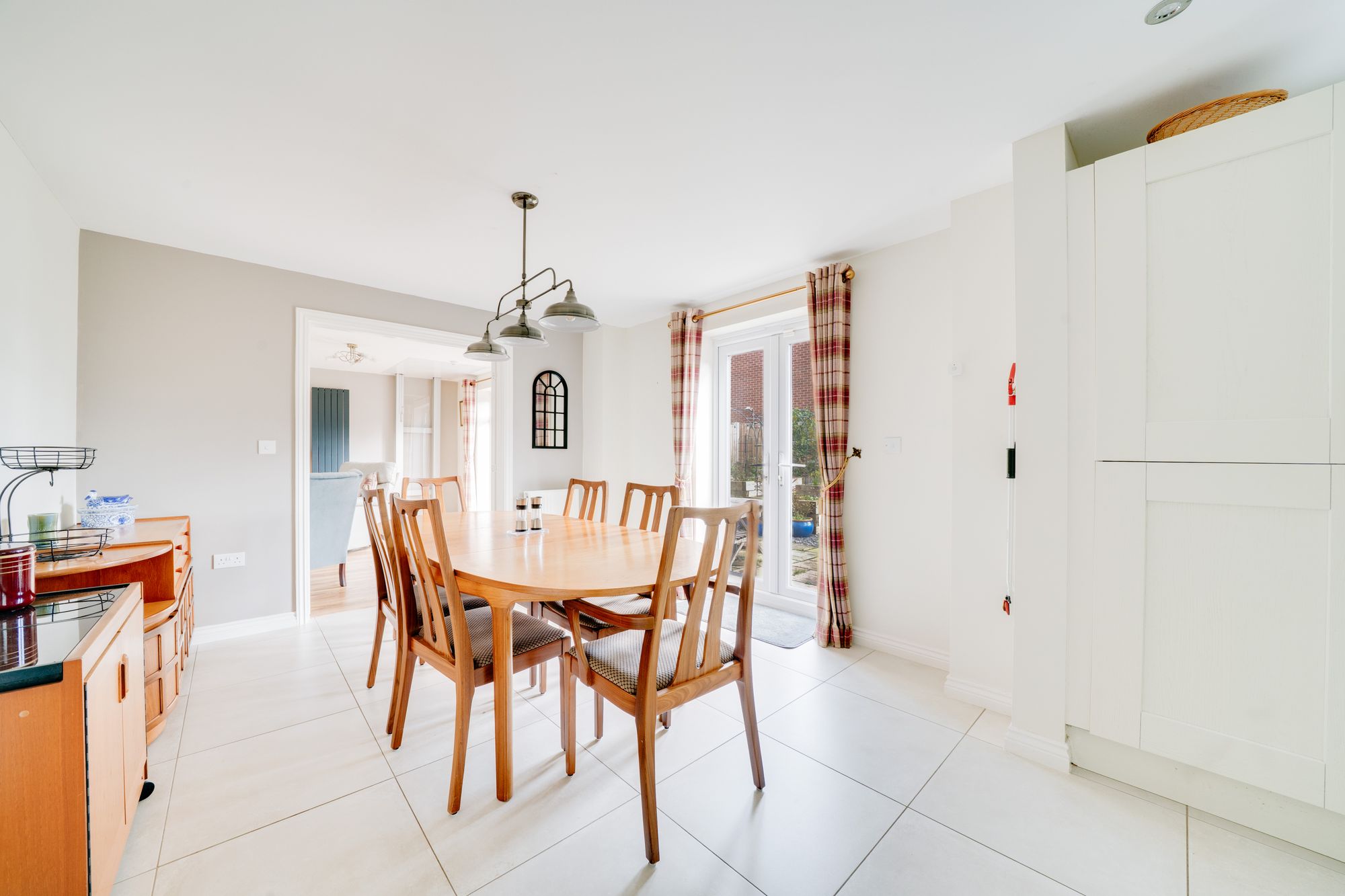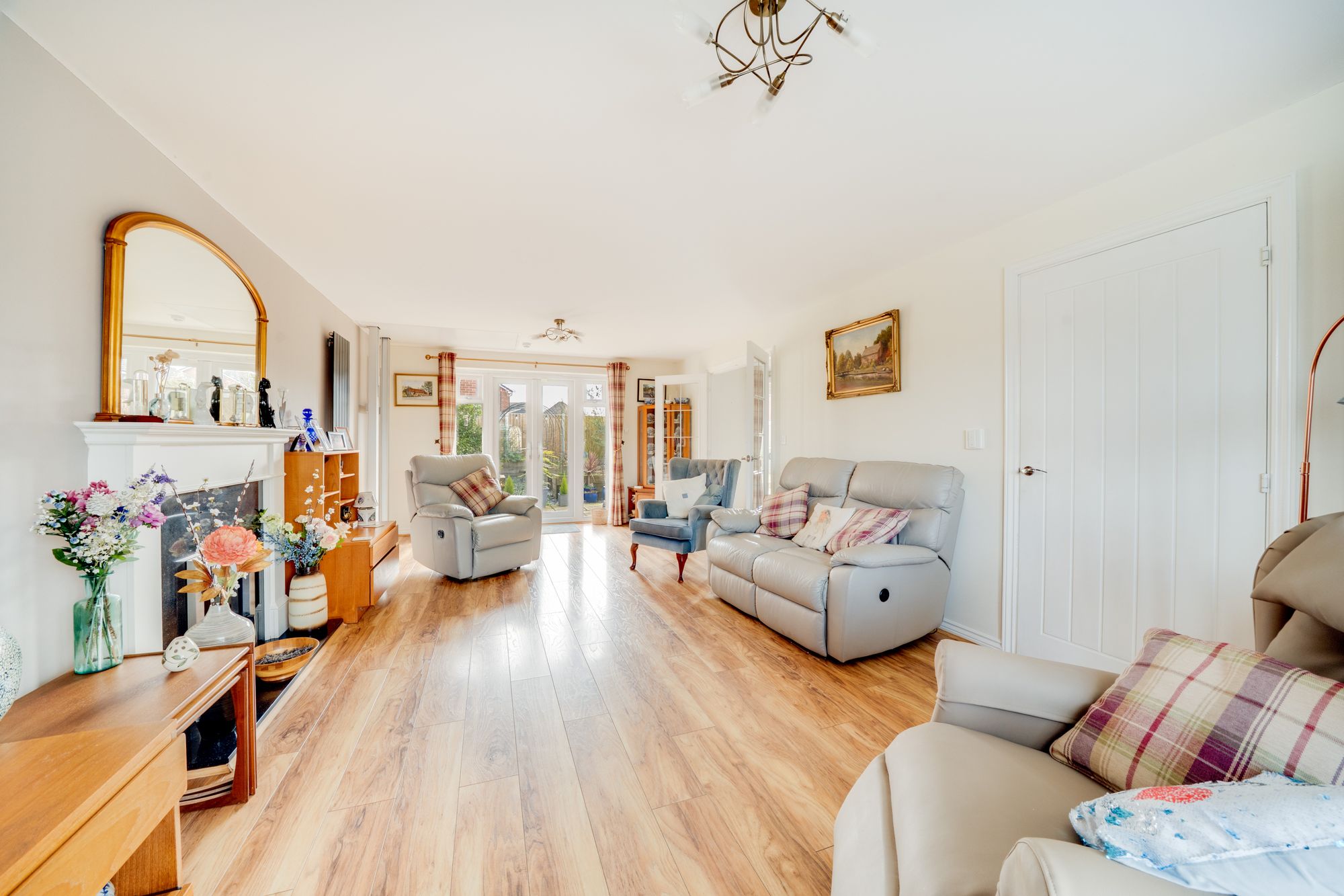The living room is a particularly impressive feature of the home, spanning the full width of the property and enjoying an abundance of natural light. Doors open directly onto the rear garden, creating a seamless connection between indoor and outdoor living and making it an ideal space for both relaxing and entertaining.