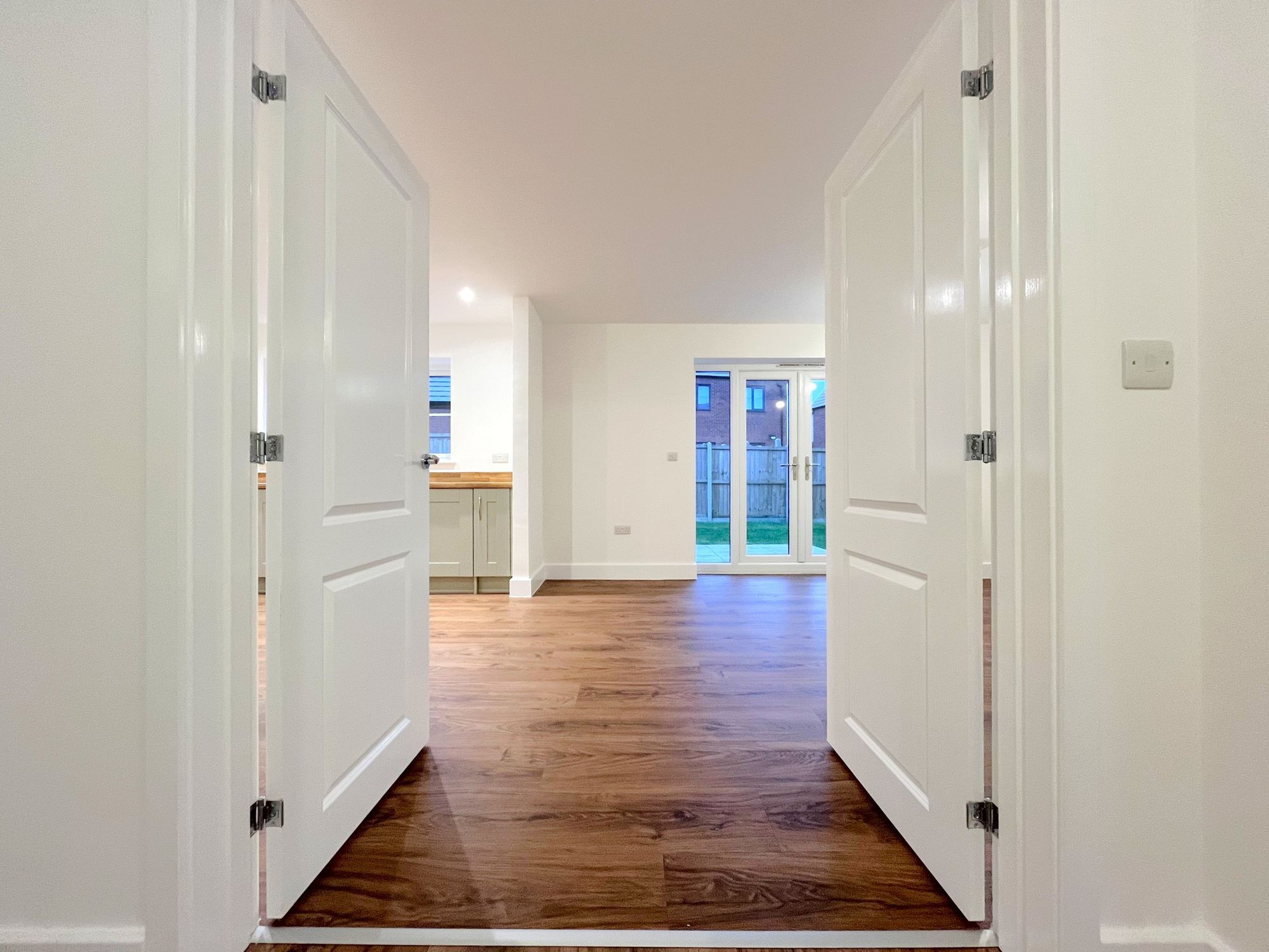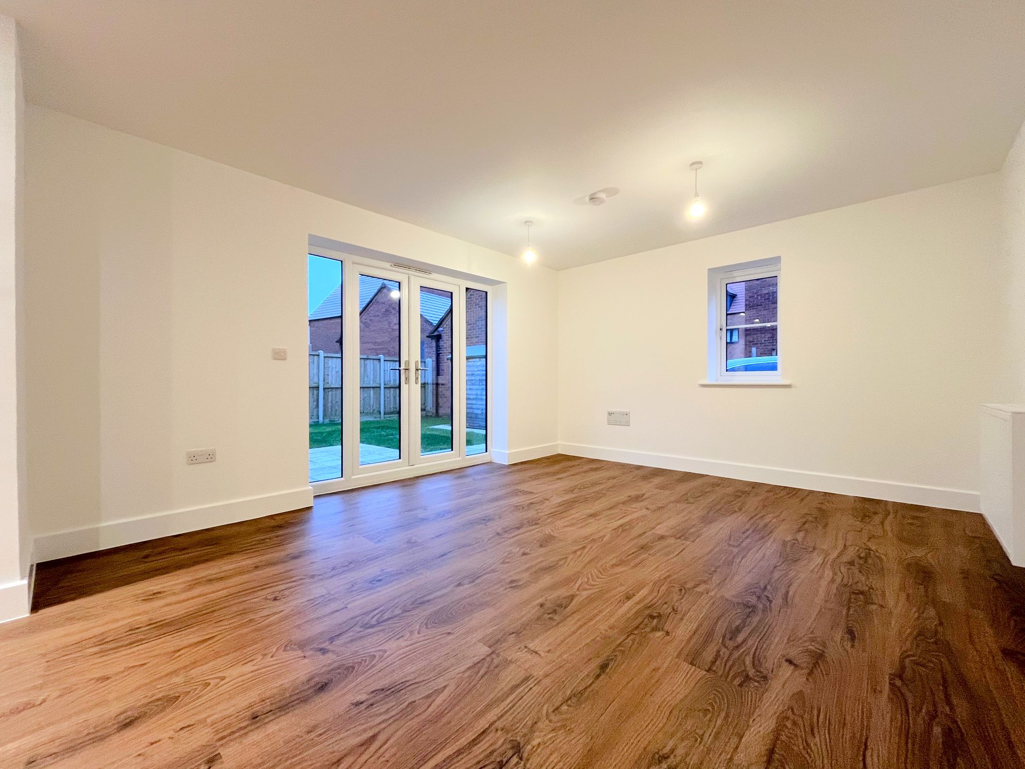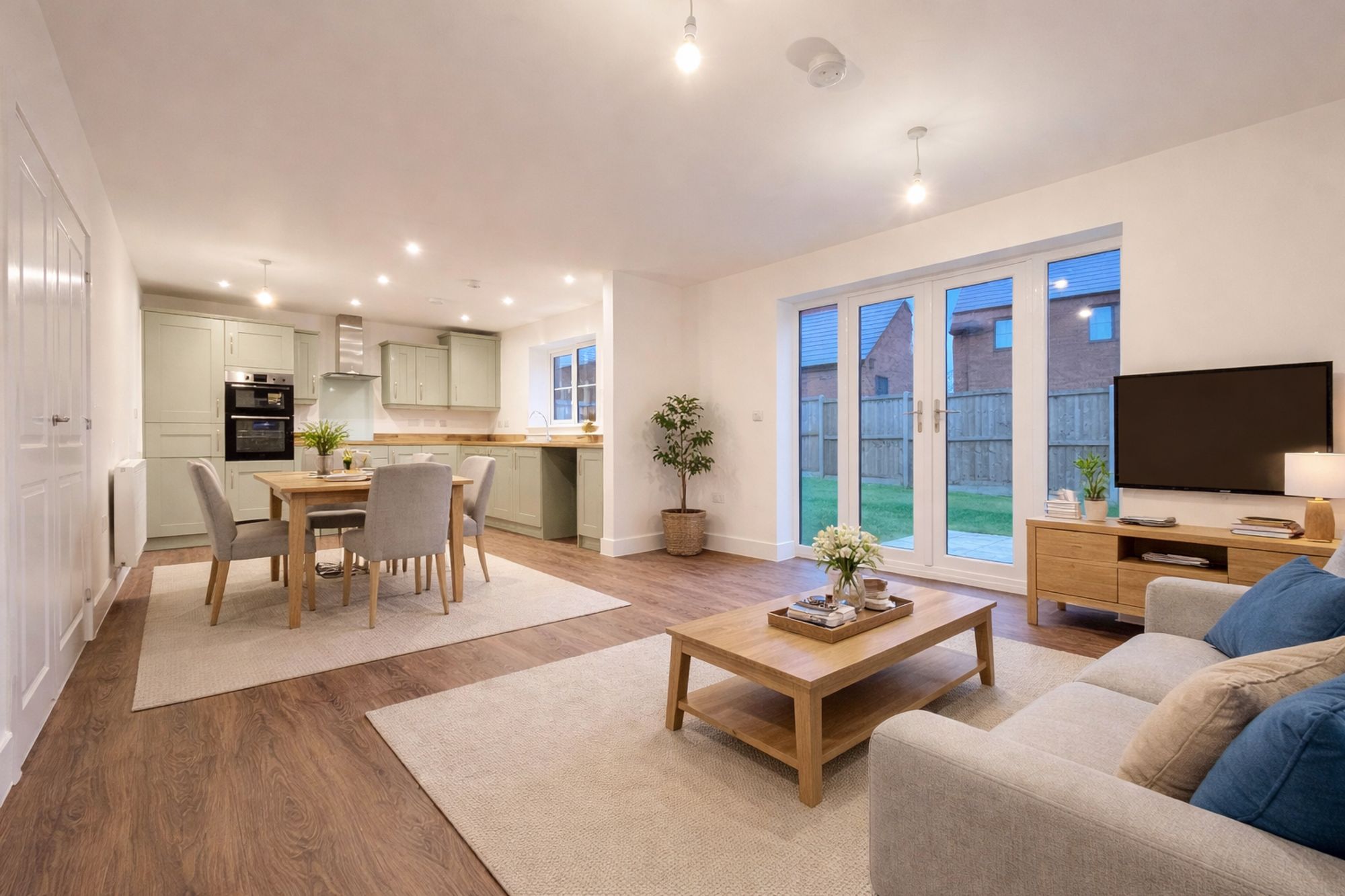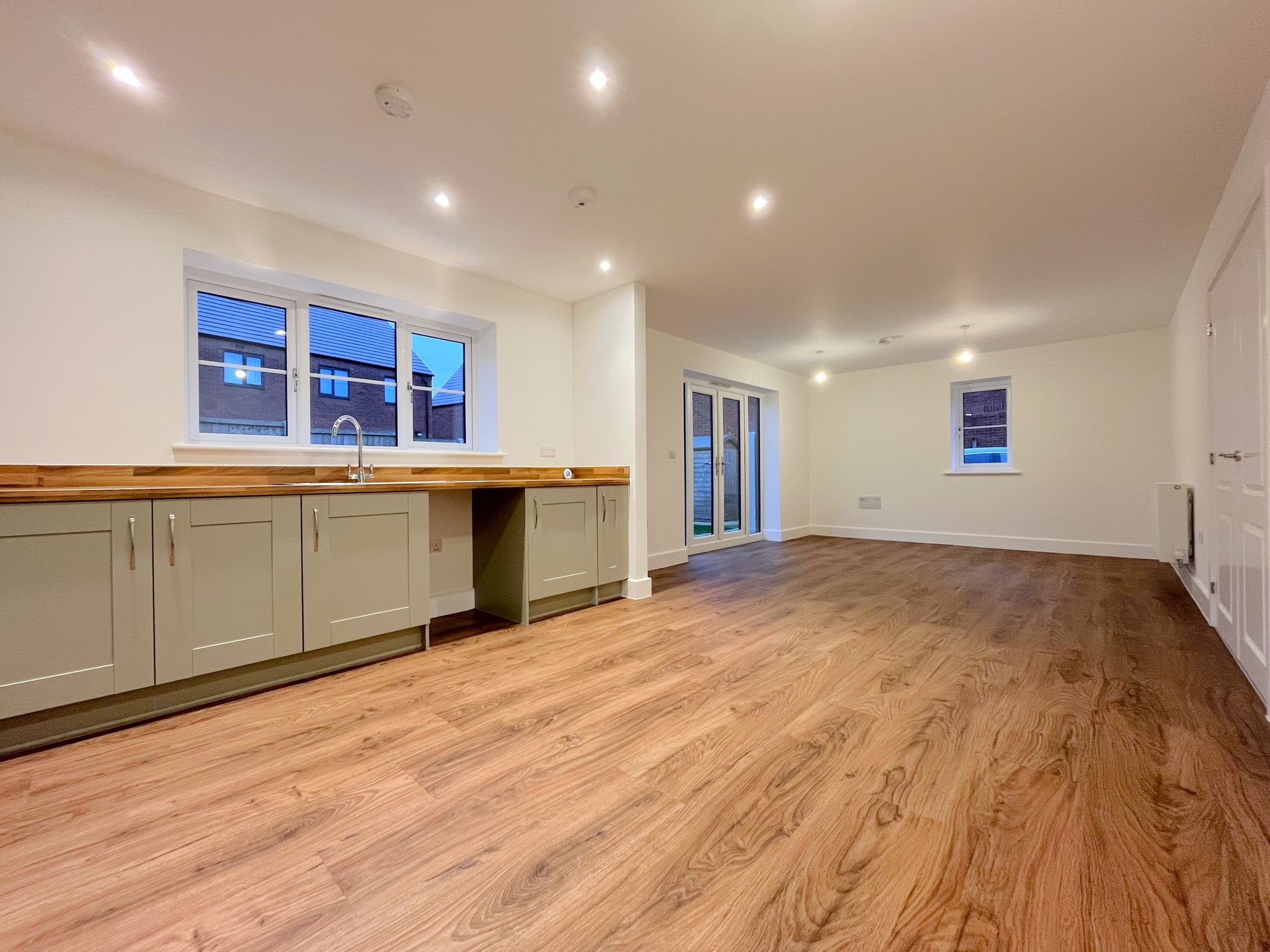 Following the hallway through the property, there is a family bathroom and storage cupboard on the left, then double-doors leading to the open-plan living room and kitchen/dining room. This room offers plenty of space for you to enjoy, from preparing a family meal to taking some time to relax.