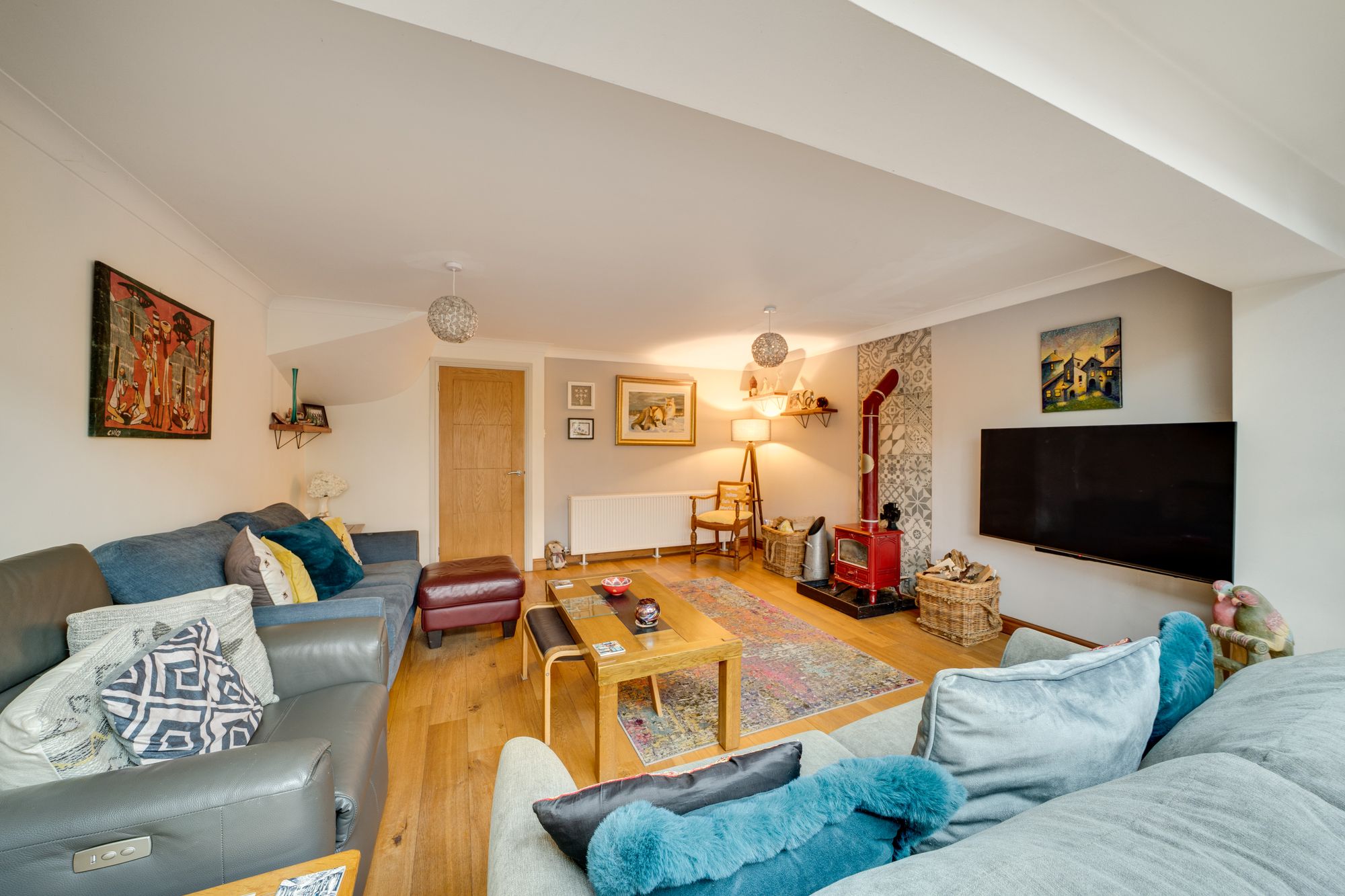 To the rear, the lounge is a generous and inviting living space, finished with wood flooring and centred around a freestanding wood-burning stove set against a tiled feature backdrop. The property benefits from full central heating powered by an energy-efficient air source heat pump, ensuring comfortable and economical year-round warmth. The room comfortably accommodates both seating and occasional furniture and opens seamlessly into the conservatory, creating an excellent space for everyday living and entertaining.