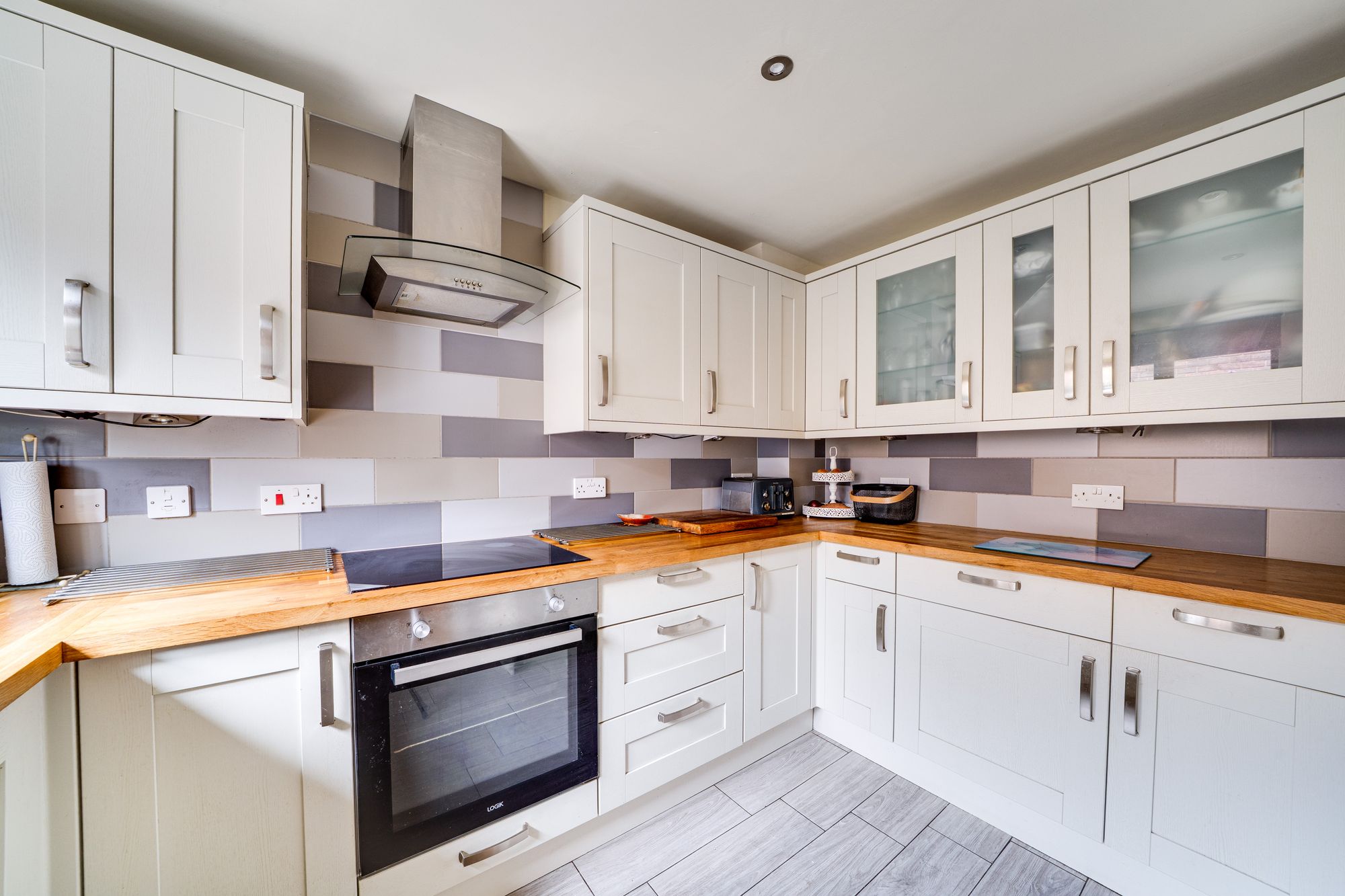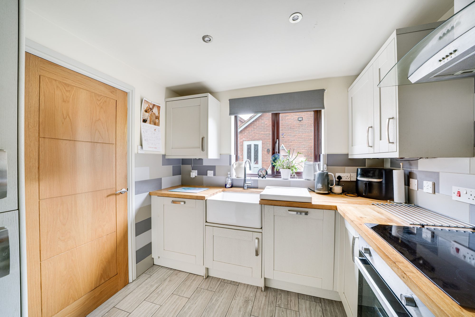 The kitchen has been fitted with a contemporary range of wall and base units with solid wood work surfaces and tiled flooring. Integrated appliances include an electric oven and hob with extractor above, dishwasher, washing machine and fridge-freezer, complemented by a Belfast-style sink. A window overlooks the front elevation, providing good natural light and creating a bright and practical working environment.