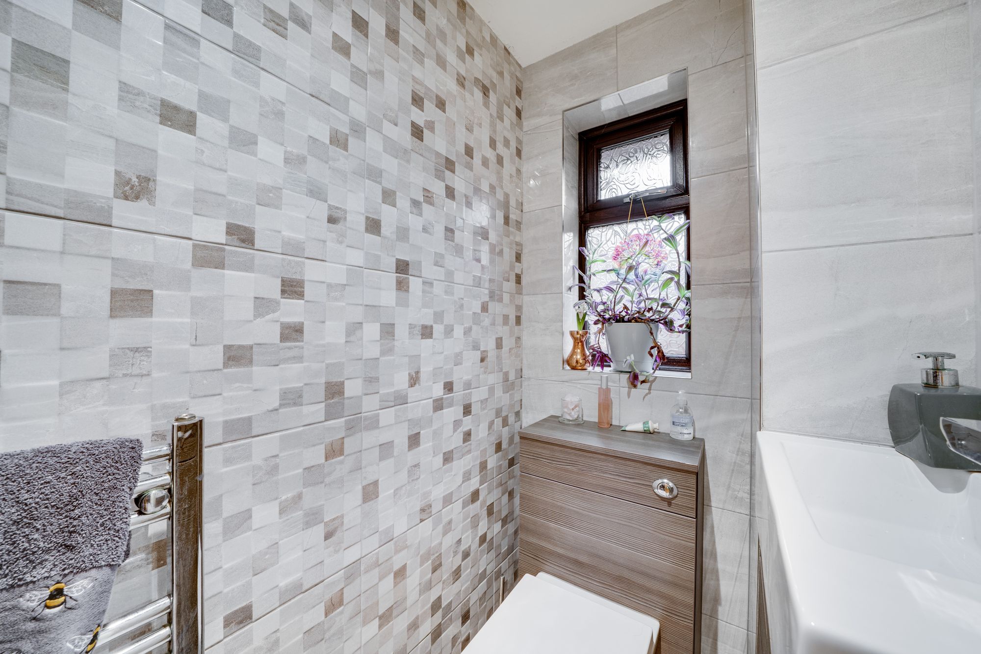 The bathroom has been modernised and stylishly refitted, featuring a contemporary walk-in shower enclosure, vanity unit with inset wash basin, low-level WC and a heated towel rail. The room is finished with complementary wall tiling and benefits from a window providing natural light and ventilation.