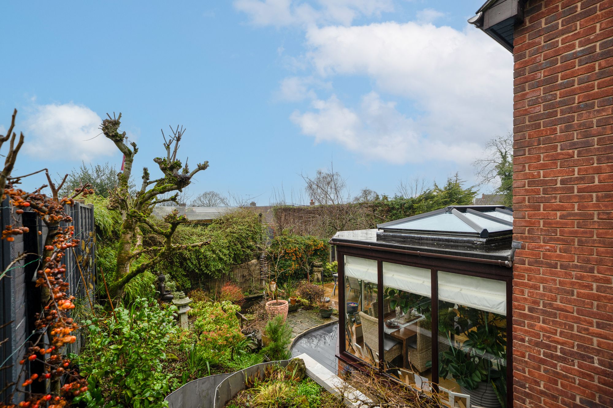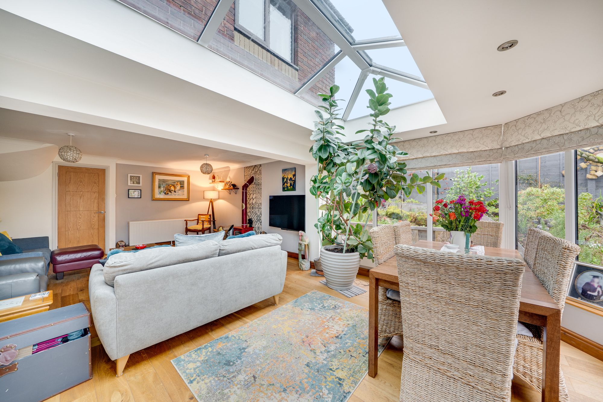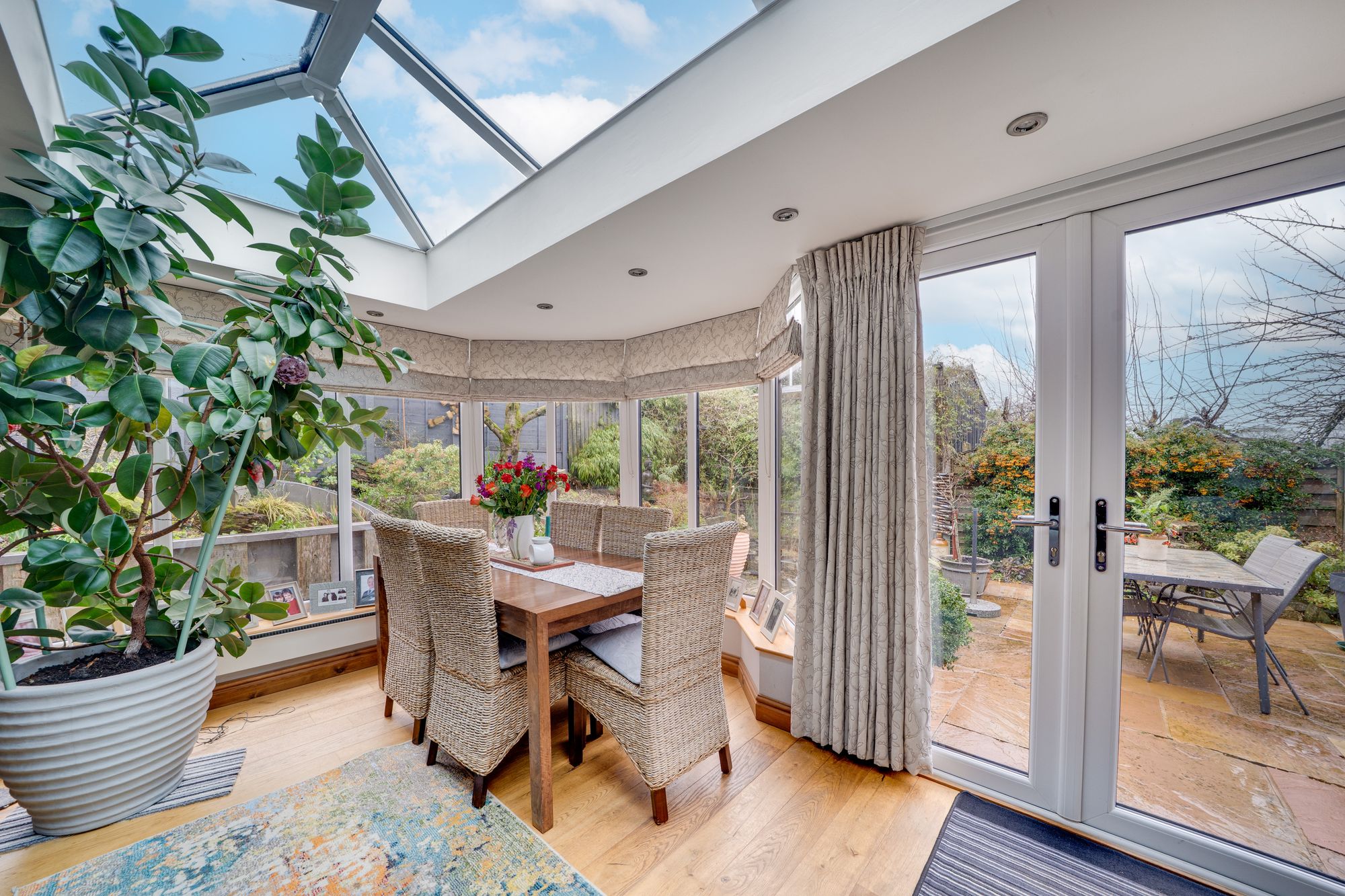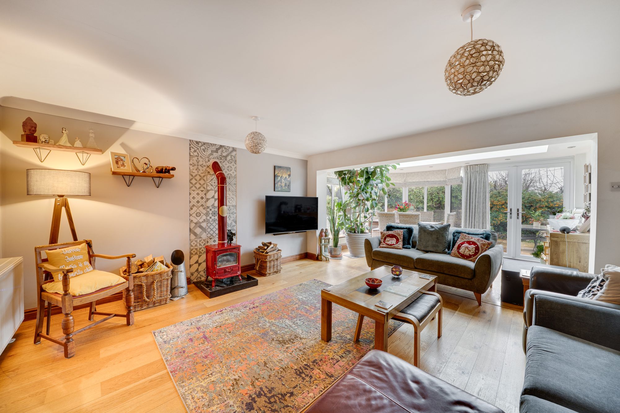 The conservatory is a particular highlight, enjoying a glazed roof, recessed lighting and full-height glazing to the garden. Currently arranged as a dining space, it benefits from French doors opening directly onto the patio, allowing for easy indoor–outdoor living throughout the year.