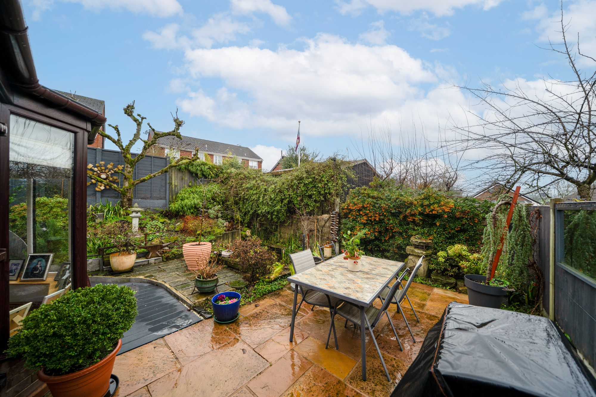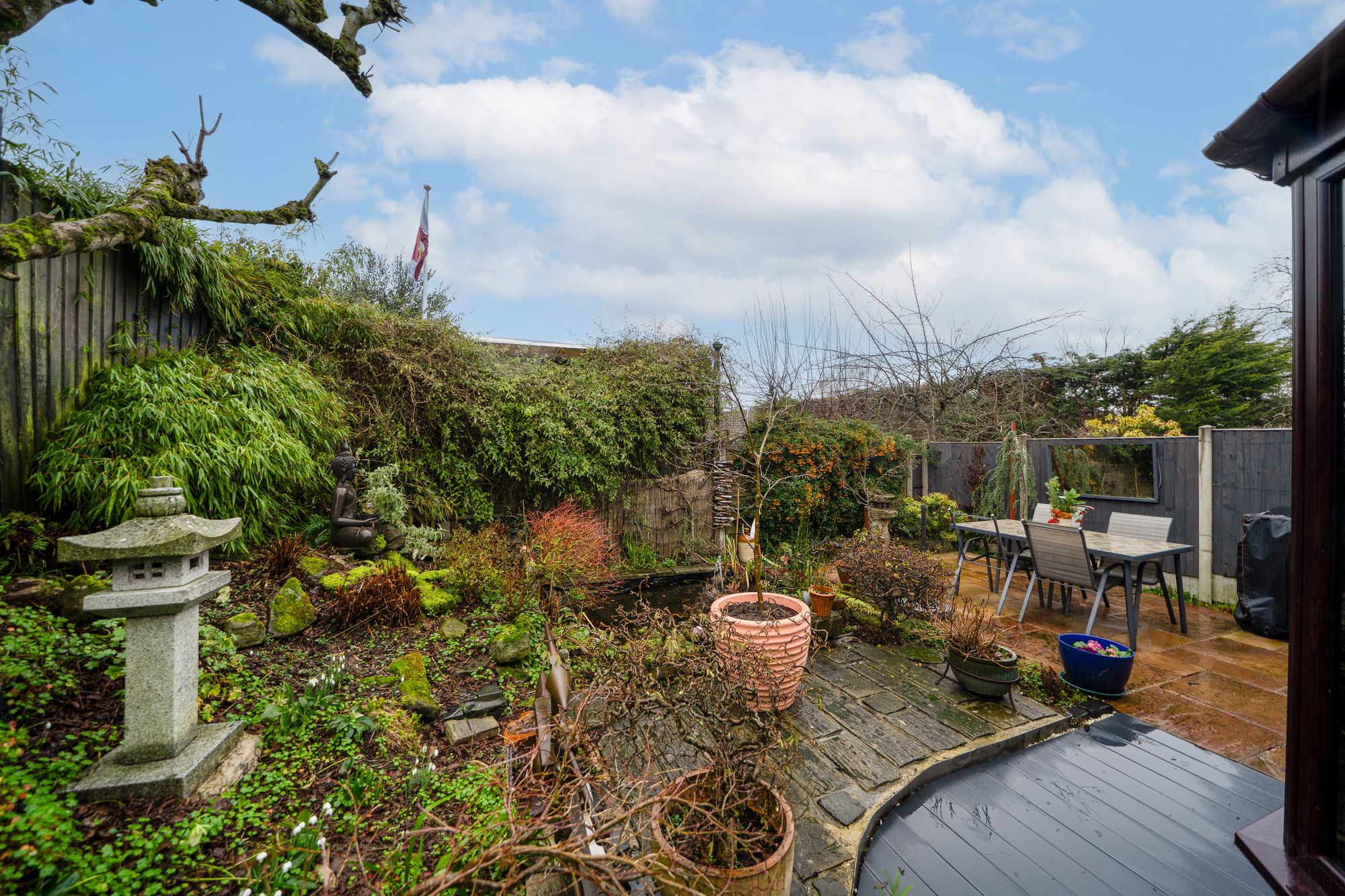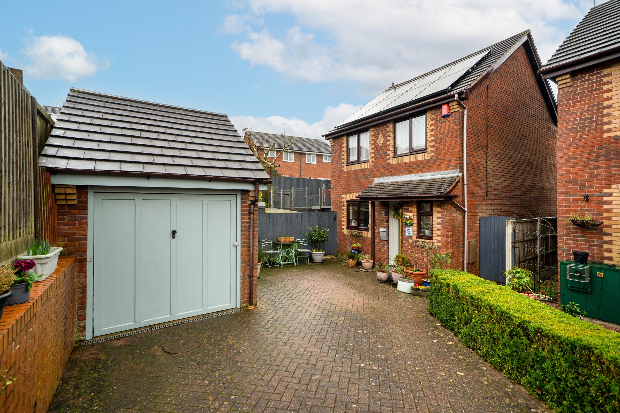 To the front, a block-paved driveway provides off-road parking and leads to a detached pitched-roof garage, offering power, lighting and useful roof storage. Gated side access leads to the rear. The rear garden has been carefully landscaped to create a series of private and inviting areas, including paved seating spaces, raised beds, mature planting and a decorative water feature. The garden is well enclosed, enjoys a good degree of privacy and provides an attractive setting for relaxation and entertaining.