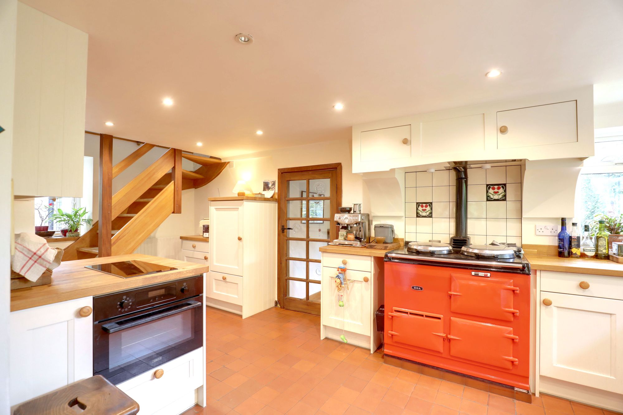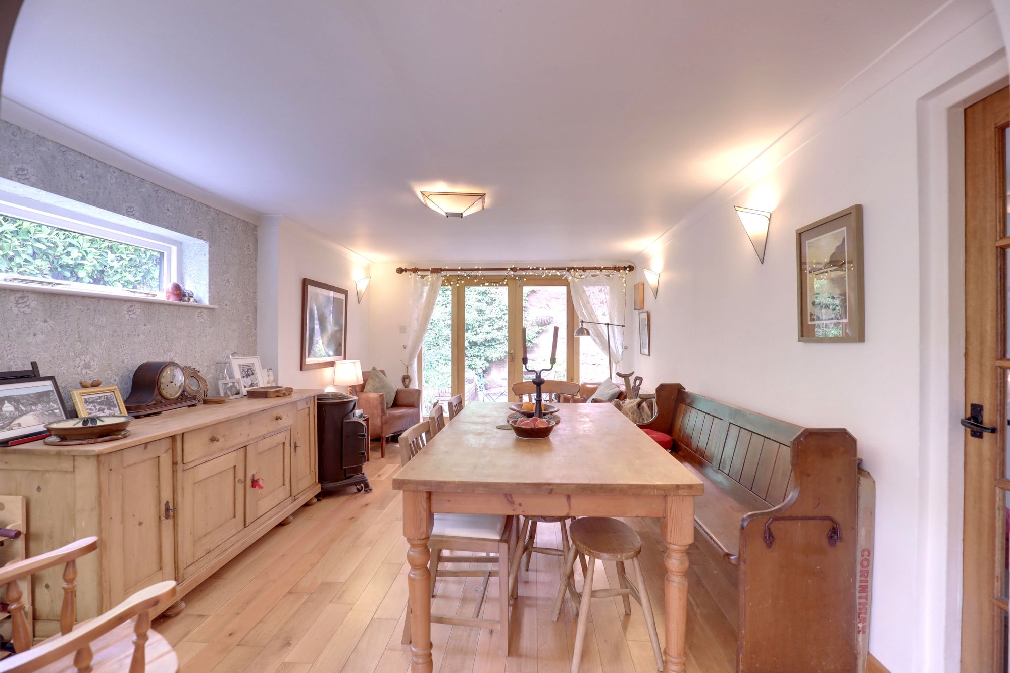 The well appointed kitchen features a range of fitted wall and base units, along with oil fired aga fitted and an electric hob and oven. Open access to the rear of the kitchen leads into the generously proportioned dining room fitted with French doors leading into the back patio area. Just off is a utility room and downstairs WC.