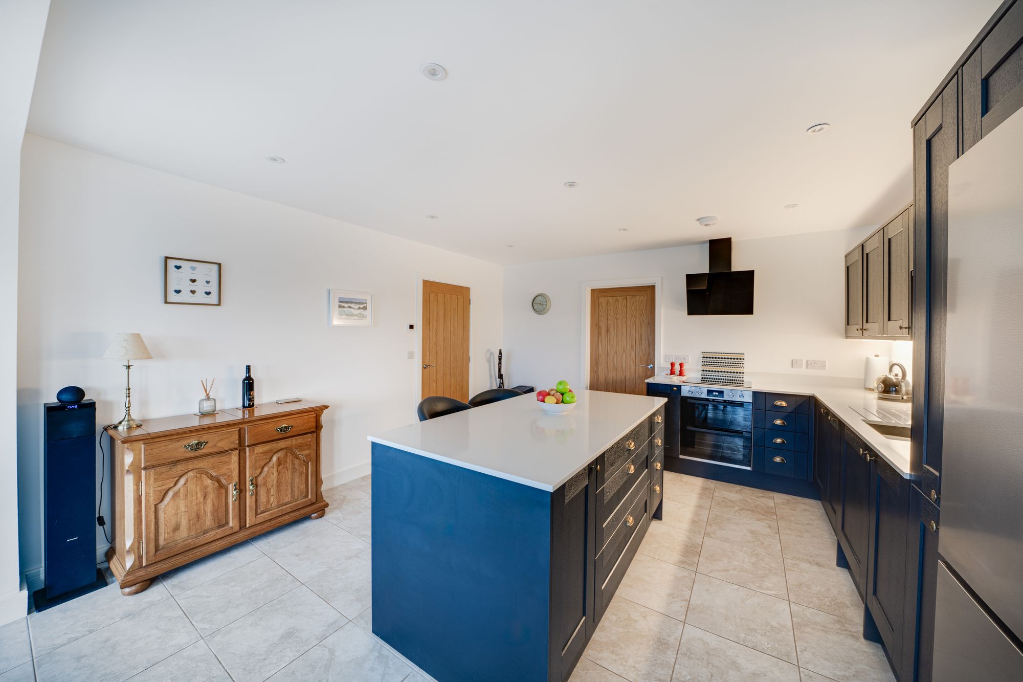 The heart of the home is the impressive open-plan kitchen and dining room, fitted with a contemporary range of units and integrated appliances, complemented by a central island providing informal seating. The dining area enjoys excellent natural light and direct access to the garden, creating a seamless connection between indoor and outdoor living. Adjoining the kitchen is a separate utility room with matching cabinetry and space for laundry appliances, which also provides internal access to the double garage. The ground floor accommodation benefits from zoned underfloor heating, allowing individual temperature control to suit modern lifestyles.