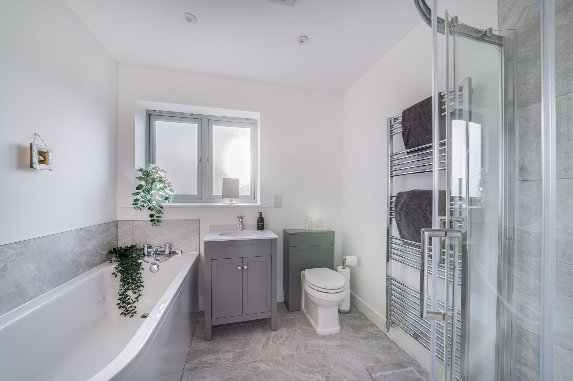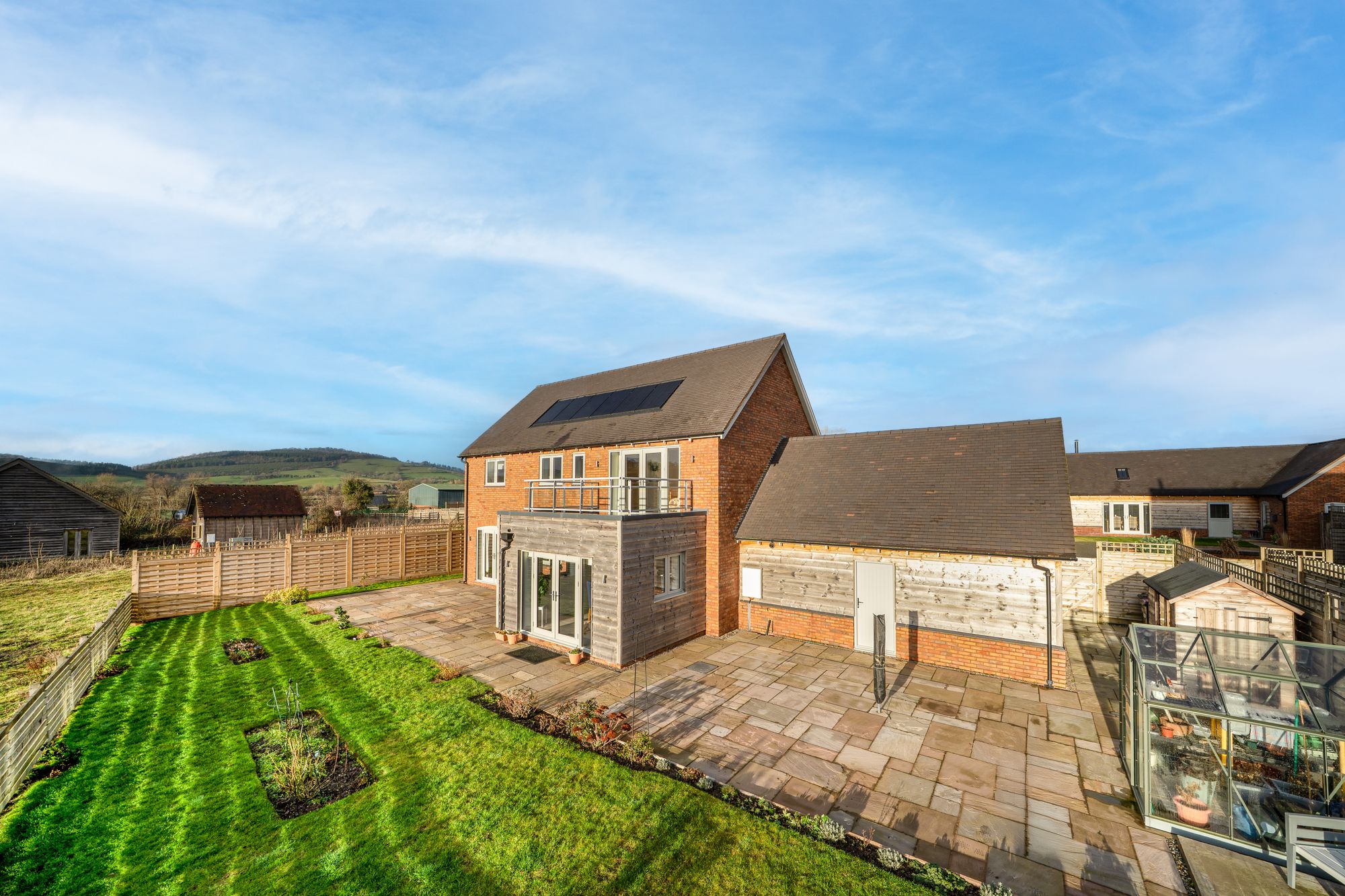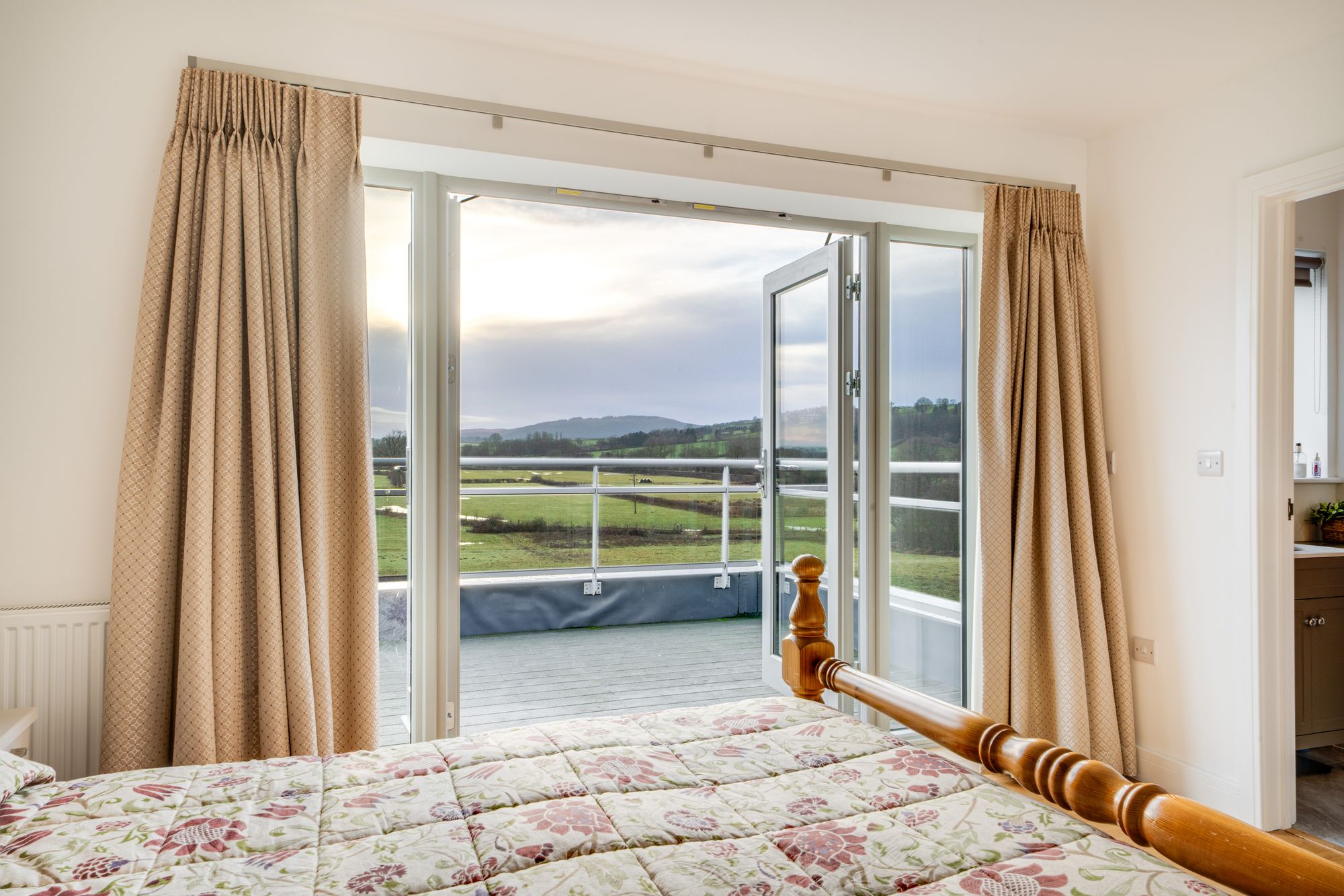 To the first floor, the landing leads to four well-proportioned bedrooms. The principal bedroom enjoys fitted wardrobes, a stylish en-suite shower room, and glazed doors opening onto a private balcony, from which far-reaching views across the surrounding countryside can be appreciated. The remaining bedrooms are served by a well-appointed family bathroom, fitted with a modern white suite including bath and separate shower.