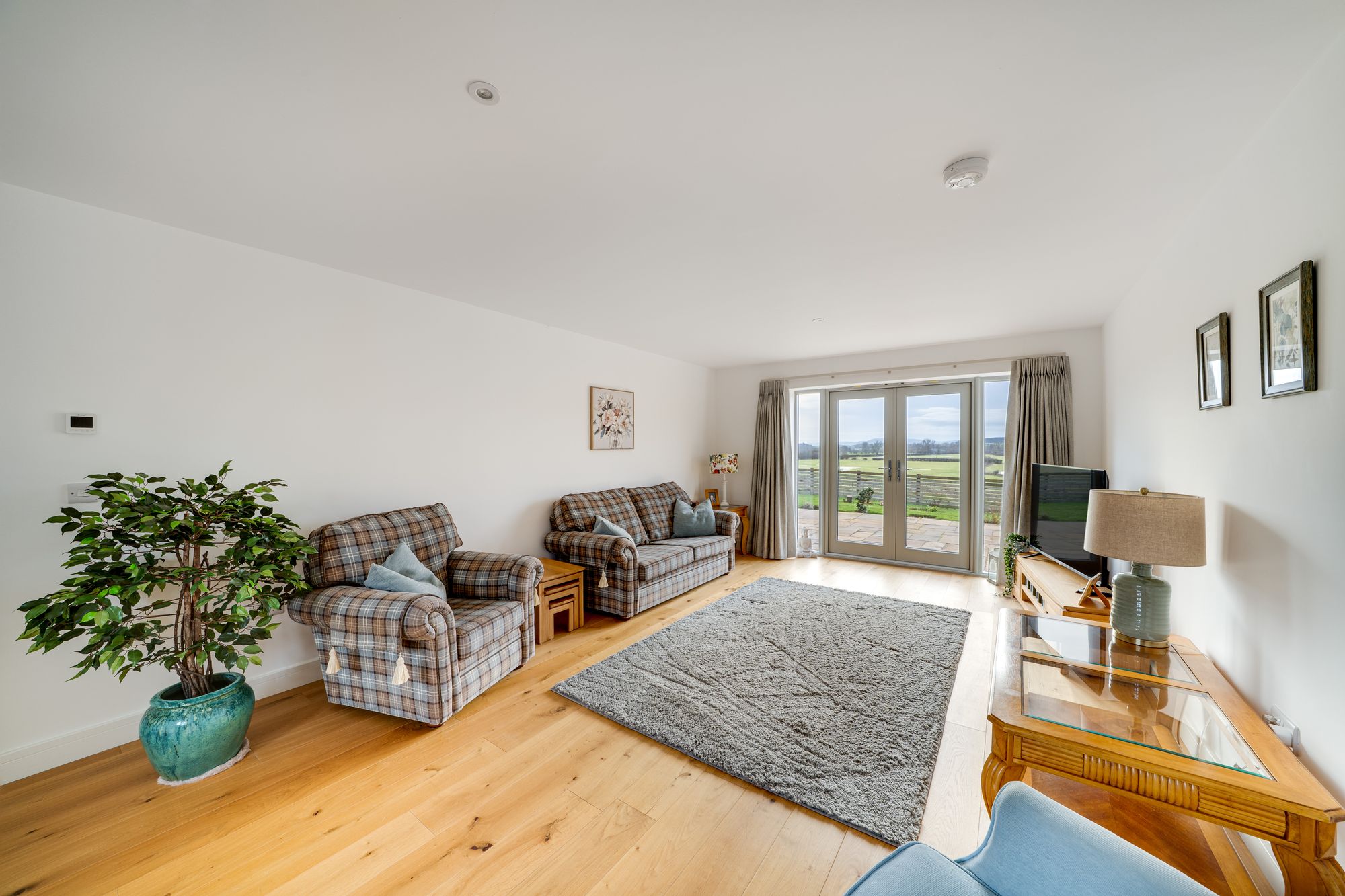 The living room is a well-proportioned and inviting space, extending the full depth of the property and enjoying glazed doors opening onto the rear terrace. This room benefits from a pleasant outlook over the garden and open countryside beyond, making it an ideal space for both everyday living and entertaining.