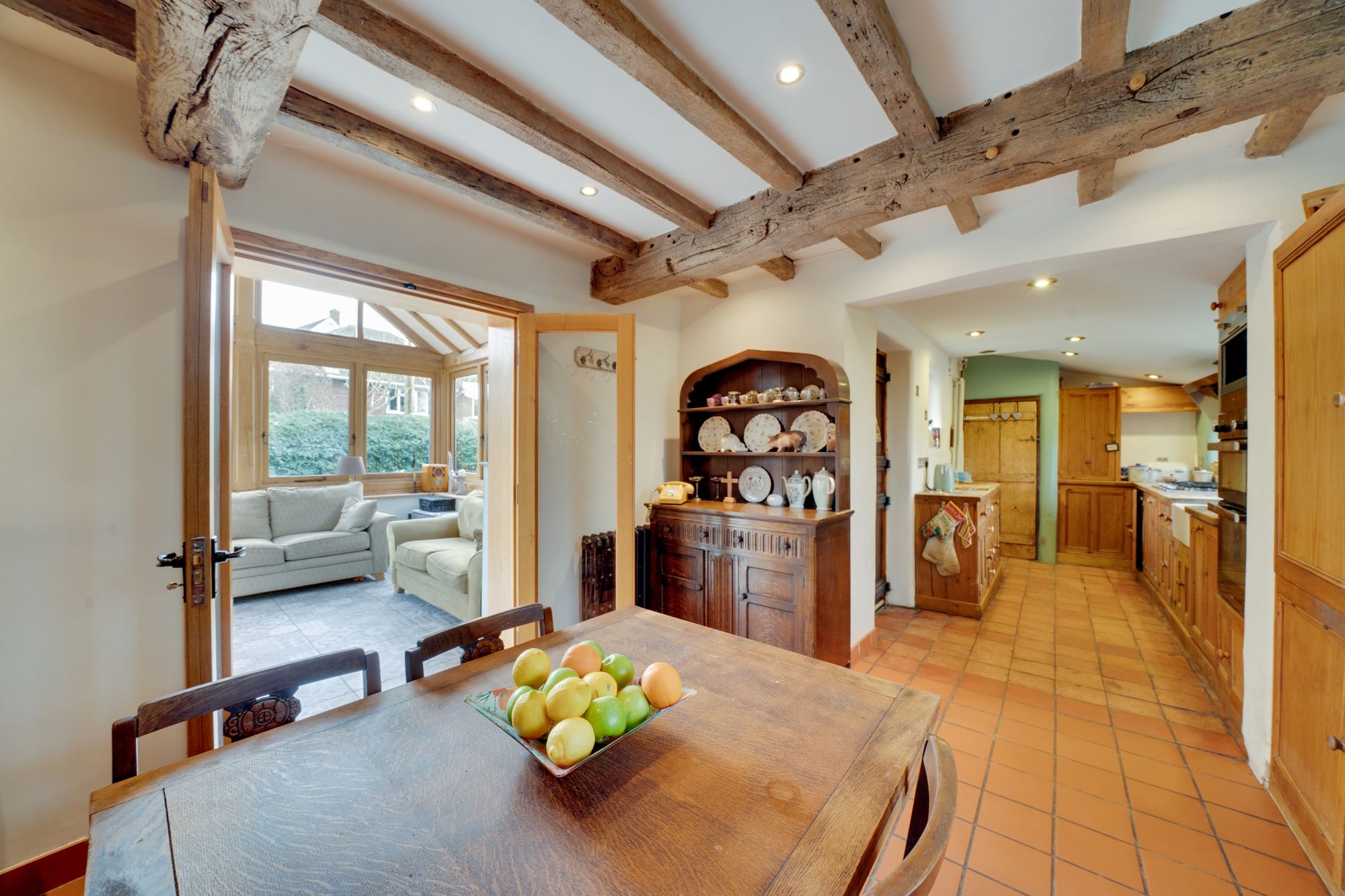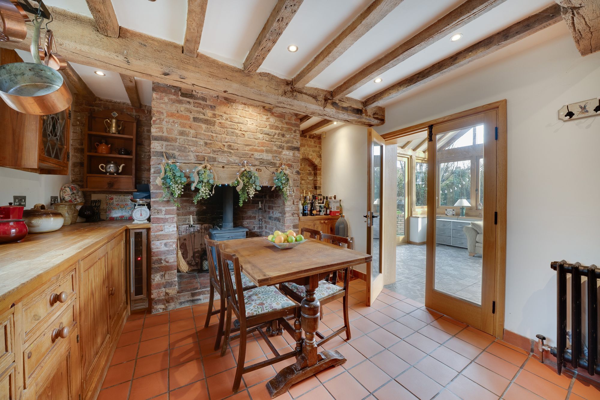 Internally, the cottage showcases a wealth of original features, which include exposed beams, wood burning stoves and traditional detailing, all blending beautifully with the improvements made over time. The ground floor includes a snug which has been used as a third bedroom, a beautiful family bathroom with underfloor heating, a stylish space offering a touch of luxury, Walk in wardrobe/Study and a charming kitchen diner with farmhouse style kitchen and wood burning stove. A particular highlight is the addition of a stunning oak-framed garden room that also benefits from underfloor heating, creating a light-filled space that connects the house seamlessly to the outdoors — perfect for relaxing, dining or entertaining throughout the seasons. Additionally the first floor offers two double bedrooms.