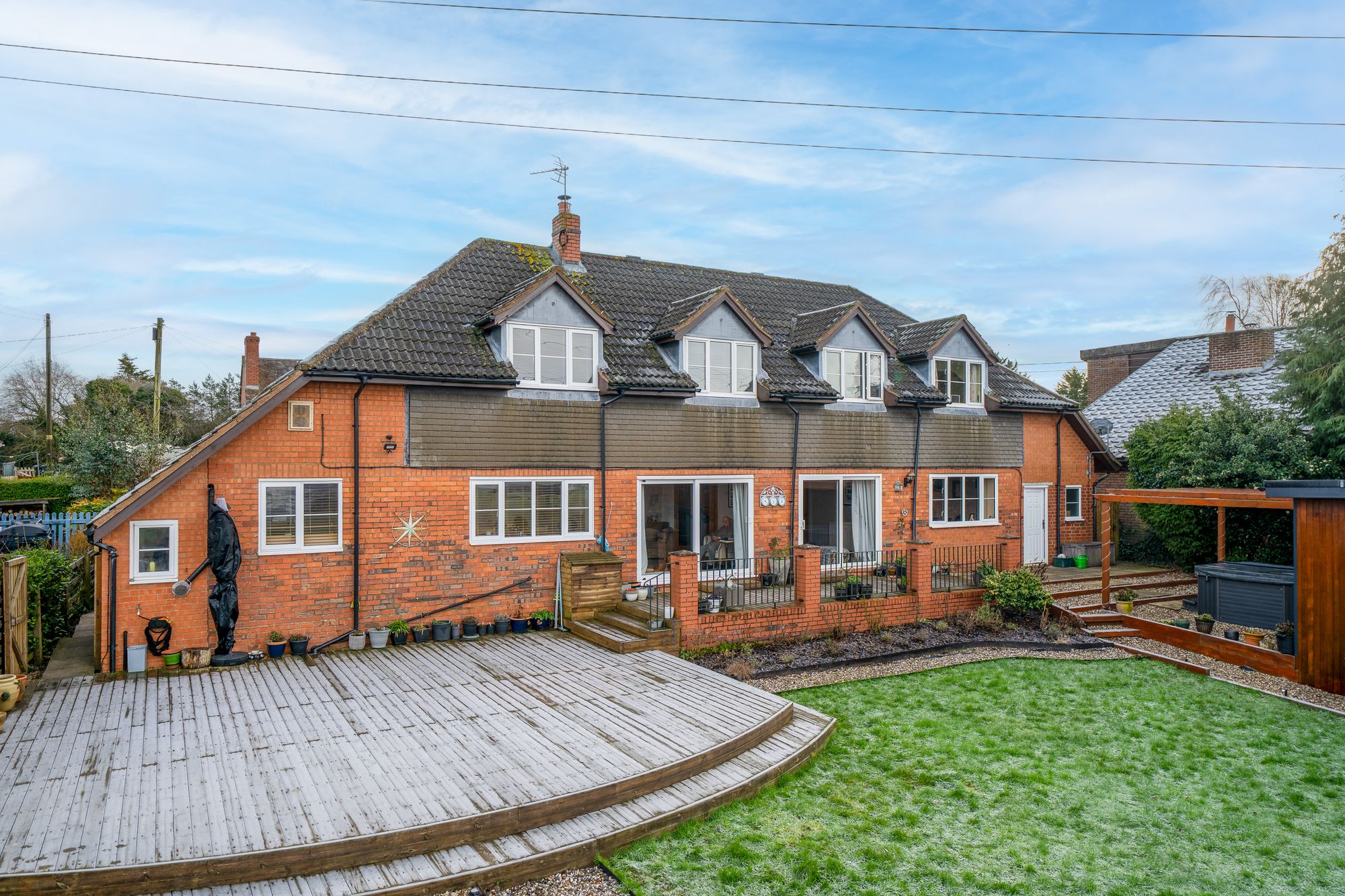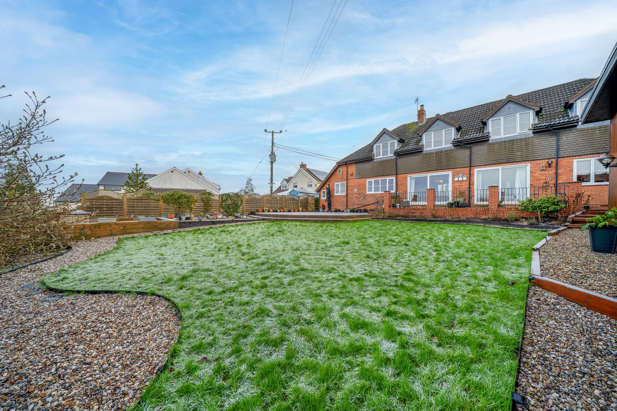 From the dining area, the kitchen/diner is accessed and offers a practical and well-proportioned space. Fitted with shaker-style wall and base units, solid wood worktops and a ceramic butler sink, the kitchen is both functional and inviting. A range-style cooker provides a focal point, complemented by integrated appliances and ample storage. There is space for informal dining, making this a comfortable hub for day-to-day living.