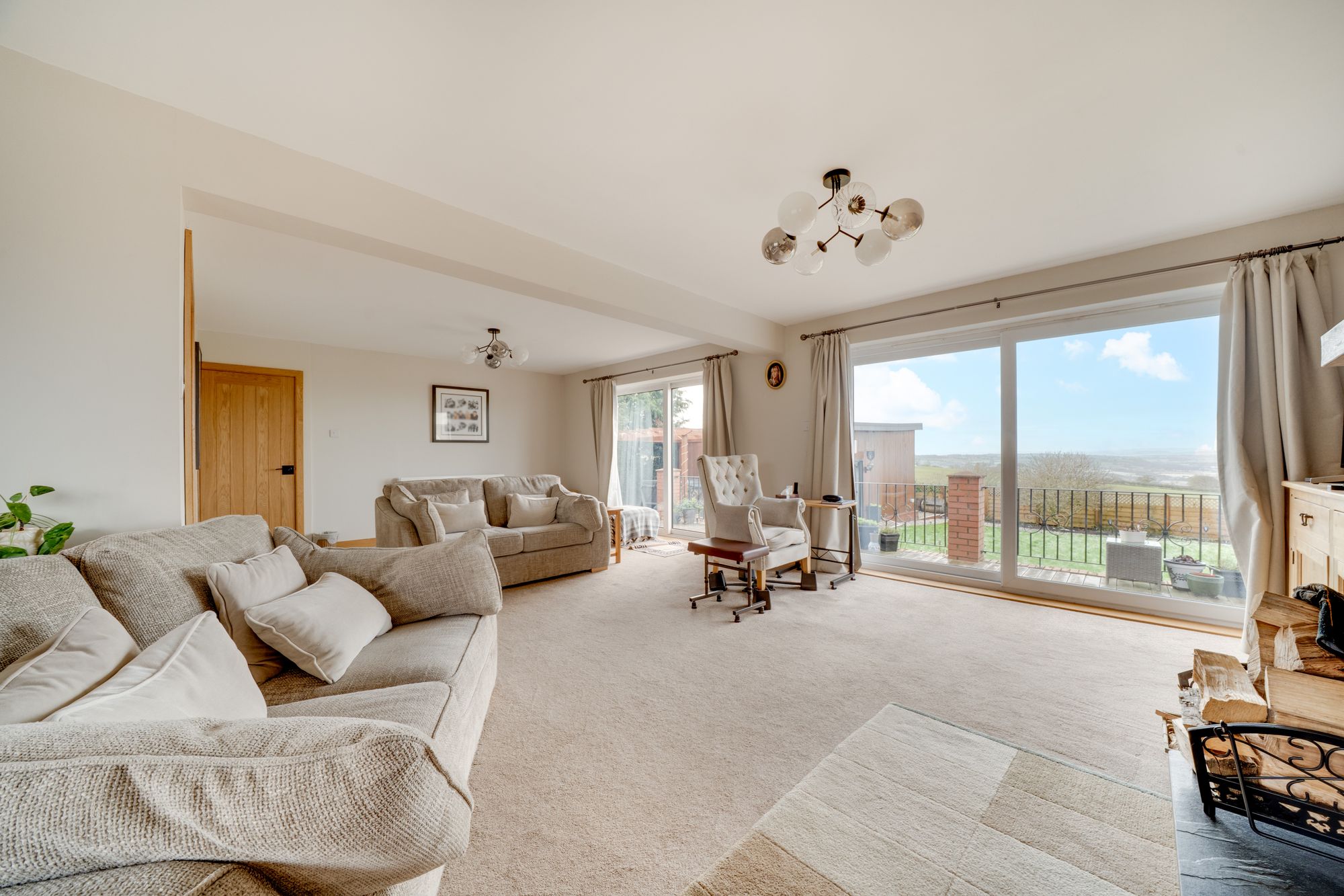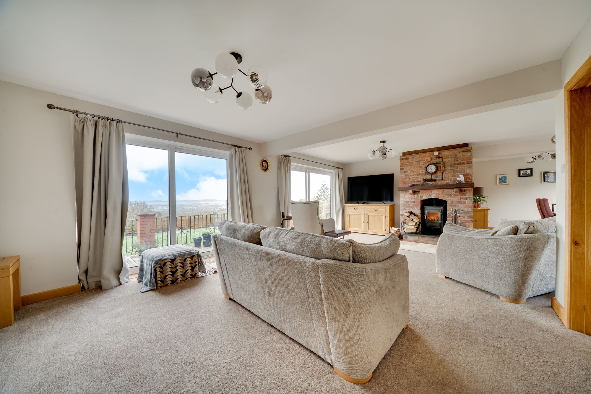 The main sitting room is a particularly impressive and light-filled space, arranged around an exposed brick fireplace with wood-burning stove set on a slate hearth, creating a warm and welcoming focal point. Wide sliding doors open directly onto the raised terrace and frame far-reaching views across the Teme Valley, allowing natural light to flood the room and providing a seamless connection between inside and out.