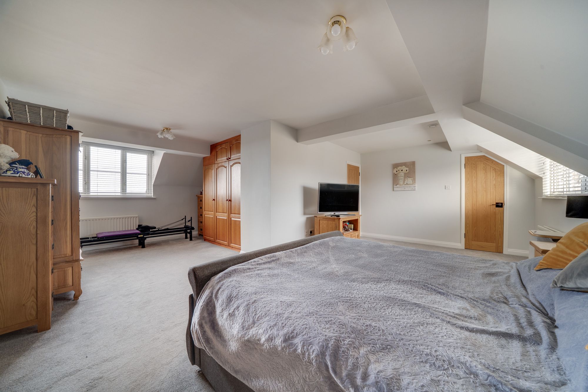 The second staircase leads to the principal bedroom suite, a generous and well-arranged space enjoying a pleasant outlook. The bedroom incorporates a dressing area with built-in wardrobes and is served by a spacious en-suite shower room. From the principal suite, a further bedroom is accessed, currently utilised as a study, which in turn leads back down the secondary staircase to the dining area. This arrangement lends itself particularly well to multi-generational living or independent use of space.