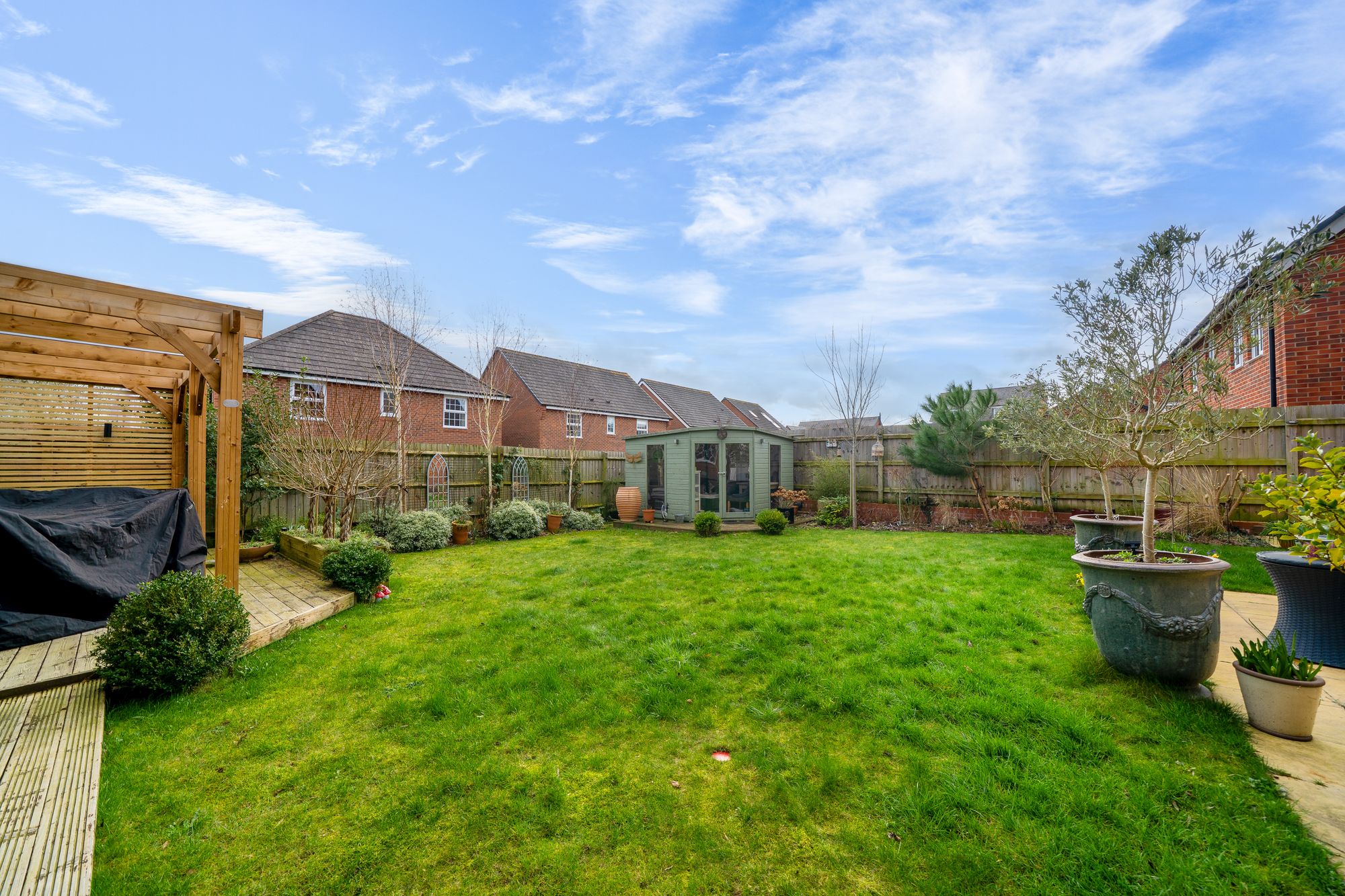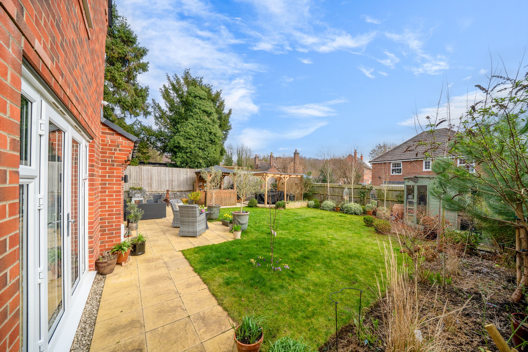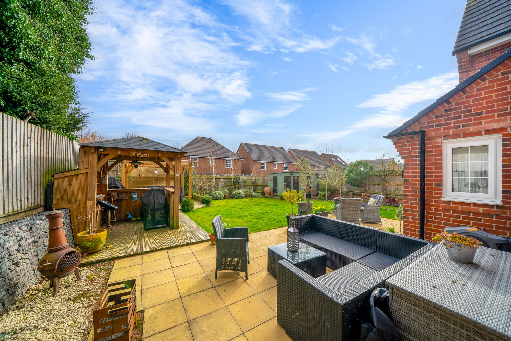 Step outside and the lifestyle appeal really comes into its own. The rear garden is large and designed for making the most of sunny days and long evenings, with a summerhouse providing a peaceful escape for relaxing, hobbies or a garden office. An outdoor bar area elevates the space even further, creating a brilliant setting for entertaining friends and family, hosting celebrations, or simply enjoying a quiet drink as the sun goes down.