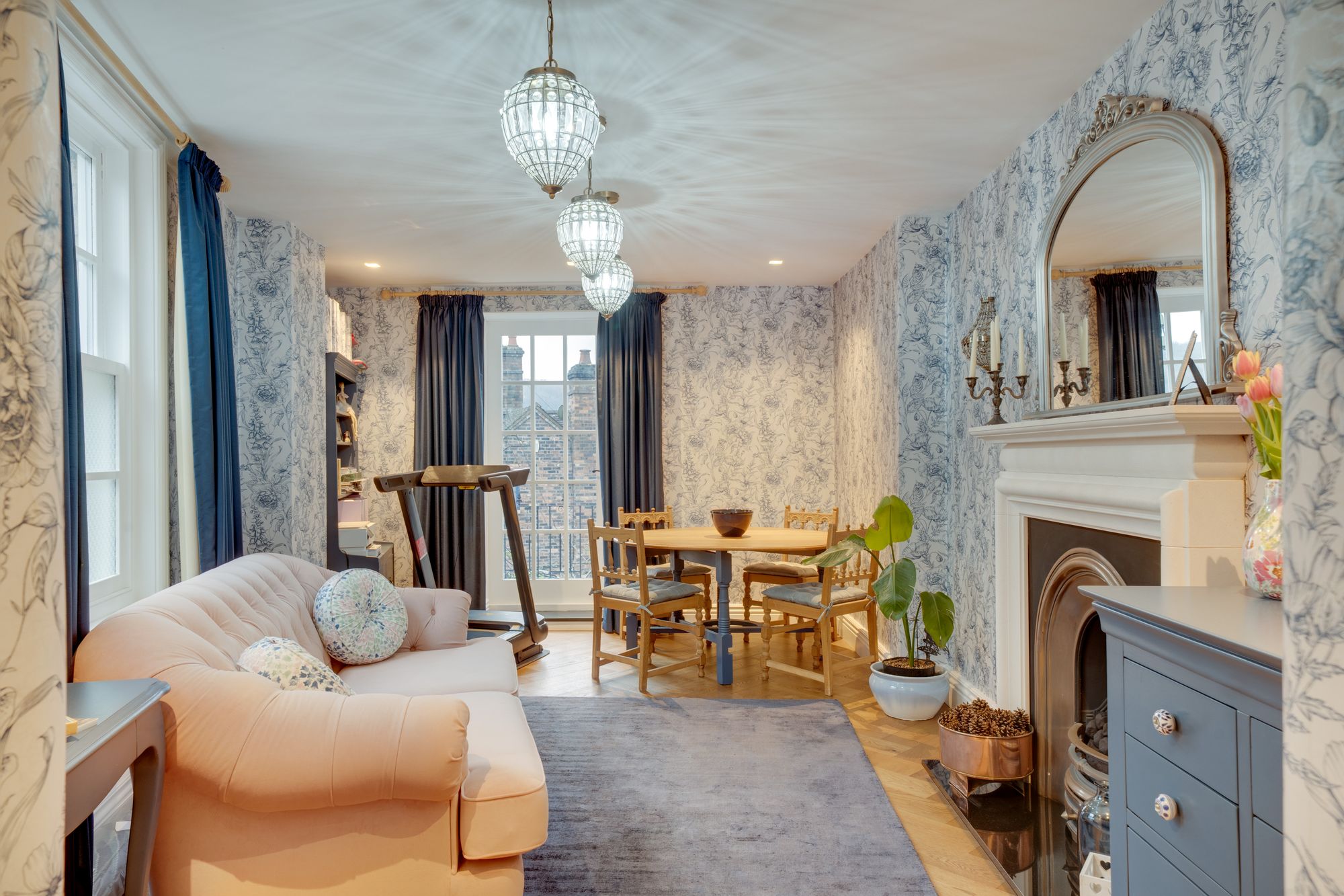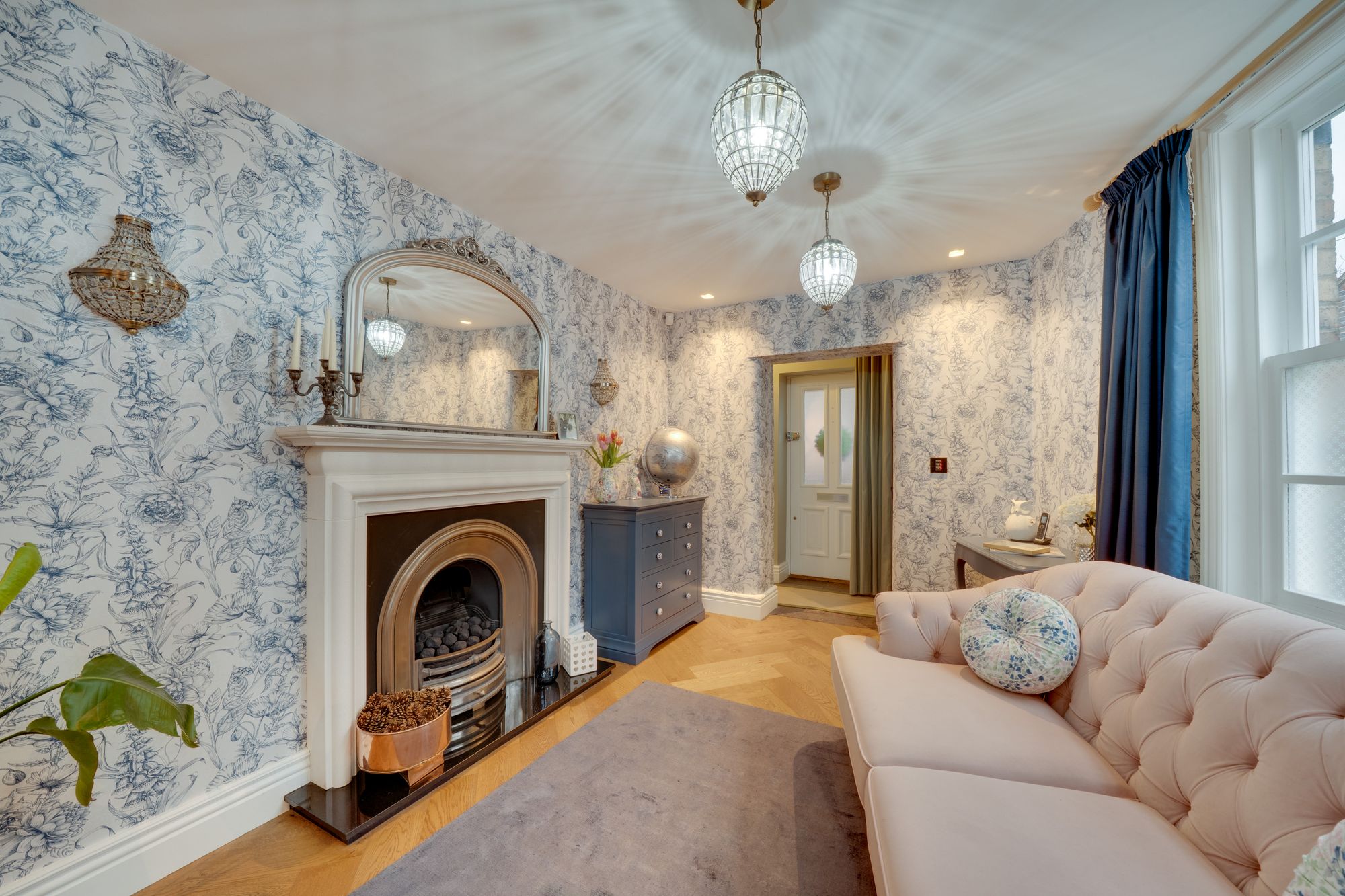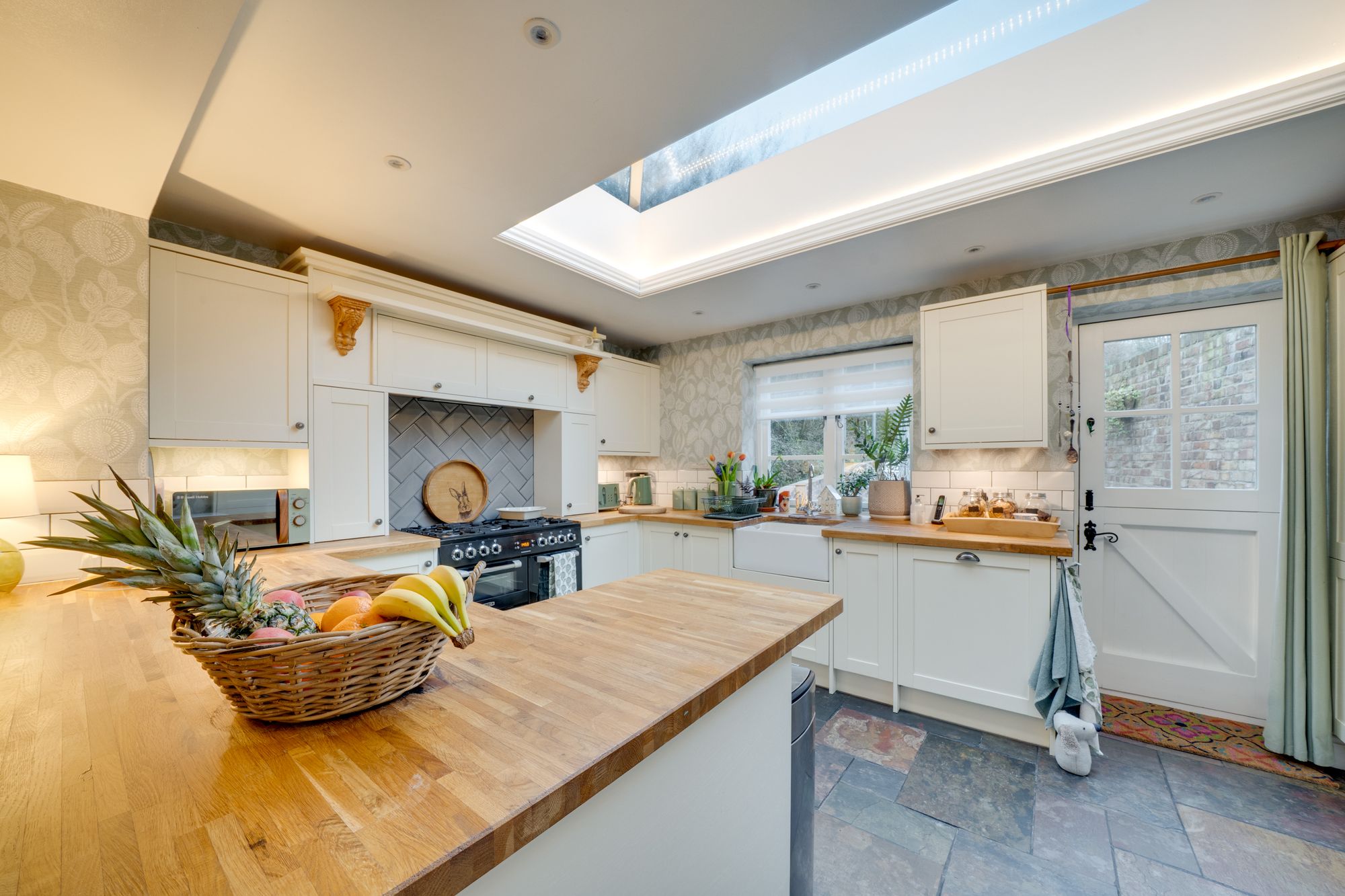 family living. Serving as the heart of the home, this beautifully appointed room balances style with functionality, showcasing carefully curated details including a charming slate flagstone floor, a classic Belfast sink, and an elegant roof lantern that bathes the space in natural light. The kitchen is comprehensively equipped with an electric oven and gas hob, American-style Wi-Fi fridge/freezer, dishwasher, and an abundance of bespoke cabinetry providing excellent storage. This floor further benefits from a well-appointed utility room with washing machine, tumble dryer and guest W.C. From the kitchen, a traditional stable door opens directly onto the rear enclosed walled garden, creating a seamless transition between indoor and outdoor living and offering the perfect setting to enjoy a morning coffee. The ground floor accommodation is further complemented by two reception rooms. The first is a beautifully styled sitting room, offering a refined yet inviting space to unwind, complete with feature fireplace, integrated home cinema with surround sound, and French doors opening onto a balcony. The second reception/dining room features a fireplace and French doors opening onto a balcony, providing a versatile setting ideal for formal entertaining or elegant family dining.