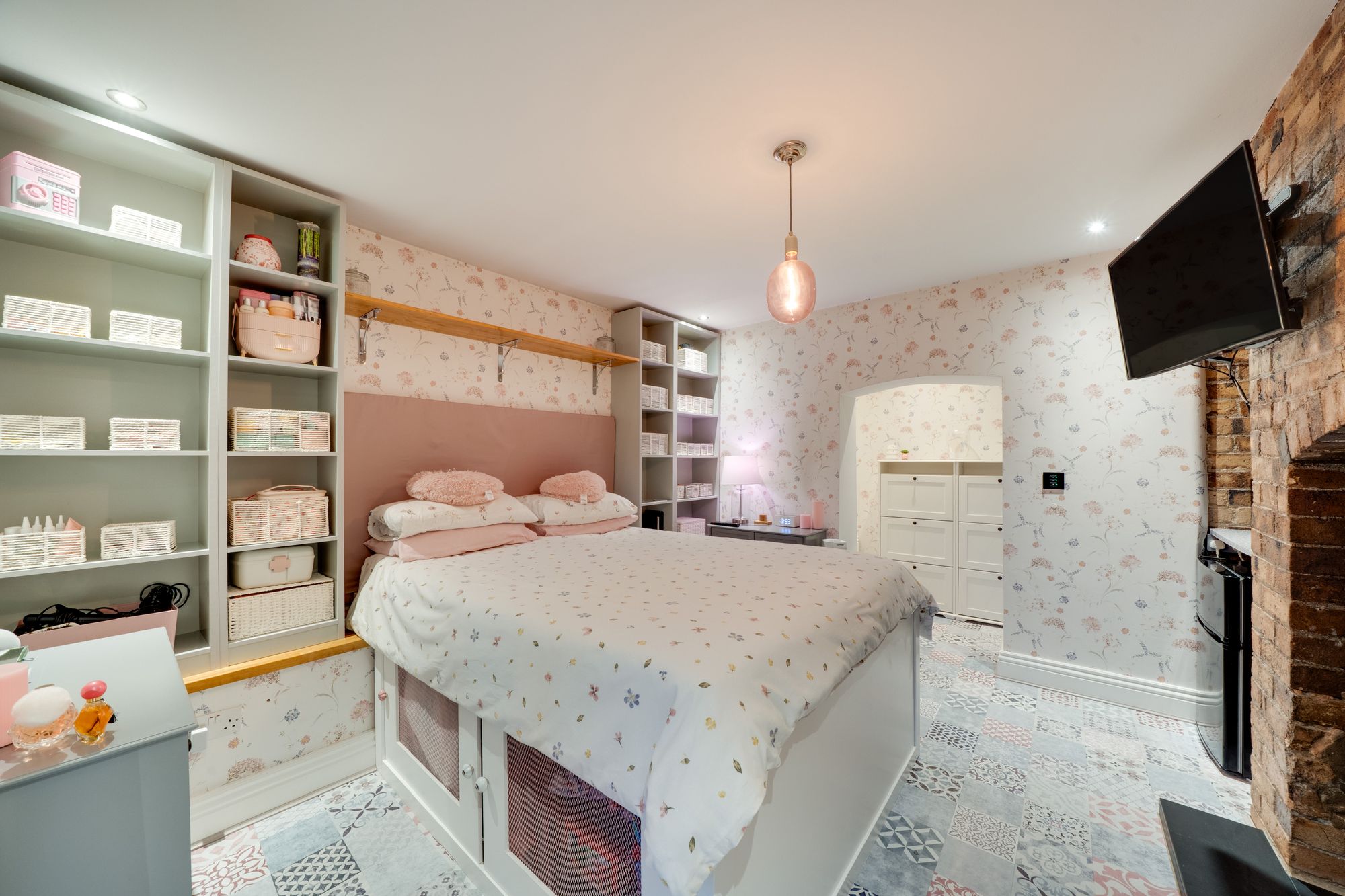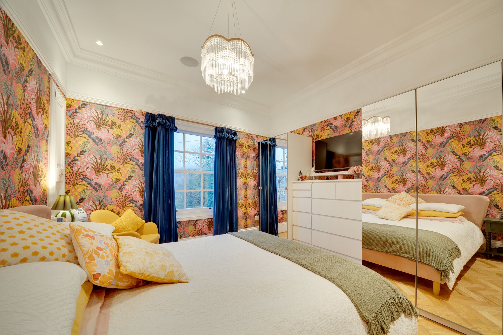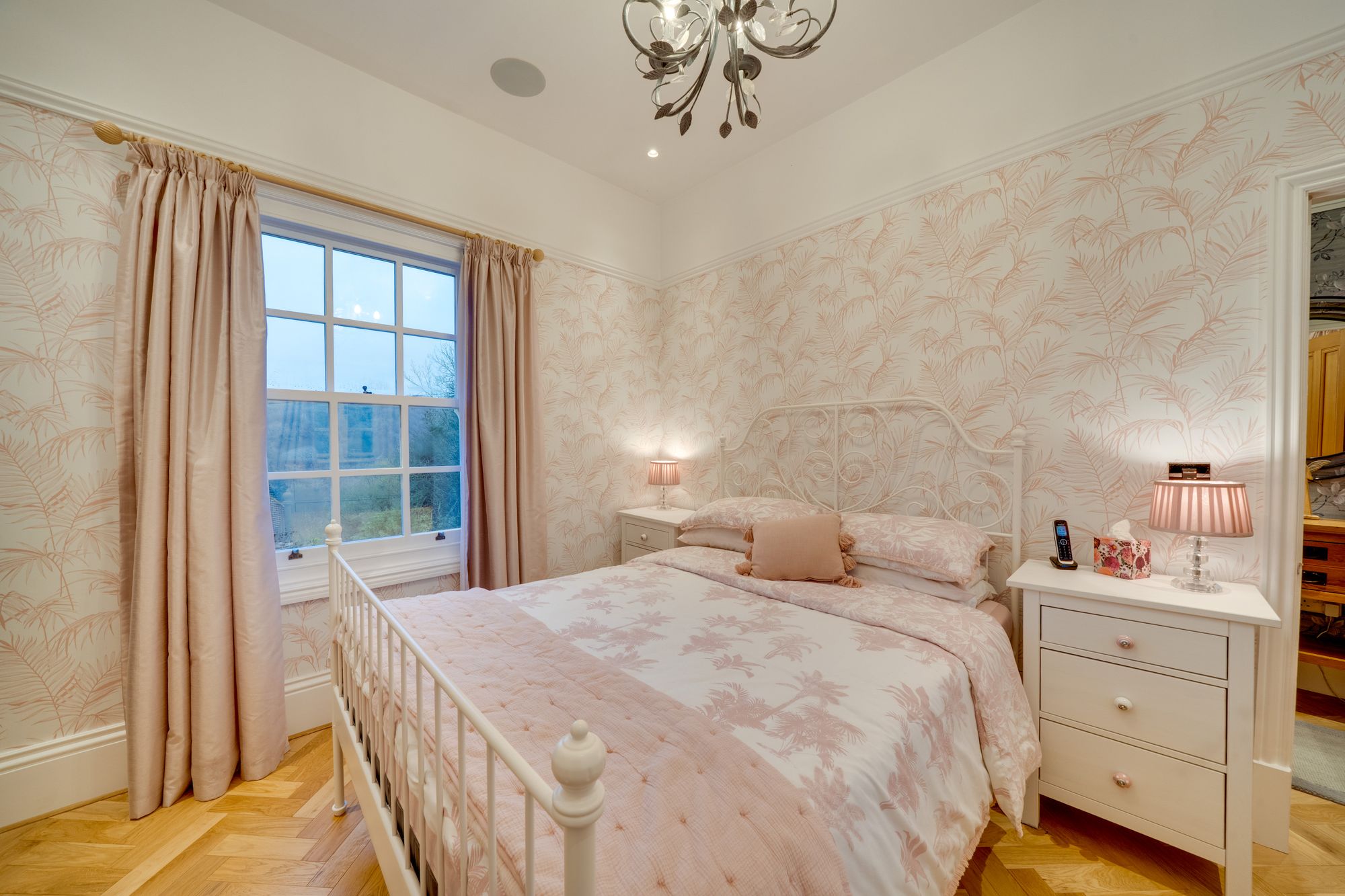 family living. Serving as the heart of the home, this beautifully appointed room balances style with functionality, showcasing carefully curated details including a charming slate flagstone floor, a classic Belfast sink, and an elegant roof lantern that bathes the space in natural light. The kitchen is comprehensively equipped with an electric oven and gas hob, American-style Wi-Fi fridge/freezer, dishwasher, and an abundance of bespoke cabinetry providing excellent storage. This floor further benefits from a well-appointed utility room with washing machine, tumble dryer and guest W.C. From the kitchen, a traditional stable door opens directly onto the rear enclosed walled garden, creating a seamless transition between indoor and outdoor living and offering the perfect setting to enjoy a morning coffee. The ground floor accommodation is further complemented by two reception rooms. The first is a beautifully styled sitting room, offering a refined yet inviting space to unwind, complete with feature fireplace, integrated home cinema with surround sound, and French doors opening onto a balcony. The second reception/dining room features a fireplace and French doors opening onto a balcony, providing a versatile setting ideal for formal entertaining or elegant family dining.