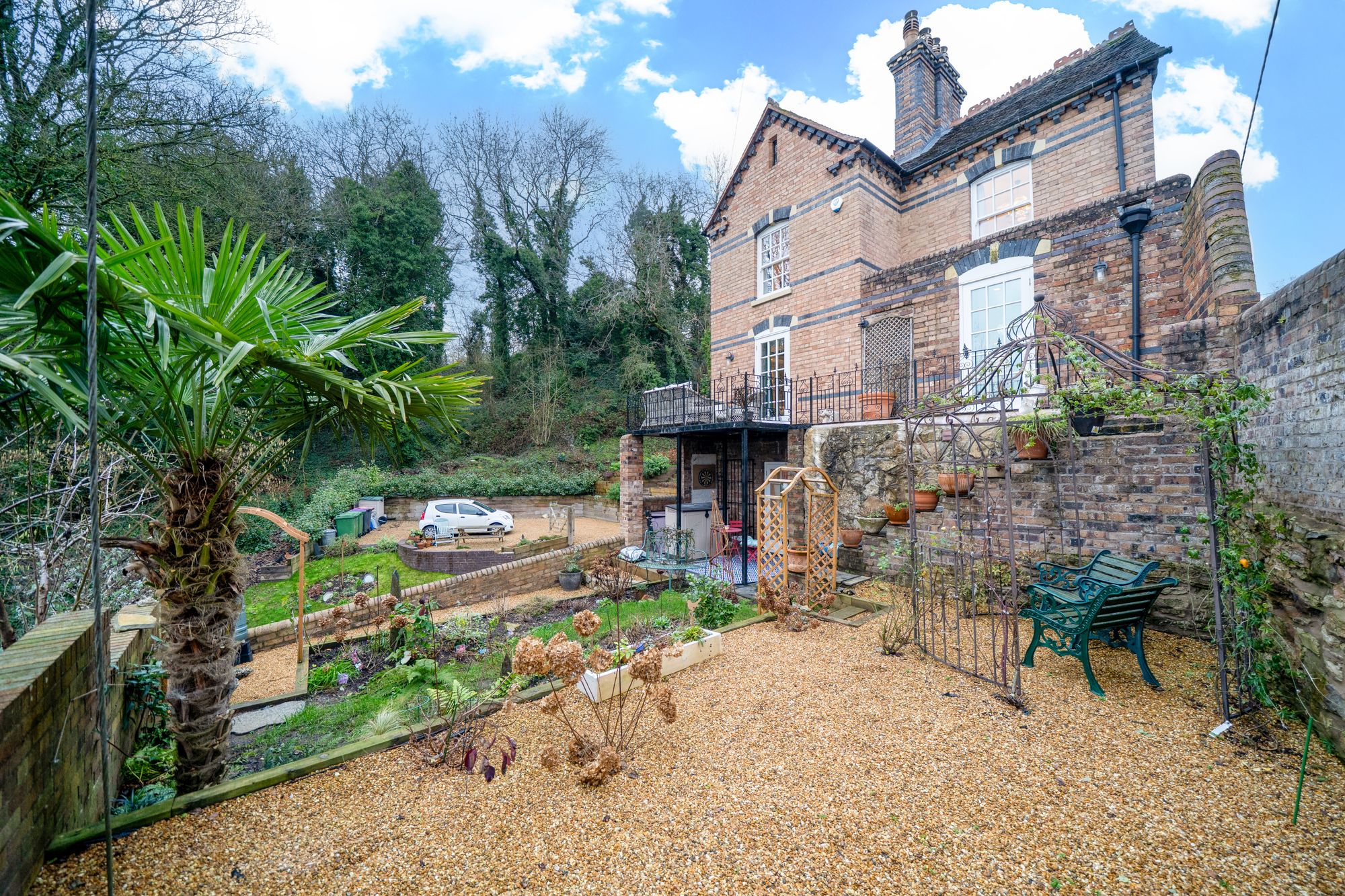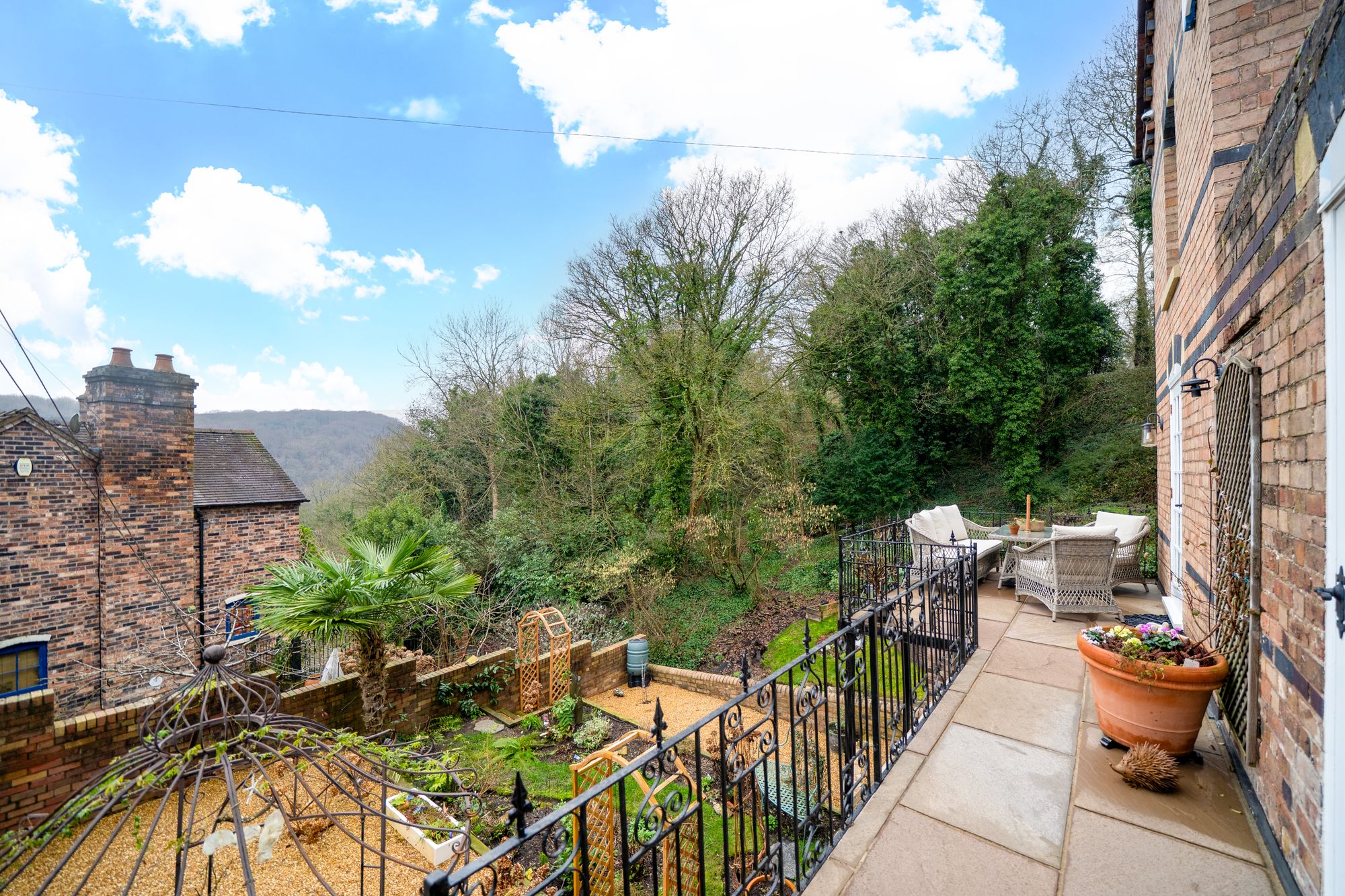 Steps lead down from the balcony to a further walled garden, landscaped to create a series of attractive terraces and seating areas.