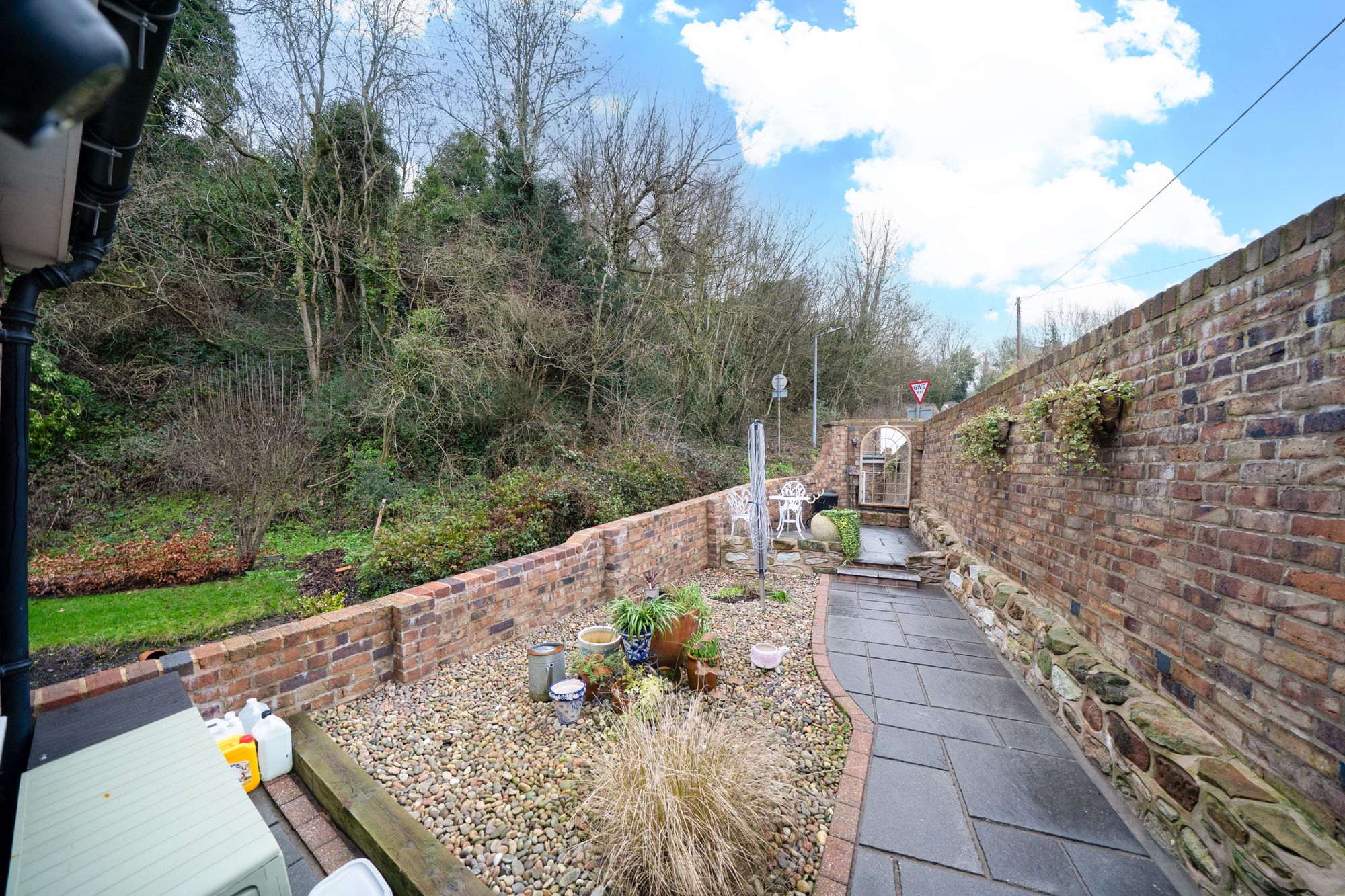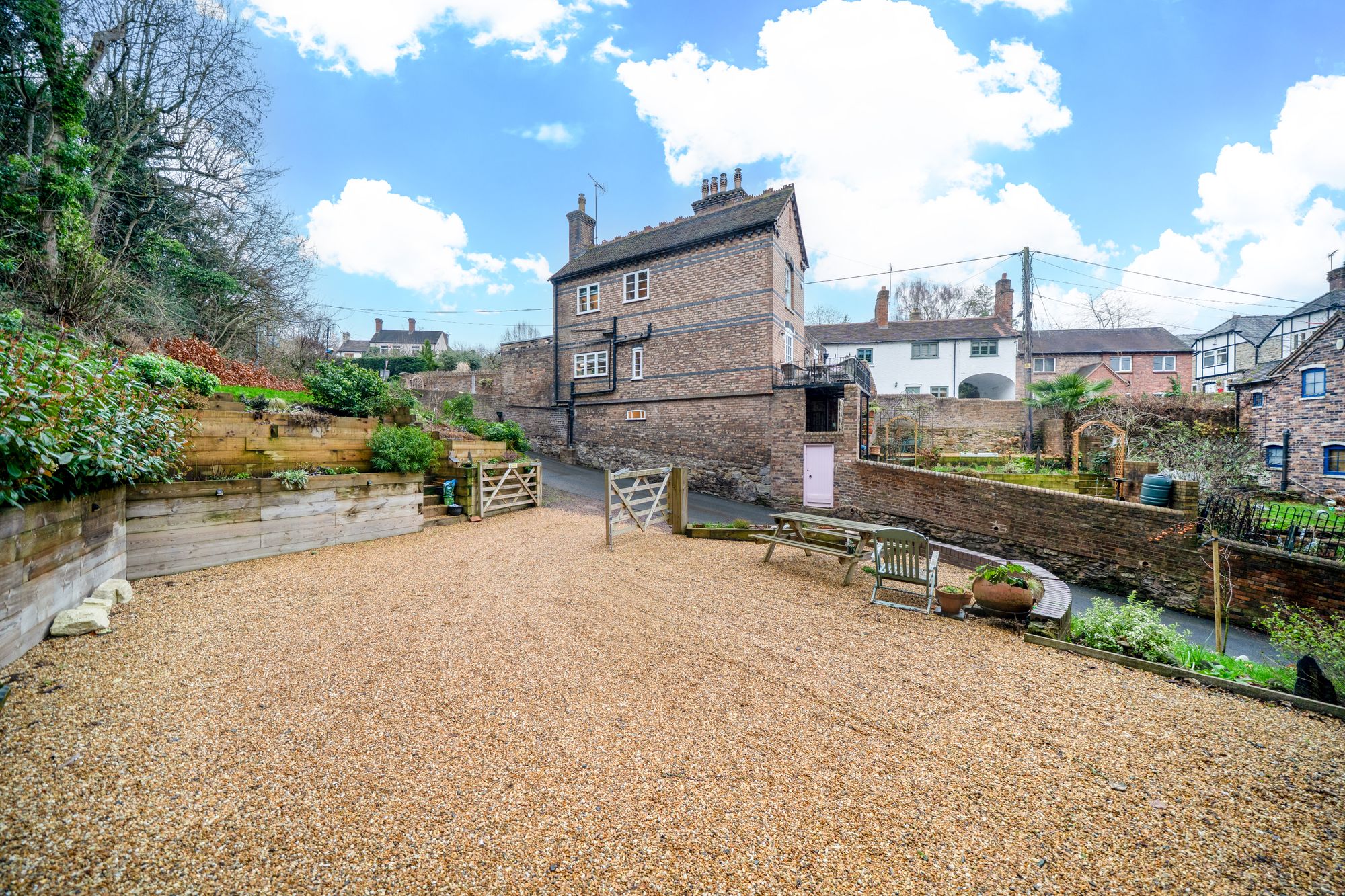 Lastly, to the side of the property is an additional landscaped garden with gravel driveway and gated parking.