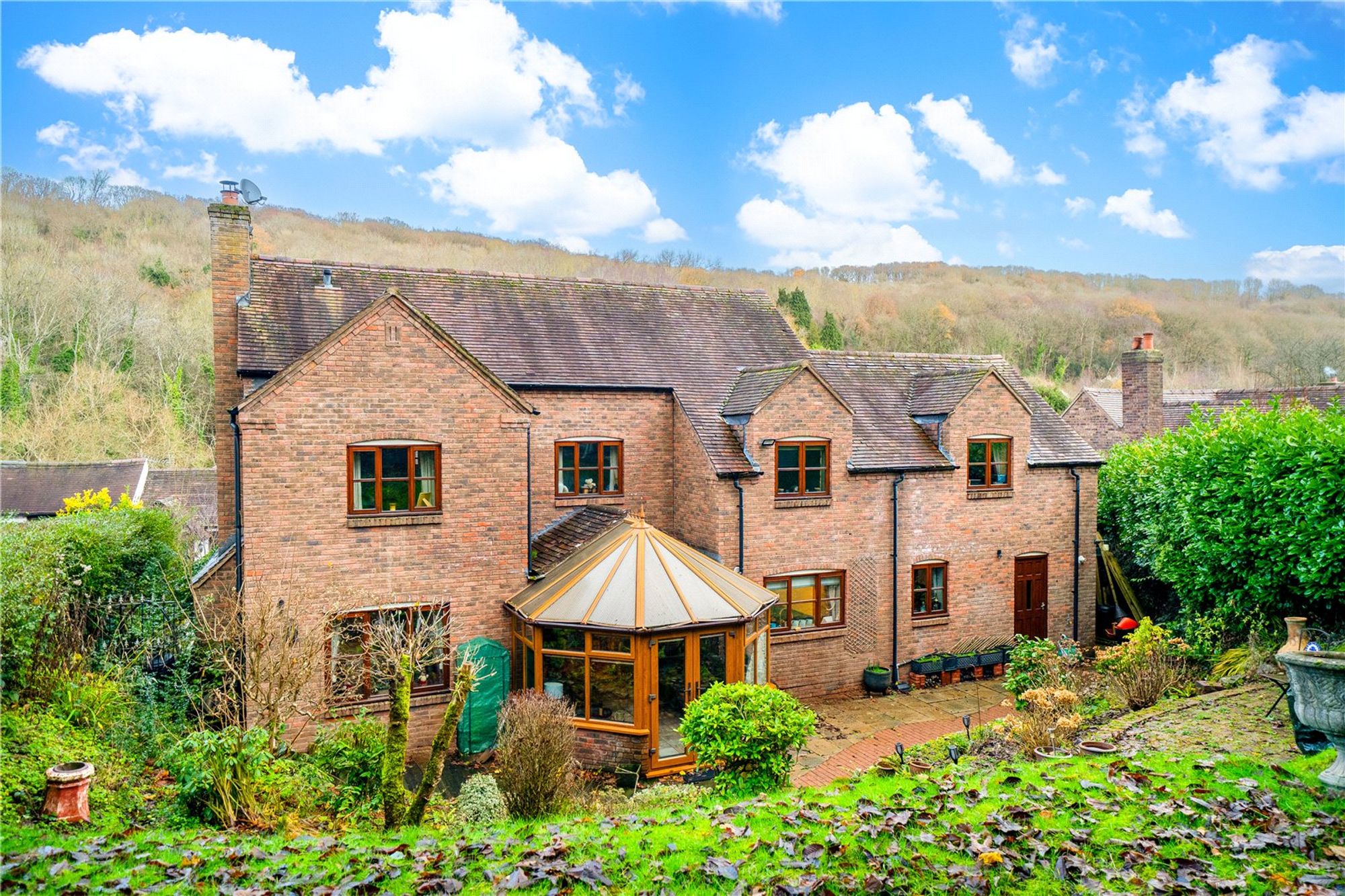 The garden is a true highlight of the property, thoughtfully arranged over several terraced levels to complement its hillside setting. Immediately to the rear of the house is a paved and decked seating area, ideal for outdoor dining and entertaining, with direct access from the conservatory.