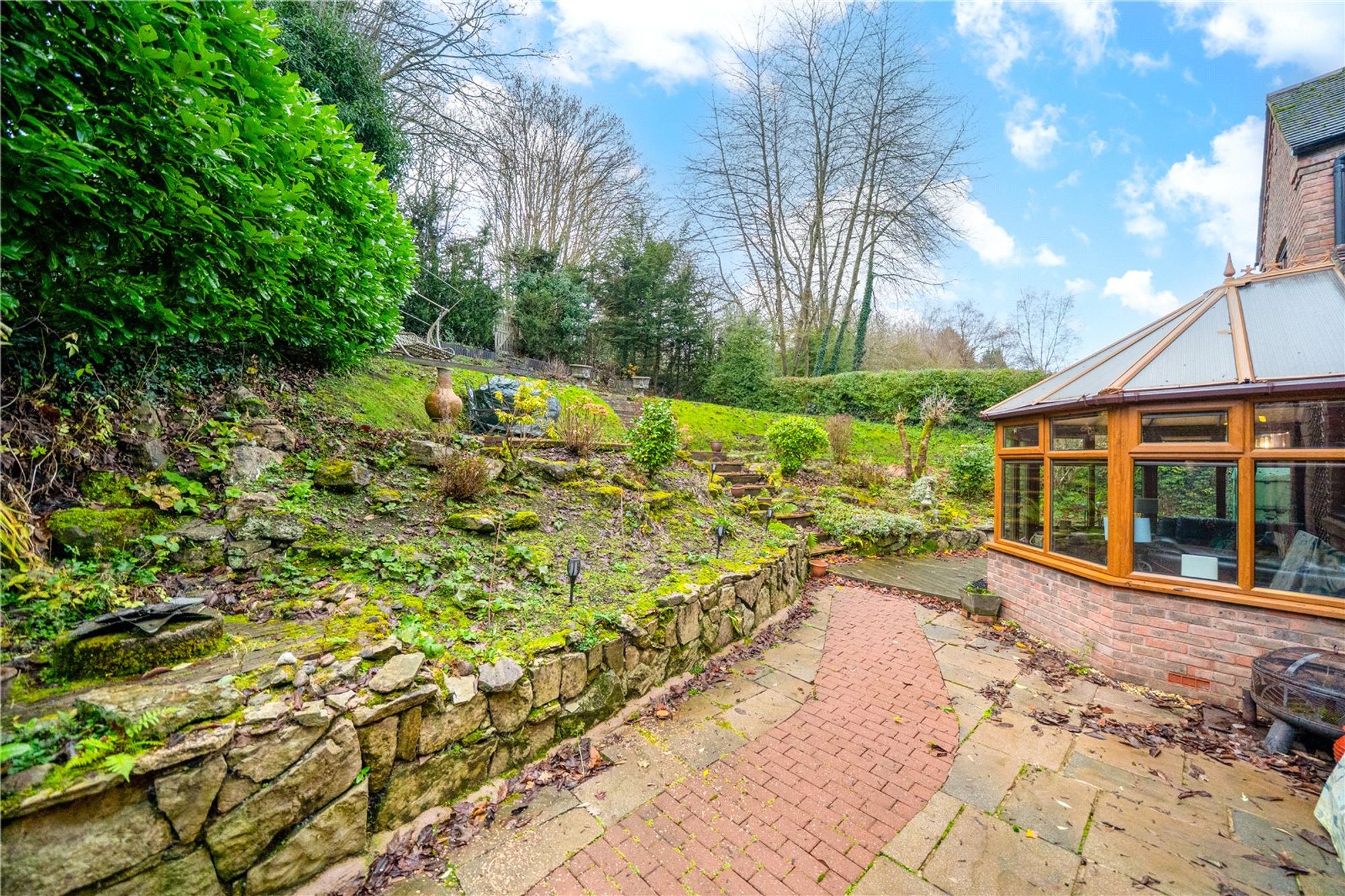Stone retaining walls, steps and pathways lead up through a series of landscaped tiers, creating distinct areas for seating, planting and enjoyment throughout the seasons. Mature shrubs, trees and established borders provide a strong sense of privacy and a natural backdrop, while elevated areas offer a peaceful outlook over the surrounding greenery. The garden feels both secluded and practical, offering character, interest and versatility rarely found in modern plots.