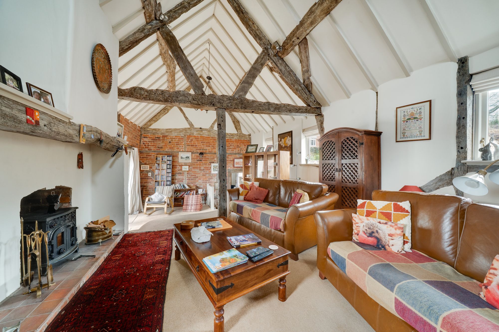 The stunning principal reception room is positioned within the adjoining barn, showcasing wonderful high vaulted ceilings and an array of exposed timbers. There is a log burner within an inglenook fireplace. Two sets of French doors give out onto a sheltered terrace to the rear.