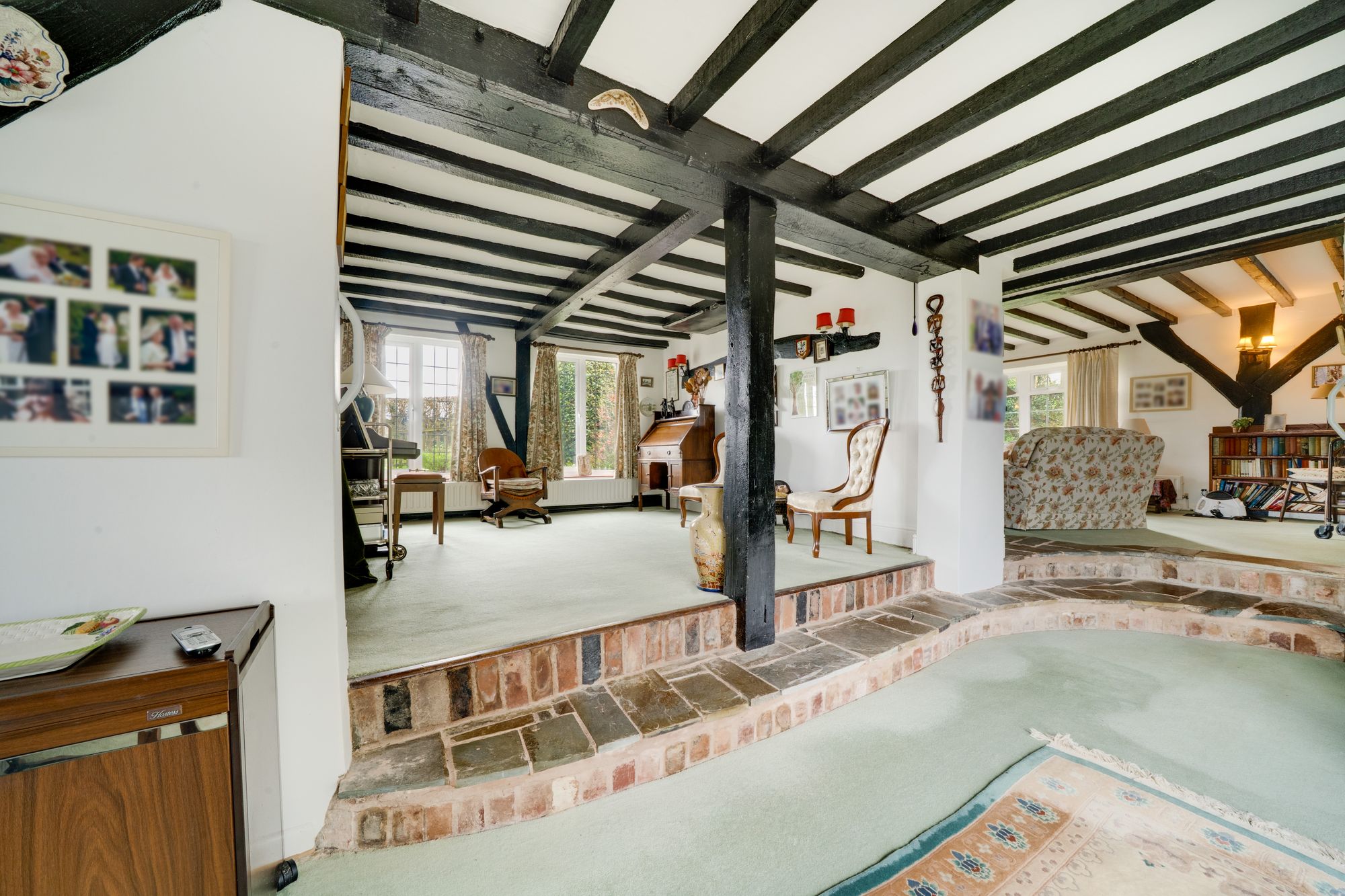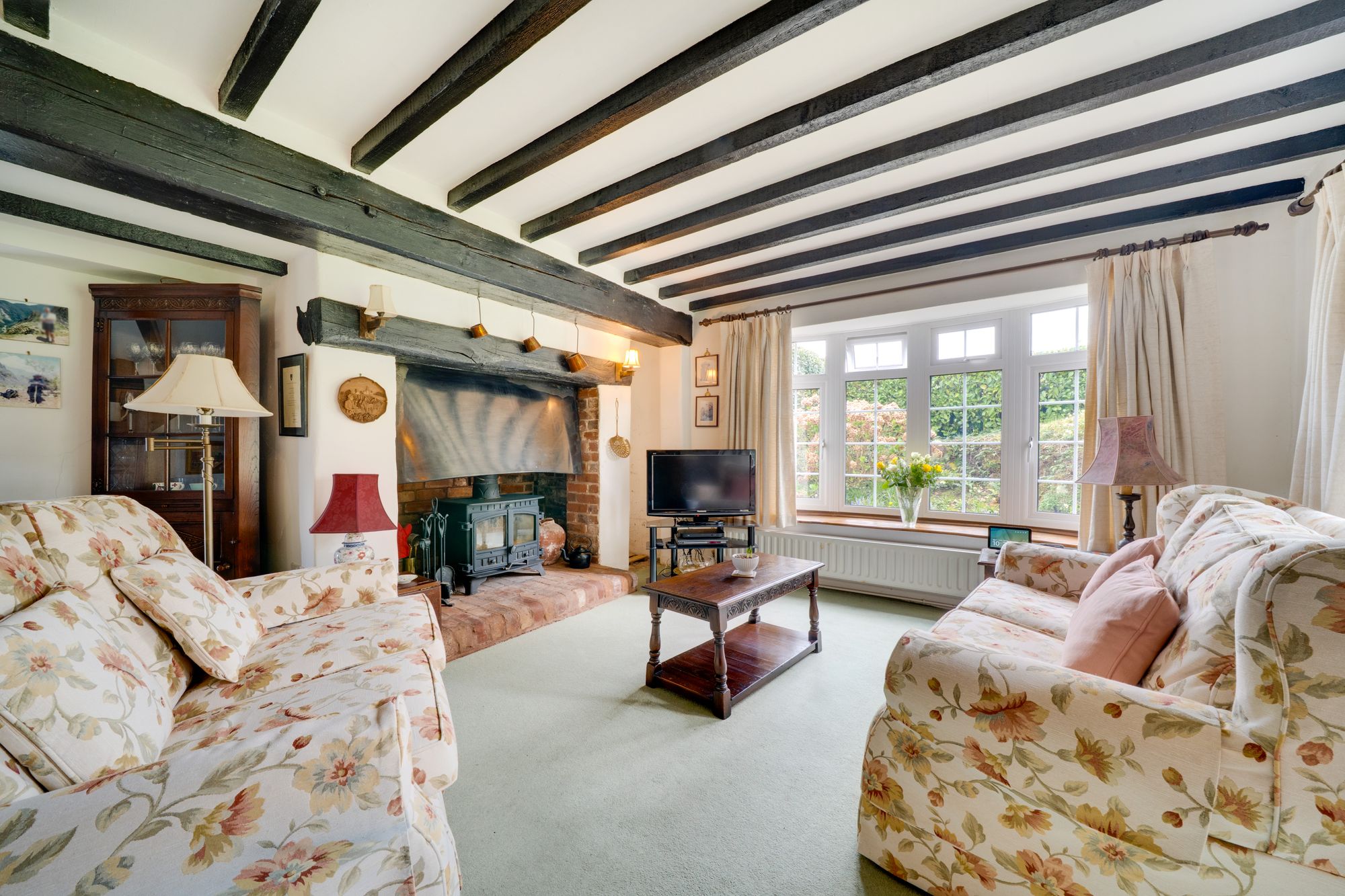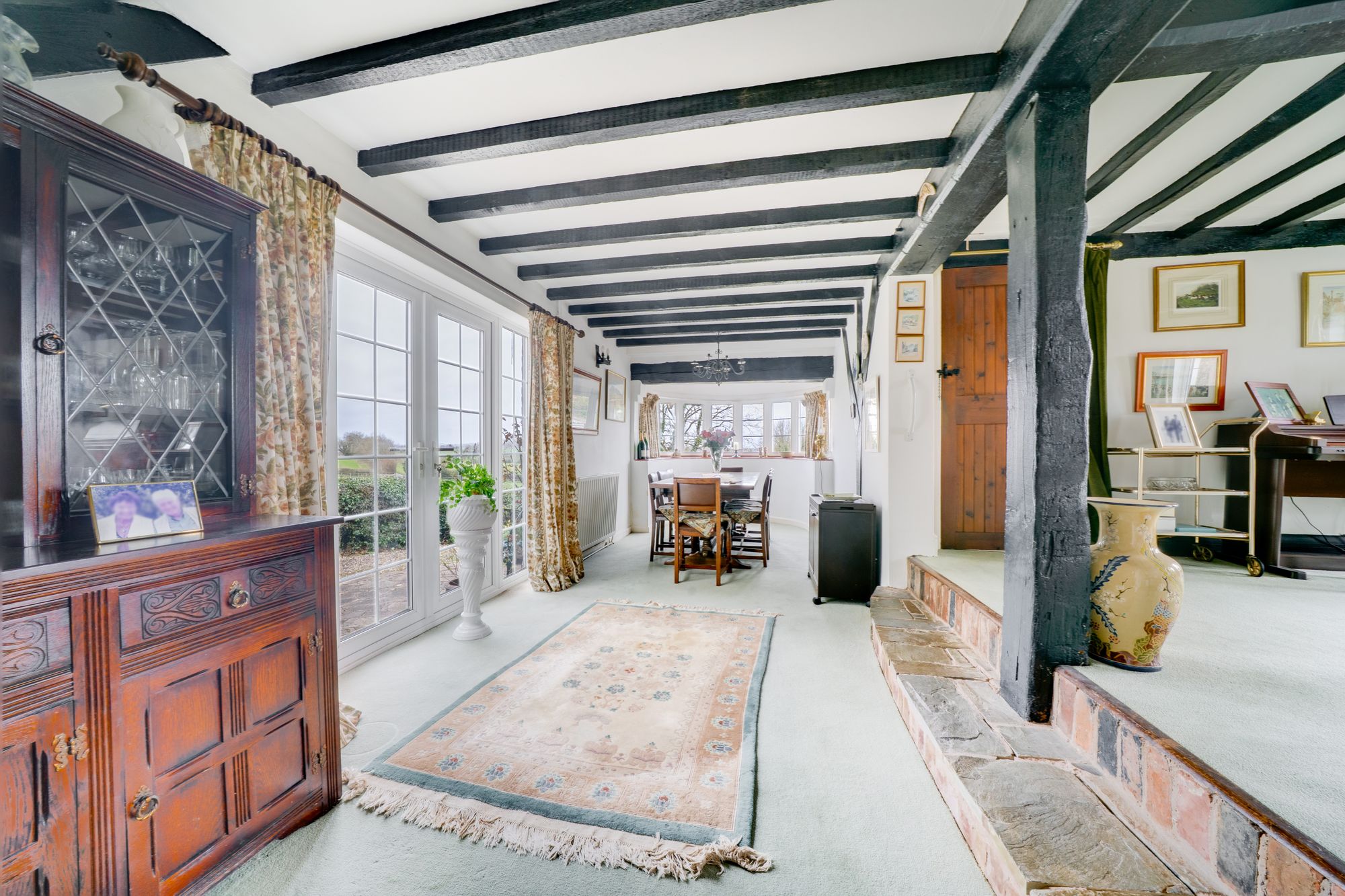 The accommodation is arranged over two floors and opens from the reception hall into a welcoming layout ideally suited to both family life and entertaining. The principal reception space is particularly appealing, with a substantial living room centred around an impressive inglenook-style fireplace and exposed timbers, creating a wonderfully atmospheric heart to the home. In addition, there is a separate sitting room of notable length, filled with natural light and enjoying an attractive curved bay, providing a versatile second reception area with ample space for relaxed seating or more formal entertaining.