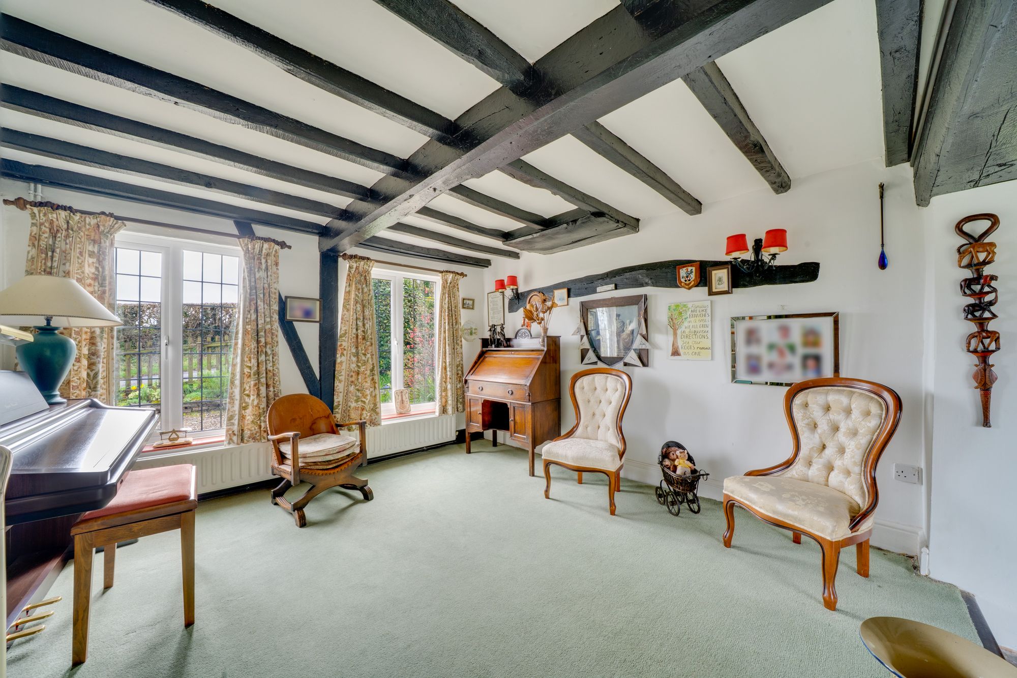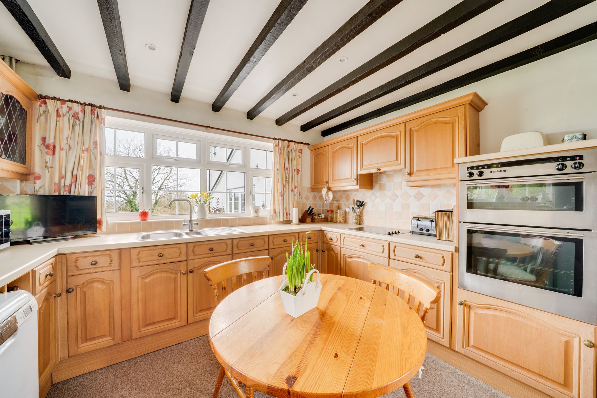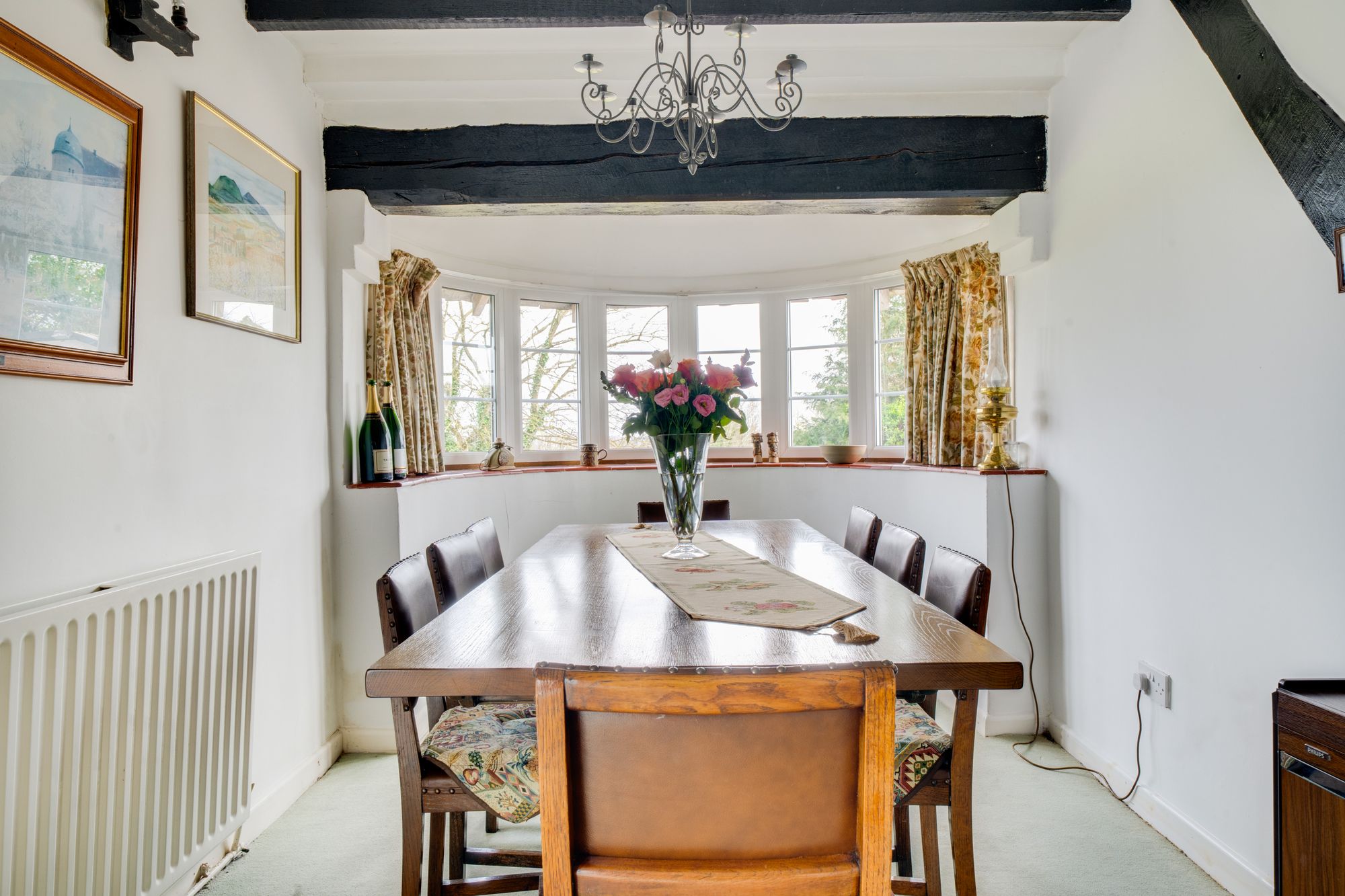 The accommodation is arranged over two floors and opens from the reception hall into a welcoming layout ideally suited to both family life and entertaining. The principal reception space is particularly appealing, with a substantial living room centred around an impressive inglenook-style fireplace and exposed timbers, creating a wonderfully atmospheric heart to the home. In addition, there is a separate sitting room of notable length, filled with natural light and enjoying an attractive curved bay, providing a versatile second reception area with ample space for relaxed seating or more formal entertaining.