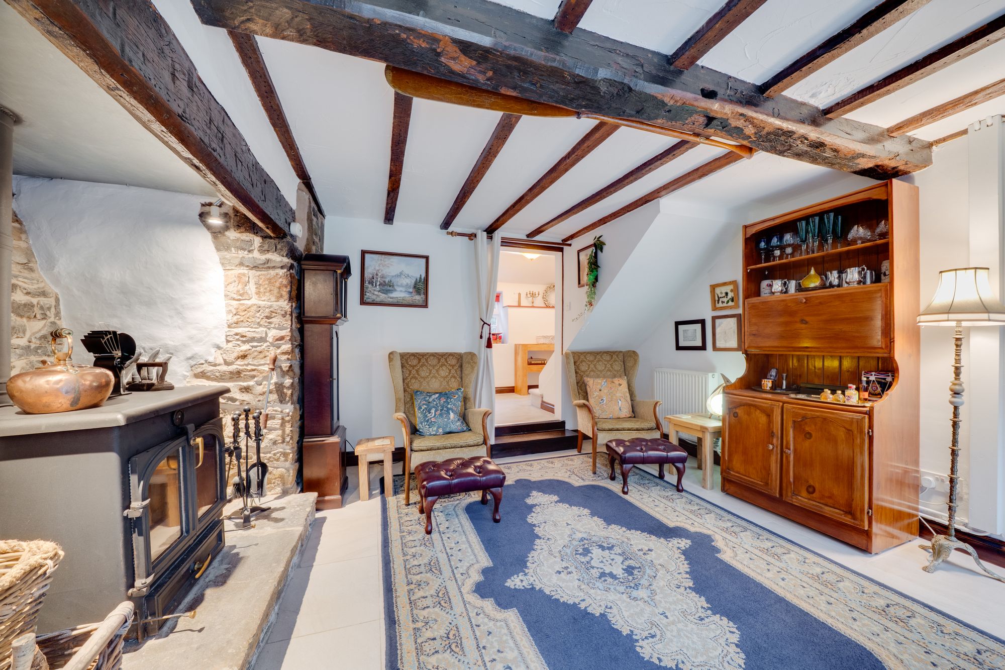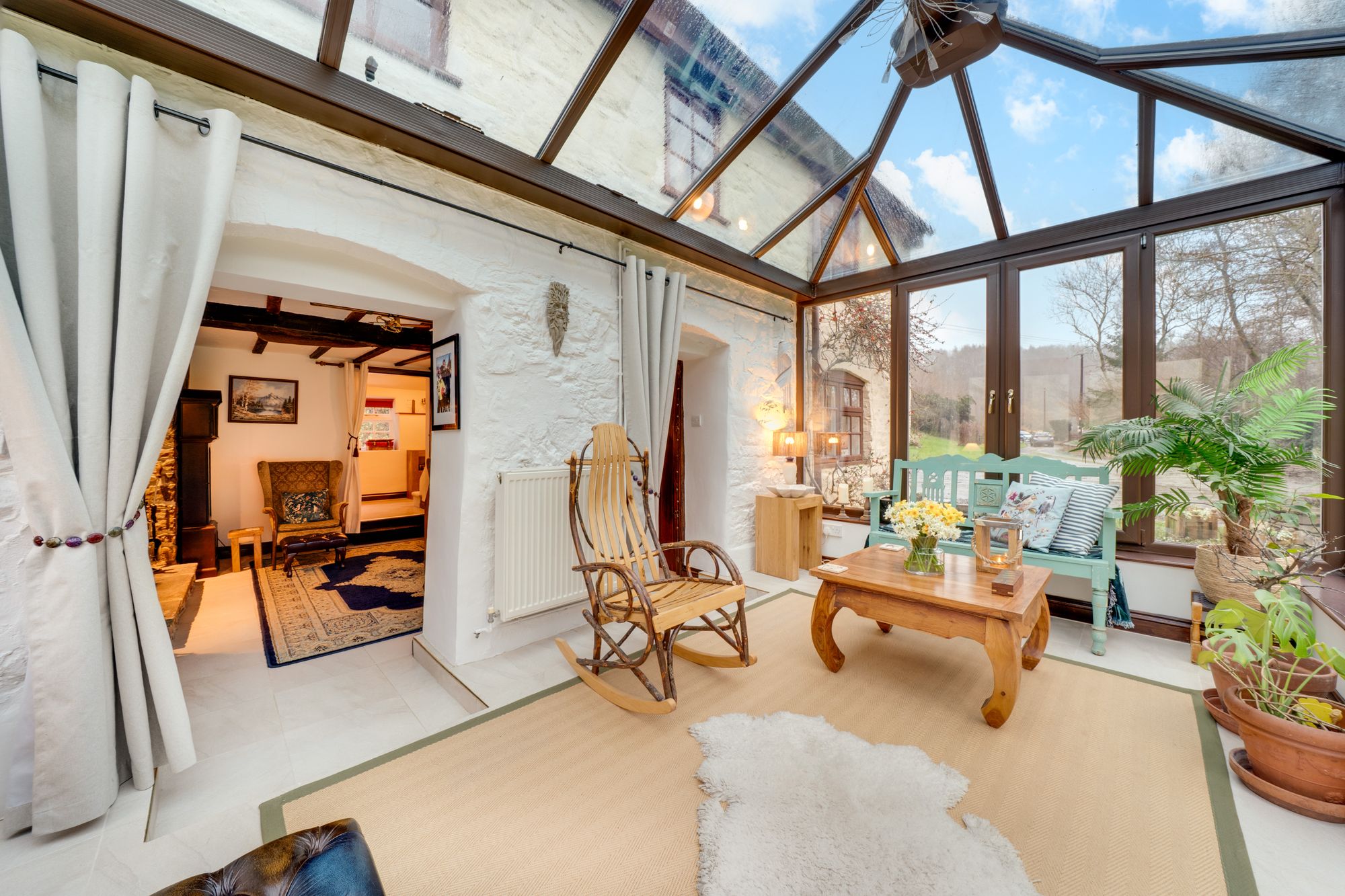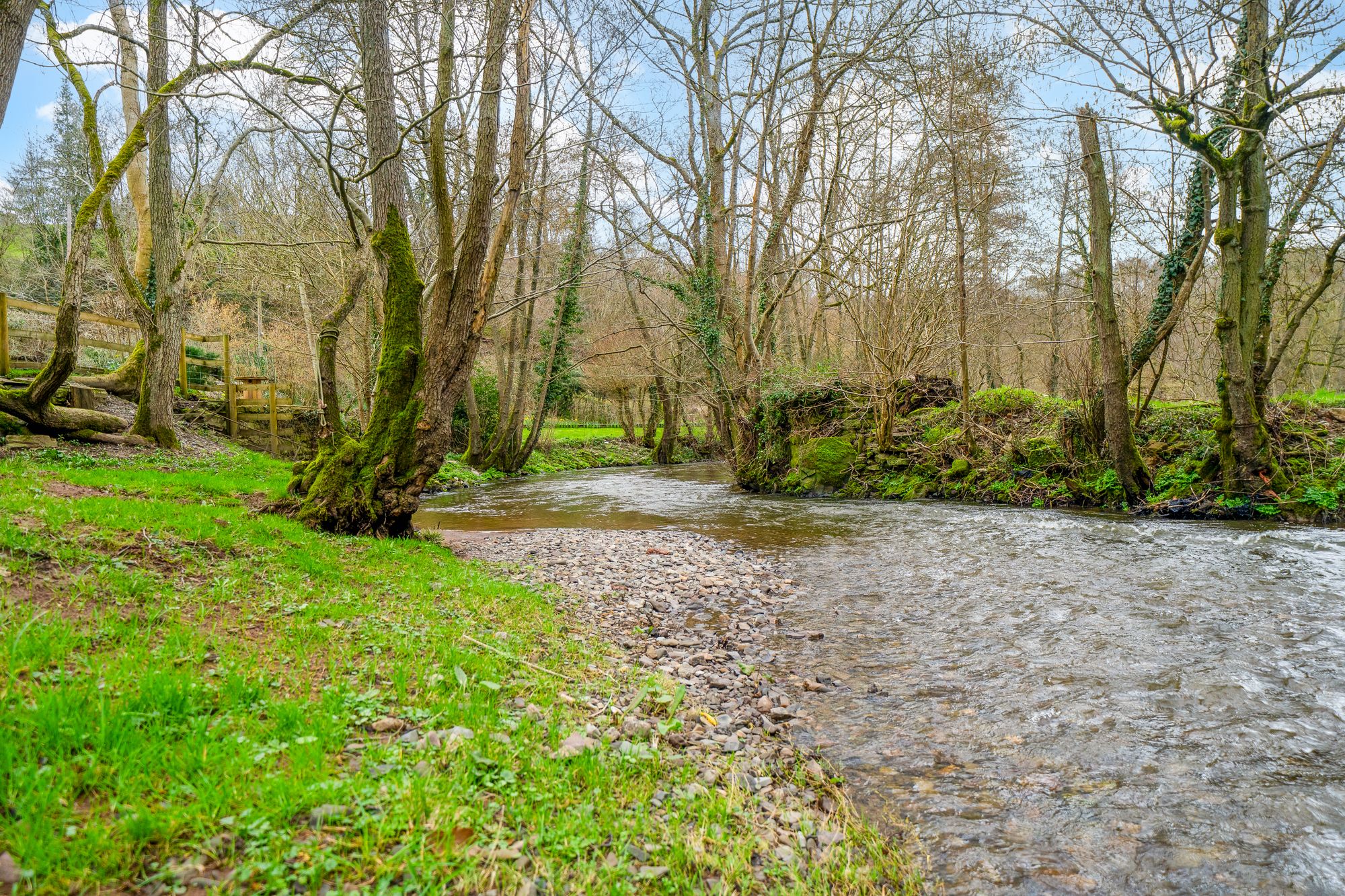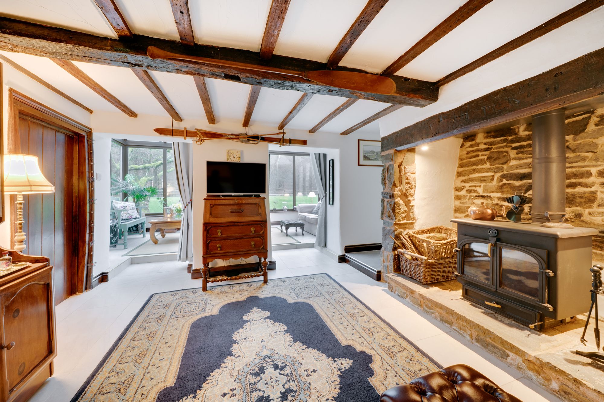 The cottage retains its historic character, with exposed beams, thick stone walls, and traditional features. From the entrance hall with stone floor and exposed beams, the accommodation flows into a cosy sitting room, centred around a character stone inglenook fireplace with a large wood‑burning stove, opening into a bright conservatory offering wide‑ranging views across the garden, river, driveway and woodland ridge. A snug, currently used as a study, includes a second working fireplace. The timber farmhouse kitchen is spacious and well-equipped, featuring integrated appliances, exposed beams, dual‑aspect windows and French doors opening to the patio. A utility room adjoins the kitchen, and a ground‑floor shower room provides further convenience.