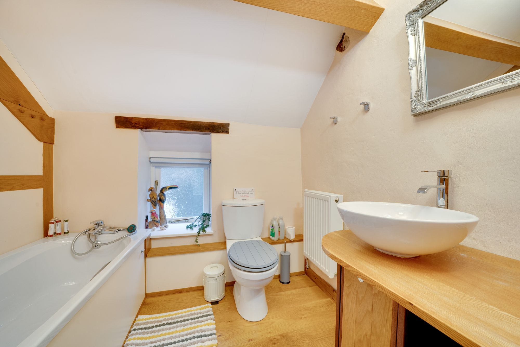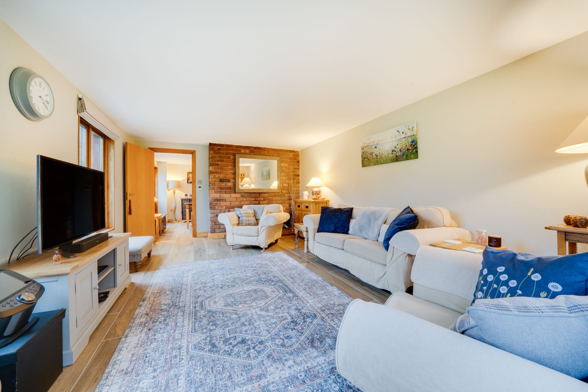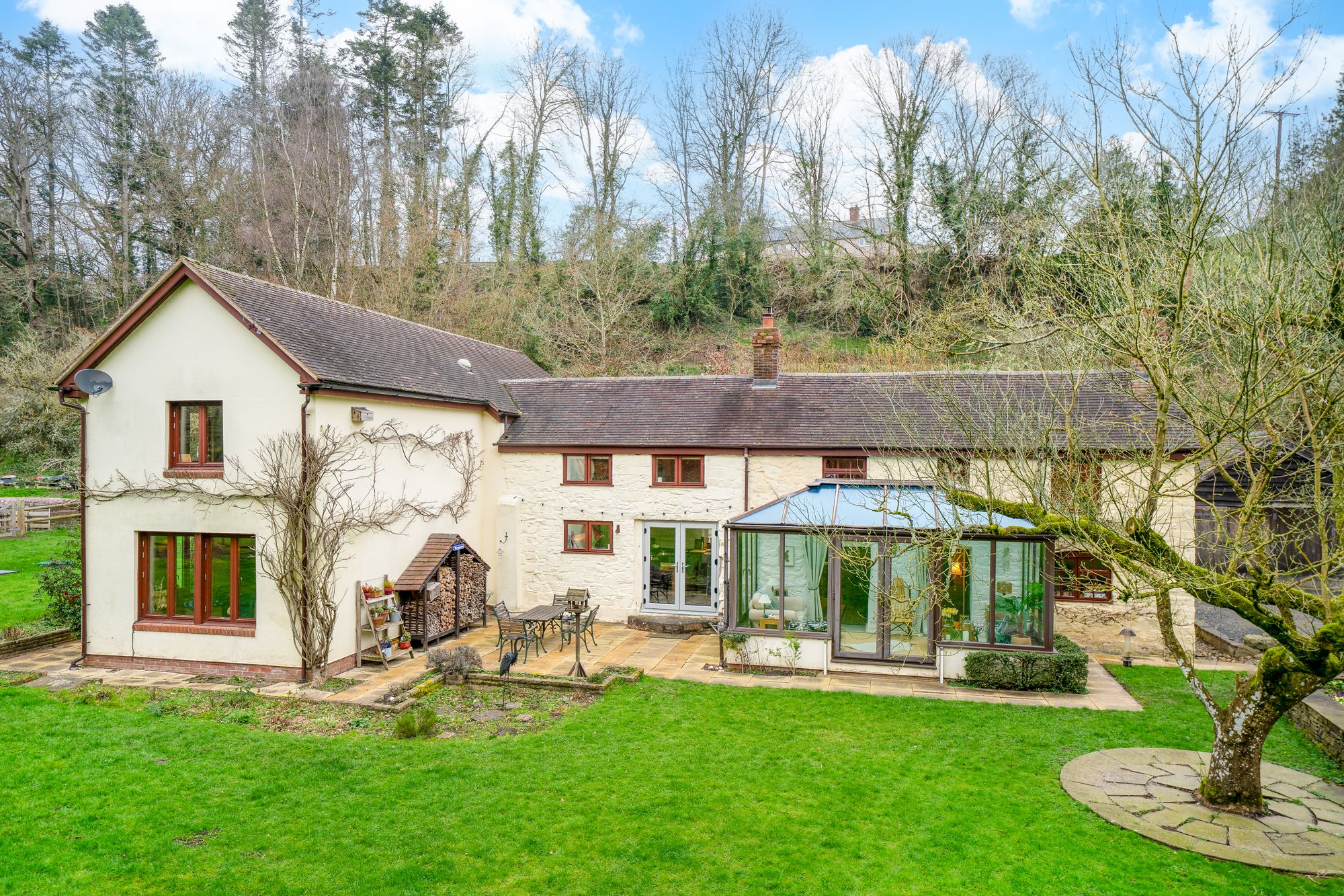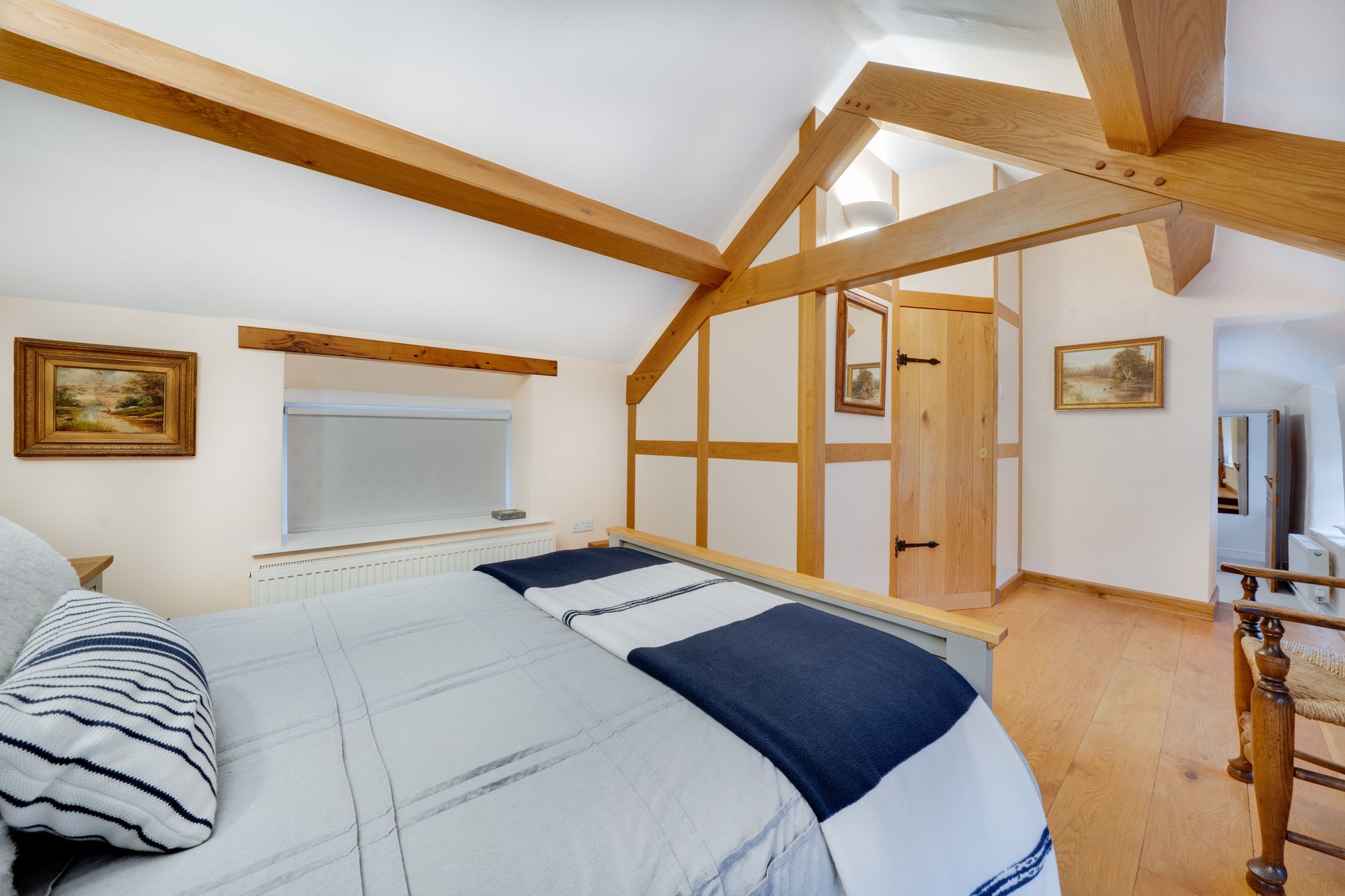 The cottage retains its historic character, with exposed beams, thick stone walls, and traditional features. From the entrance hall with stone floor and exposed beams, the accommodation flows into a cosy sitting room, centred around a character stone inglenook fireplace with a large wood‑burning stove, opening into a bright conservatory offering wide‑ranging views across the garden, river, driveway and woodland ridge. A snug, currently used as a study, includes a second working fireplace. The timber farmhouse kitchen is spacious and well-equipped, featuring integrated appliances, exposed beams, dual‑aspect windows and French doors opening to the patio. A utility room adjoins the kitchen, and a ground‑floor shower room provides further convenience.