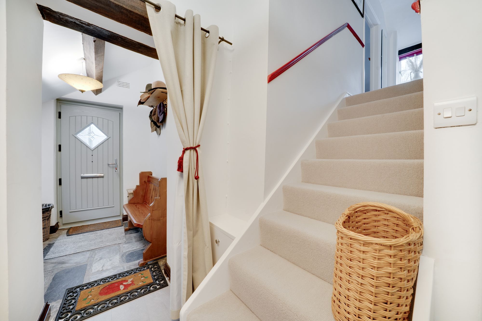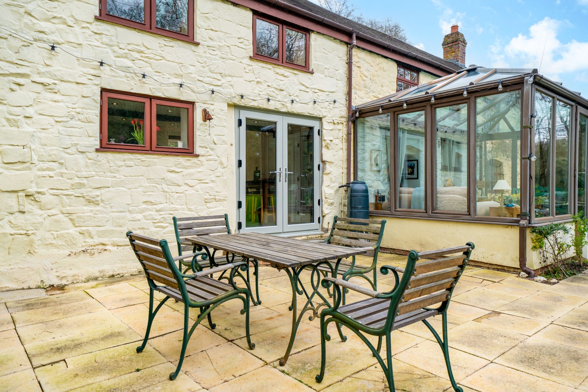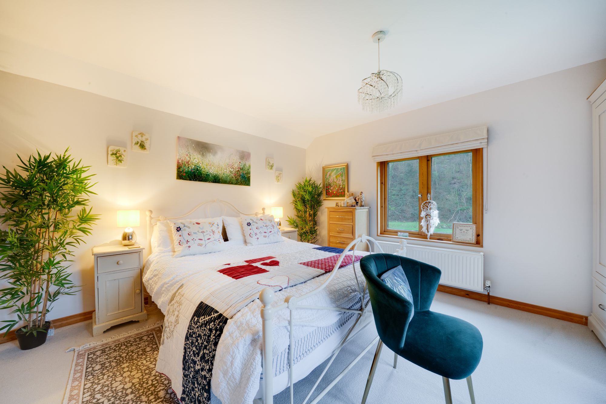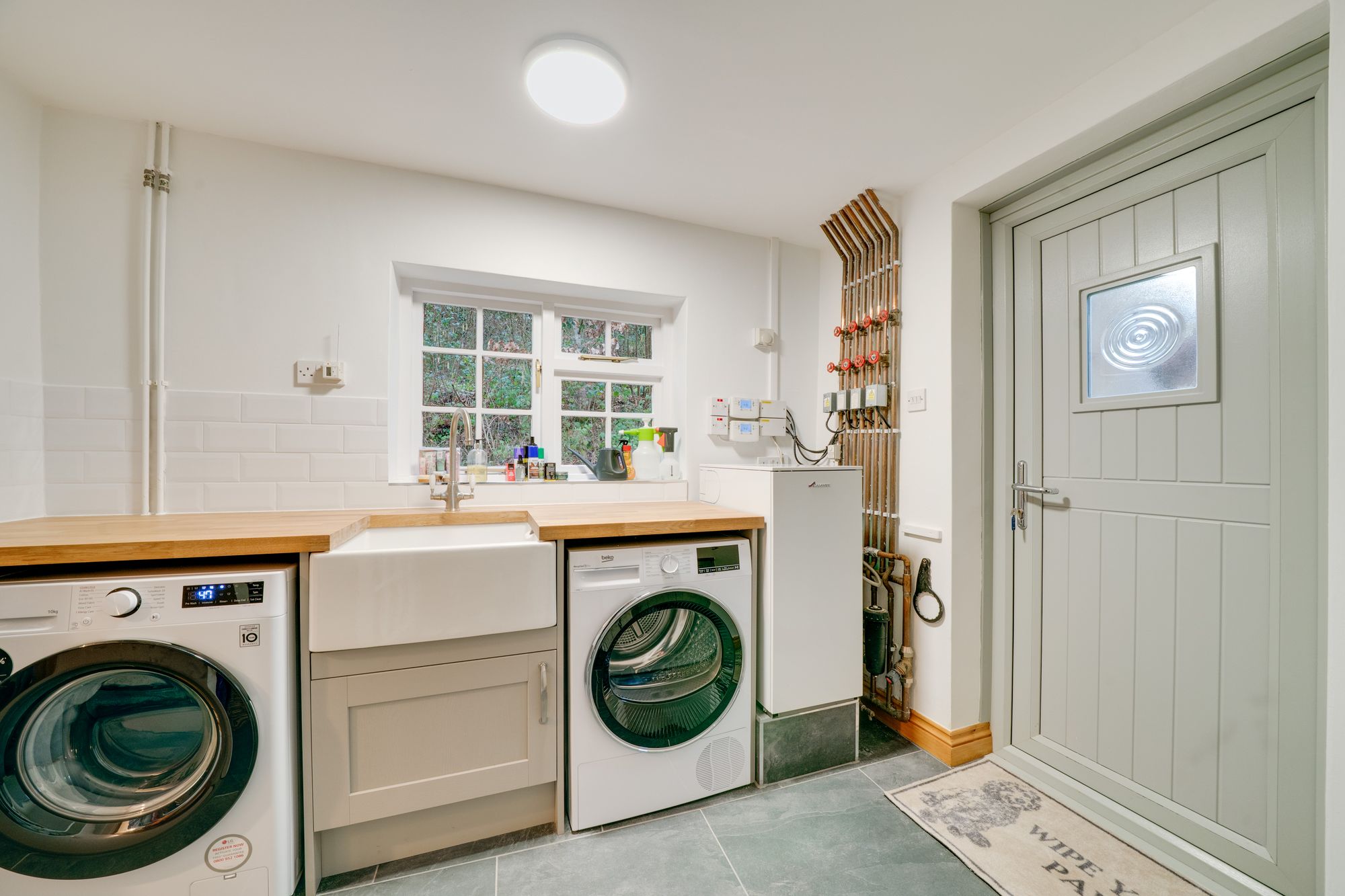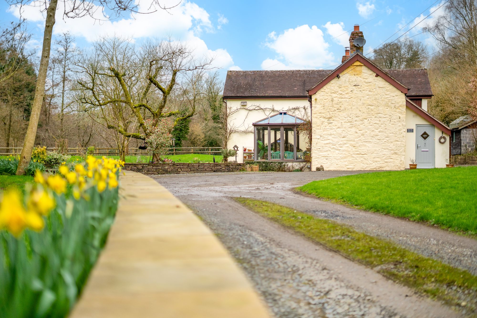 The cottage retains its historic character, with exposed beams, thick stone walls, and traditional features. From the entrance hall with stone floor and exposed beams, the accommodation flows into a cosy sitting room, centred around a character stone inglenook fireplace with a large wood‑burning stove, opening into a bright conservatory offering wide‑ranging views across the garden, river, driveway and woodland ridge. A snug, currently used as a study, includes a second working fireplace. The timber farmhouse kitchen is spacious and well-equipped, featuring integrated appliances, exposed beams, dual‑aspect windows and French doors opening to the patio. A utility room adjoins the kitchen, and a ground‑floor shower room provides further convenience.