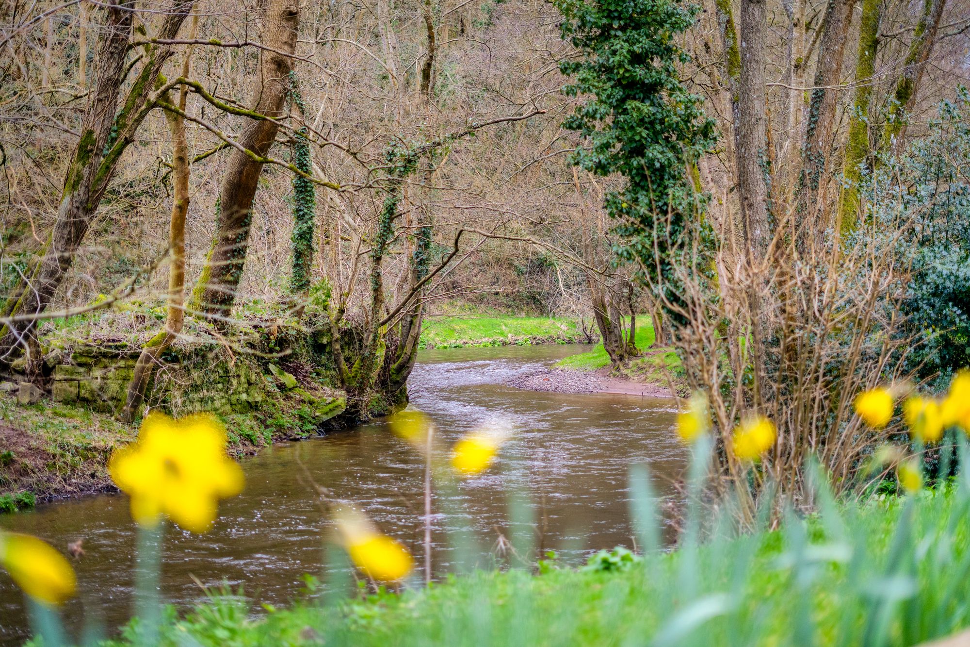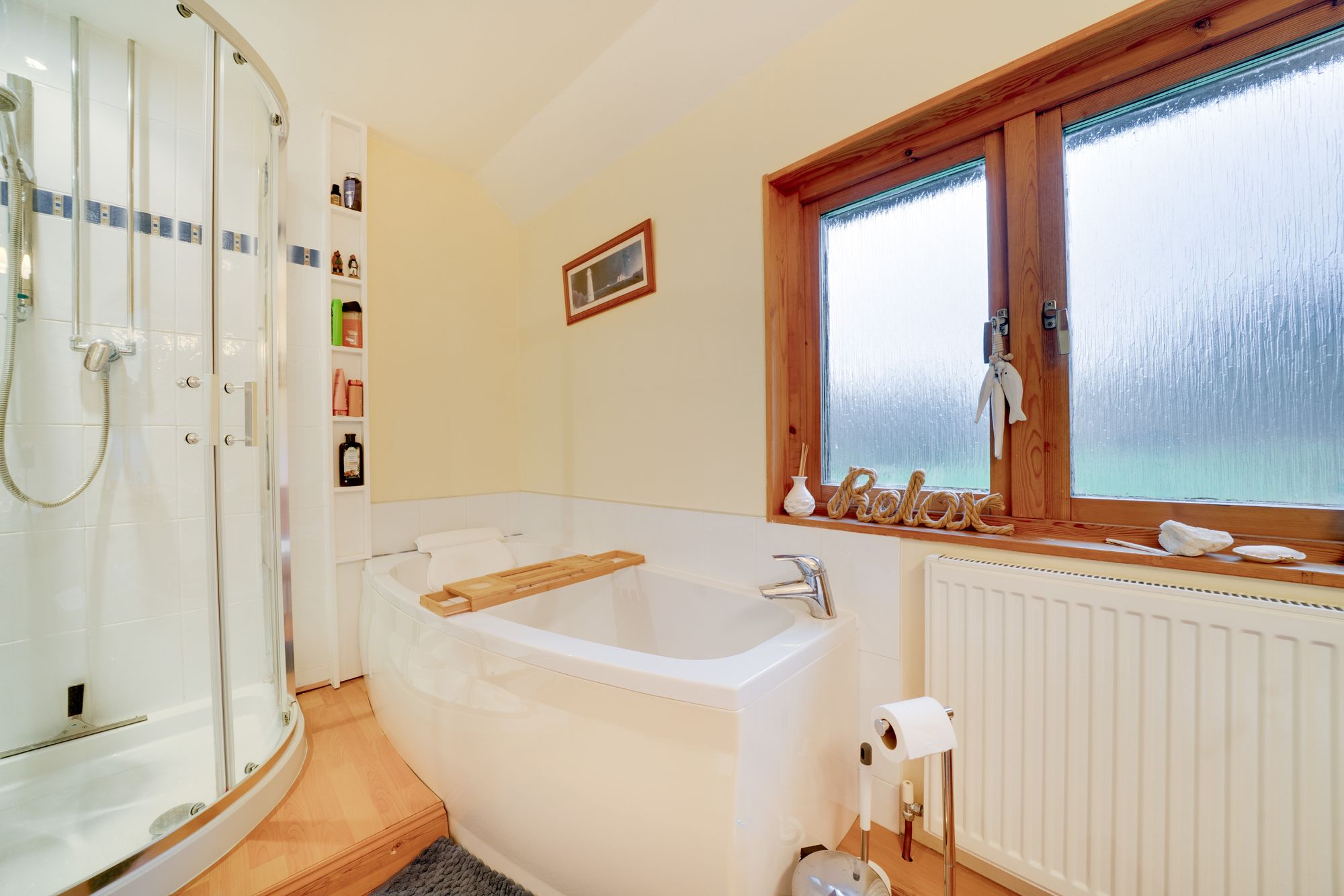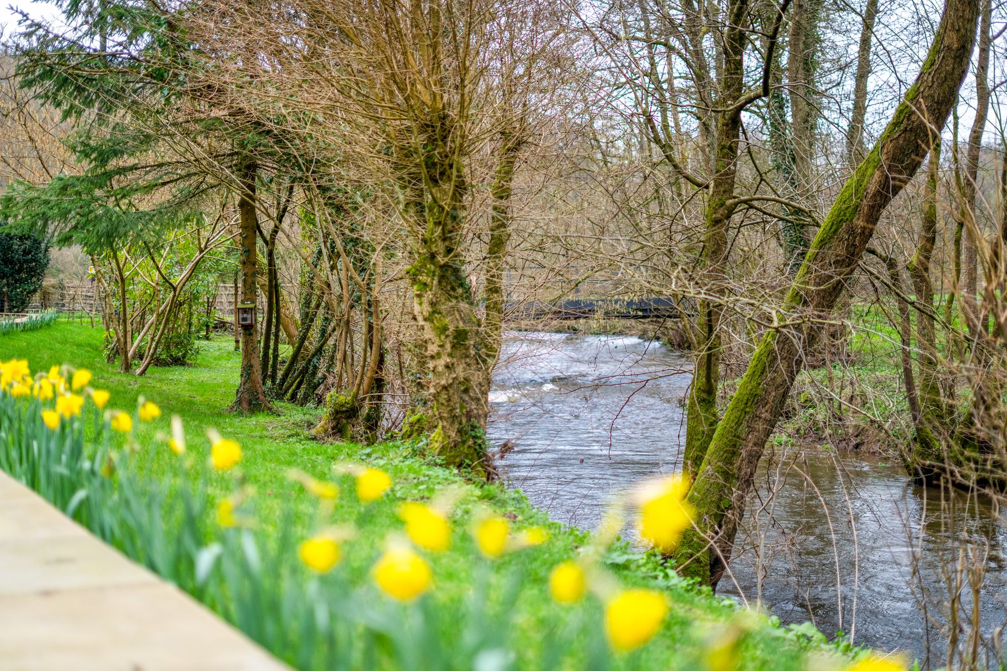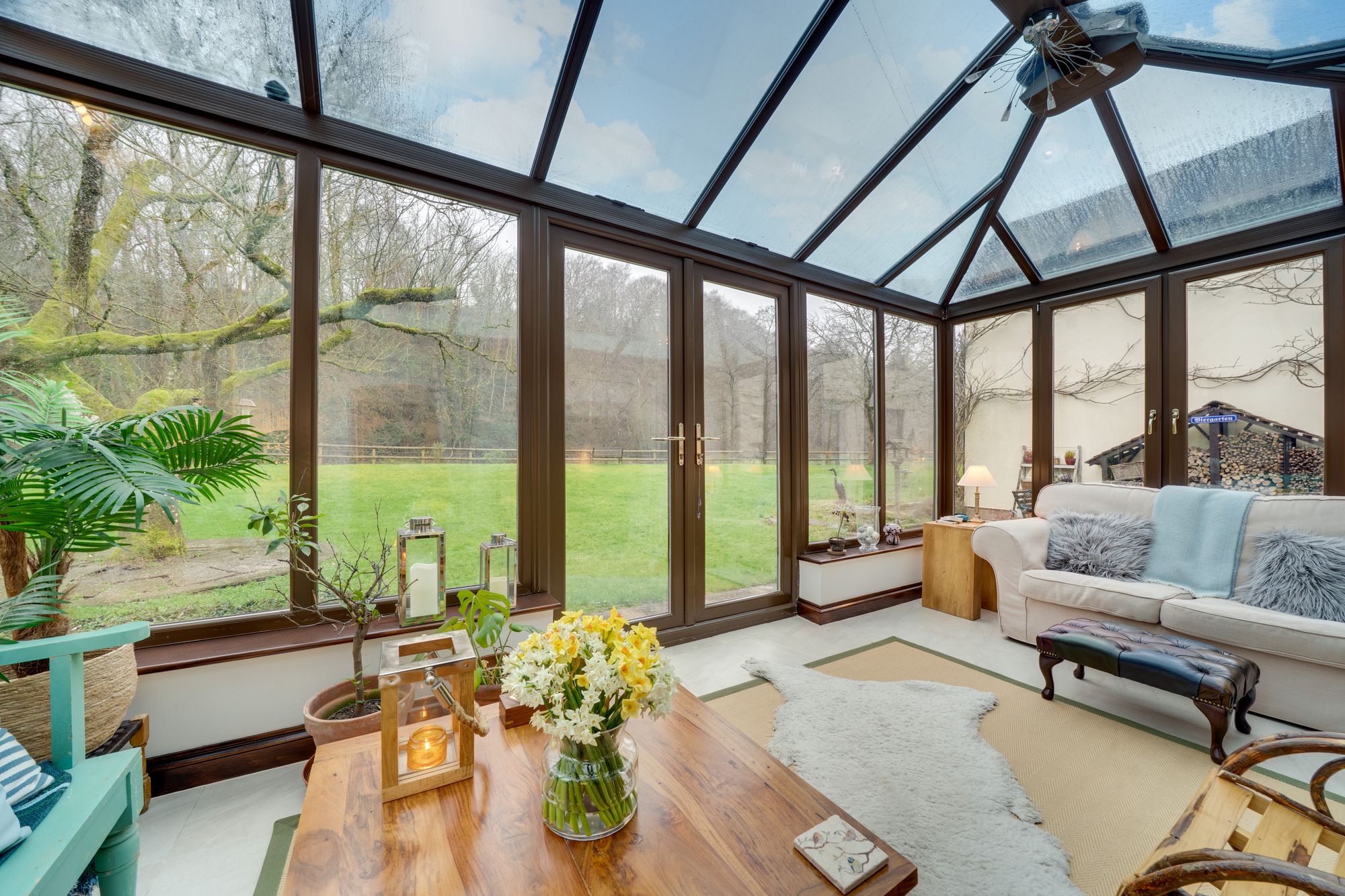 The cottage retains its historic character, with exposed beams, thick stone walls, and traditional features. From the entrance hall with stone floor and exposed beams, the accommodation flows into a cosy sitting room, centred around a character stone inglenook fireplace with a large wood‑burning stove, opening into a bright conservatory offering wide‑ranging views across the garden, river, driveway and woodland ridge. A snug, currently used as a study, includes a second working fireplace. The timber farmhouse kitchen is spacious and well-equipped, featuring integrated appliances, exposed beams, dual‑aspect windows and French doors opening to the patio. A utility room adjoins the kitchen, and a ground‑floor shower room provides further convenience.