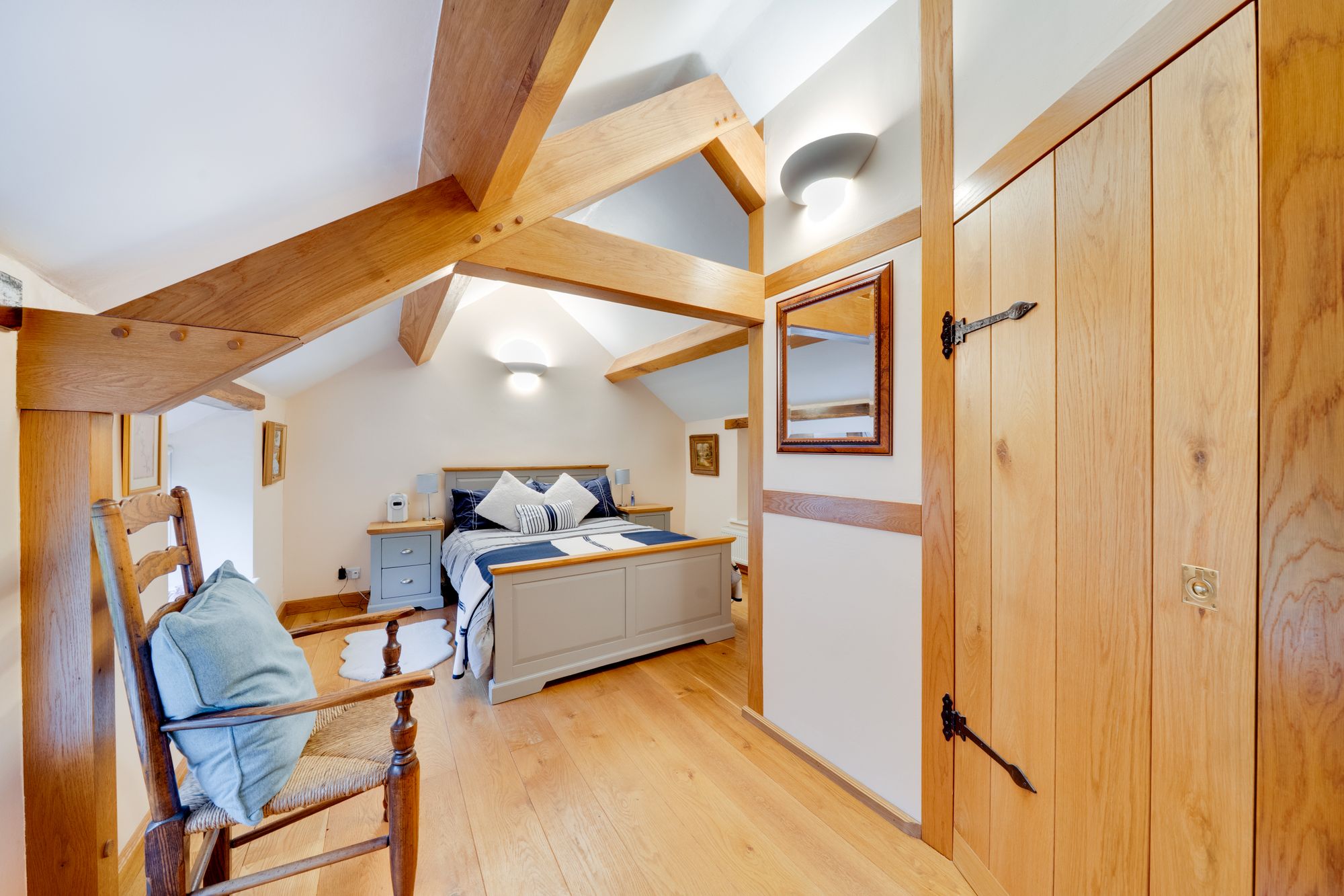 A staircase from the front hallway leads to two bedrooms within the cottage section: a generous principal suite with dressing room and ensuite bathroom, and a double/twin bedroom.