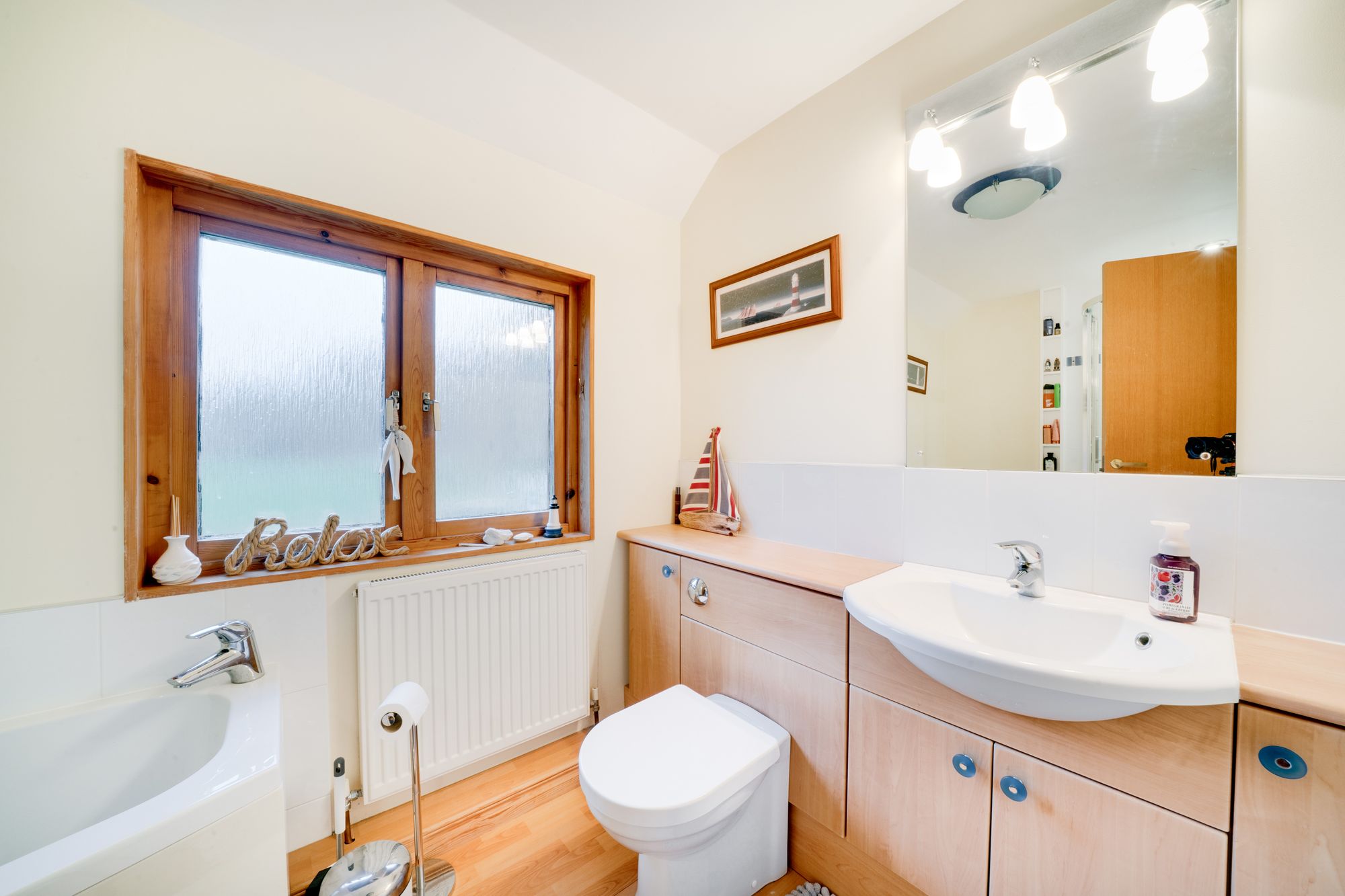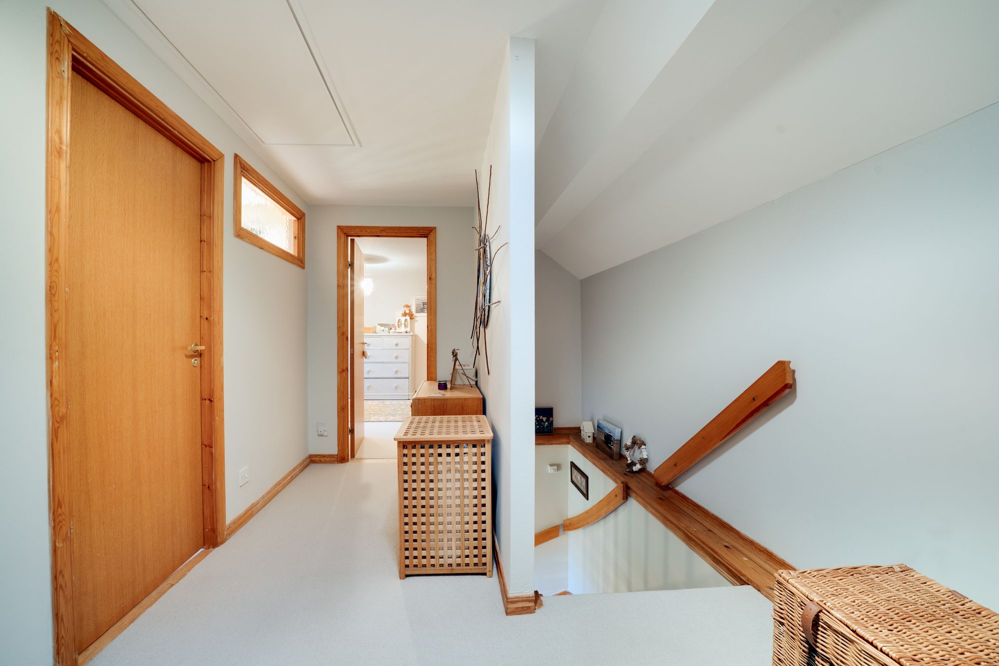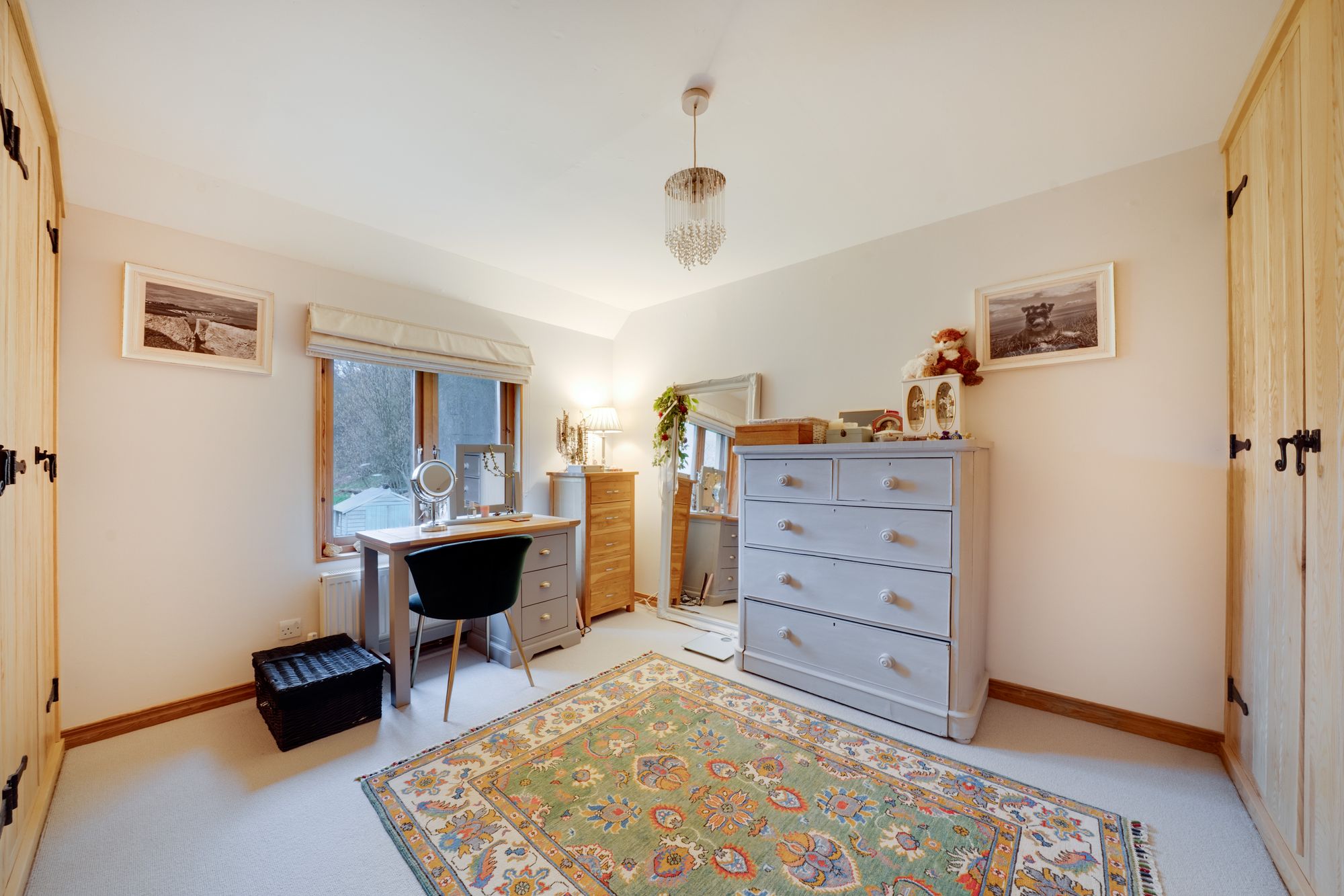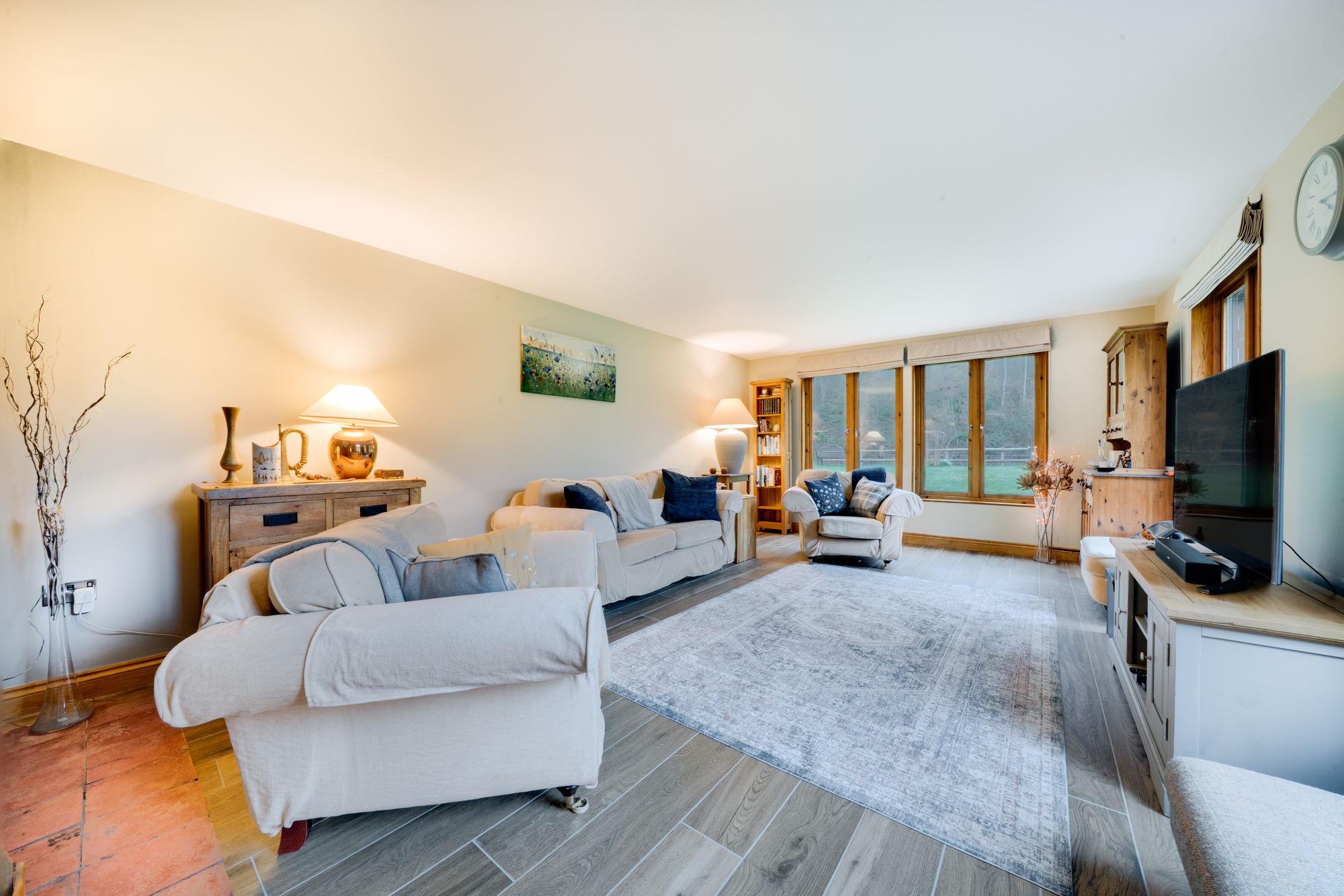 To the rear, the contemporary Swedish House extension, designed with dual‑aspect windows, offers uninterrupted views across the field, river, woodland and towards the Long Mynd. This section of the property has its own external entrance and underfloor heating and could function independently if required. The ground floor includes a large living room, a dining room, a downstairs WC and an additional kitchen space (currently used as a pantry). A feature open staircase leads to three further bedrooms and a bathroom, providing flexibility for extended family or guest accommodation.