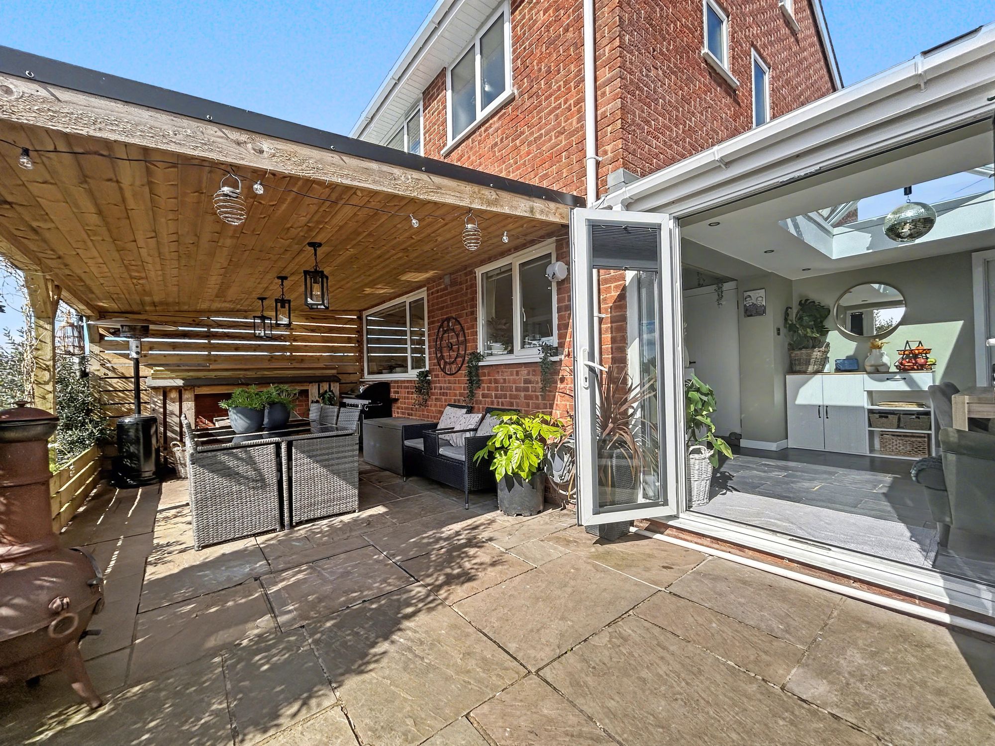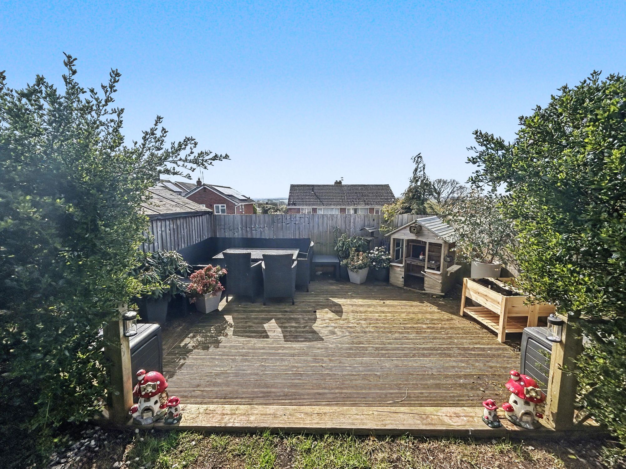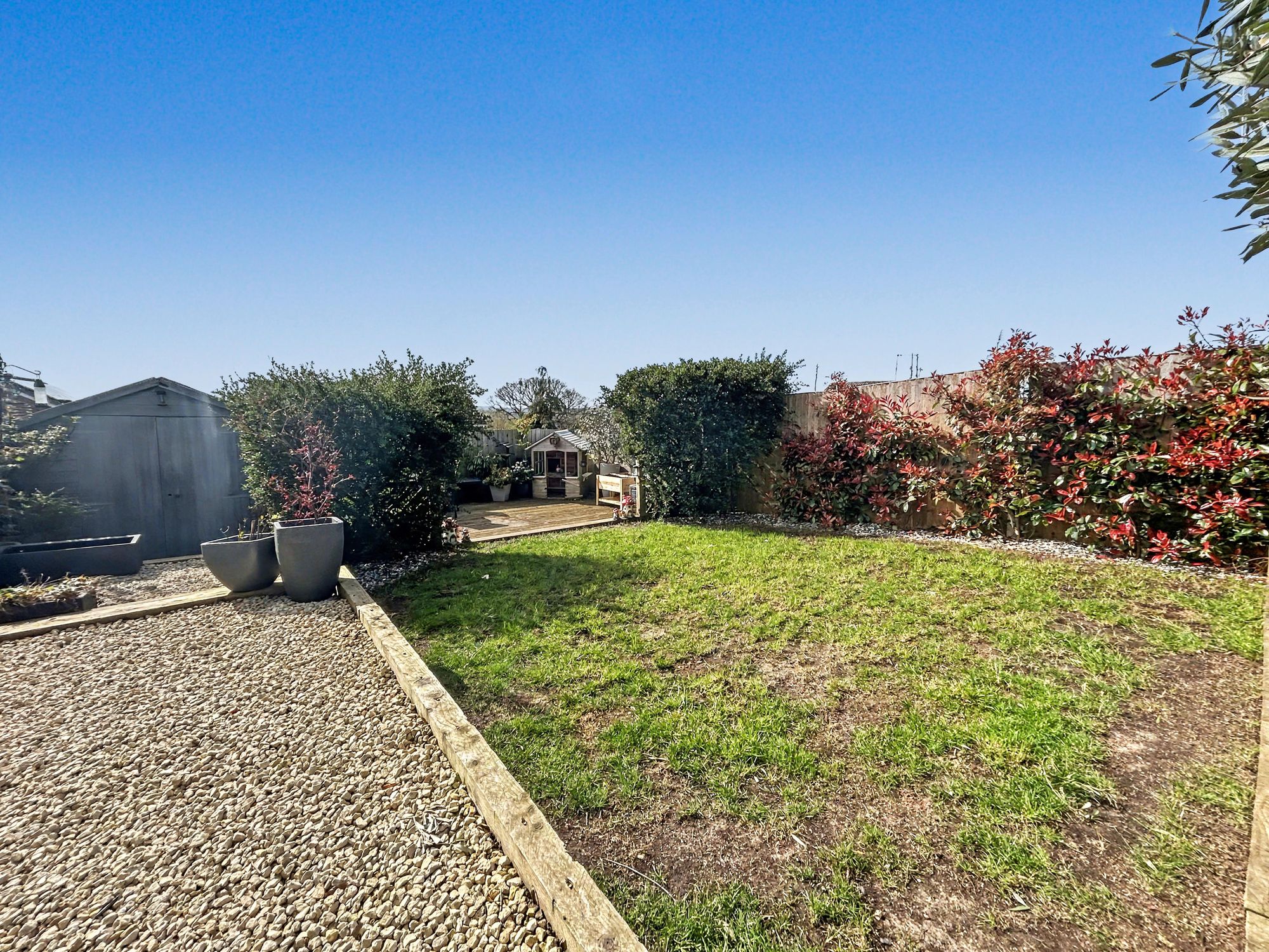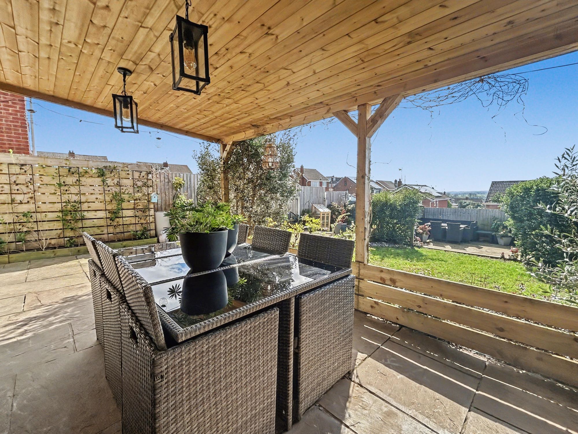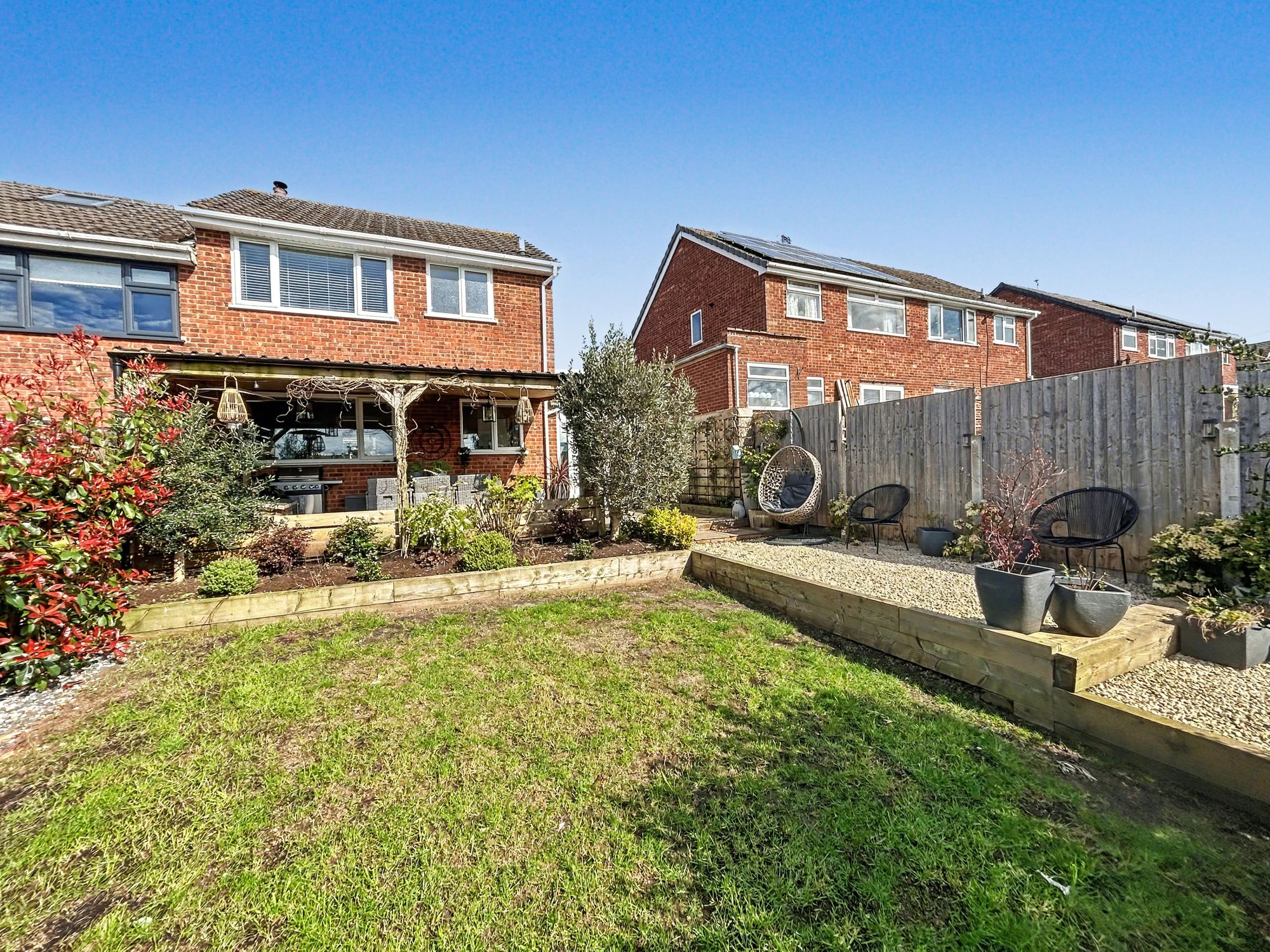 The rear garden has been landscaped to create an impressive outdoor space ideal for entertaining. Double doors from the kitchen open onto a paved patio with a substantial timber pergola, forming an attractive seating area. Steps lead down to a further gravelled seating area, lawn, raised beds, and a decking area to the rear. A large shed with power is also located at the end of the garden.