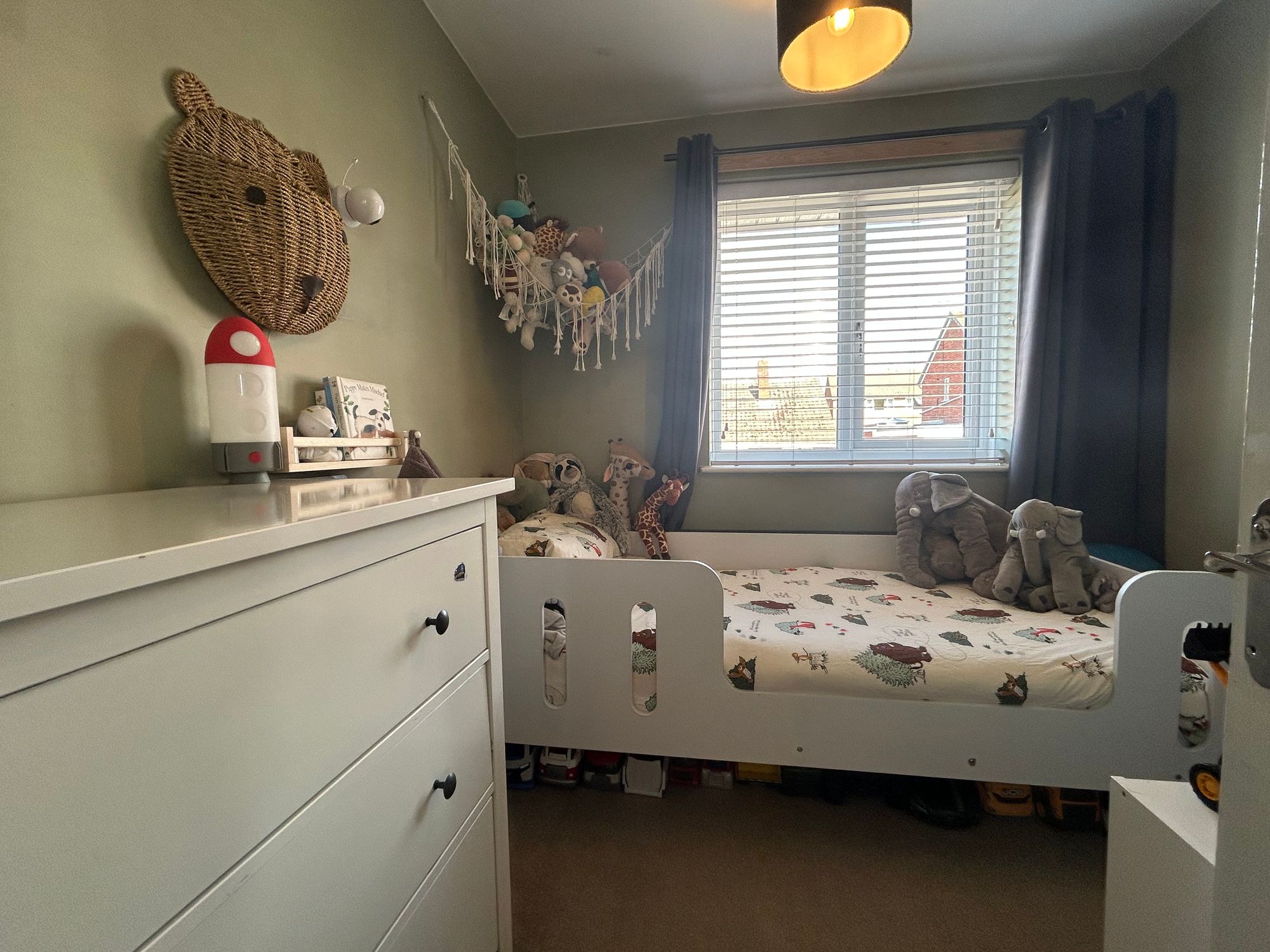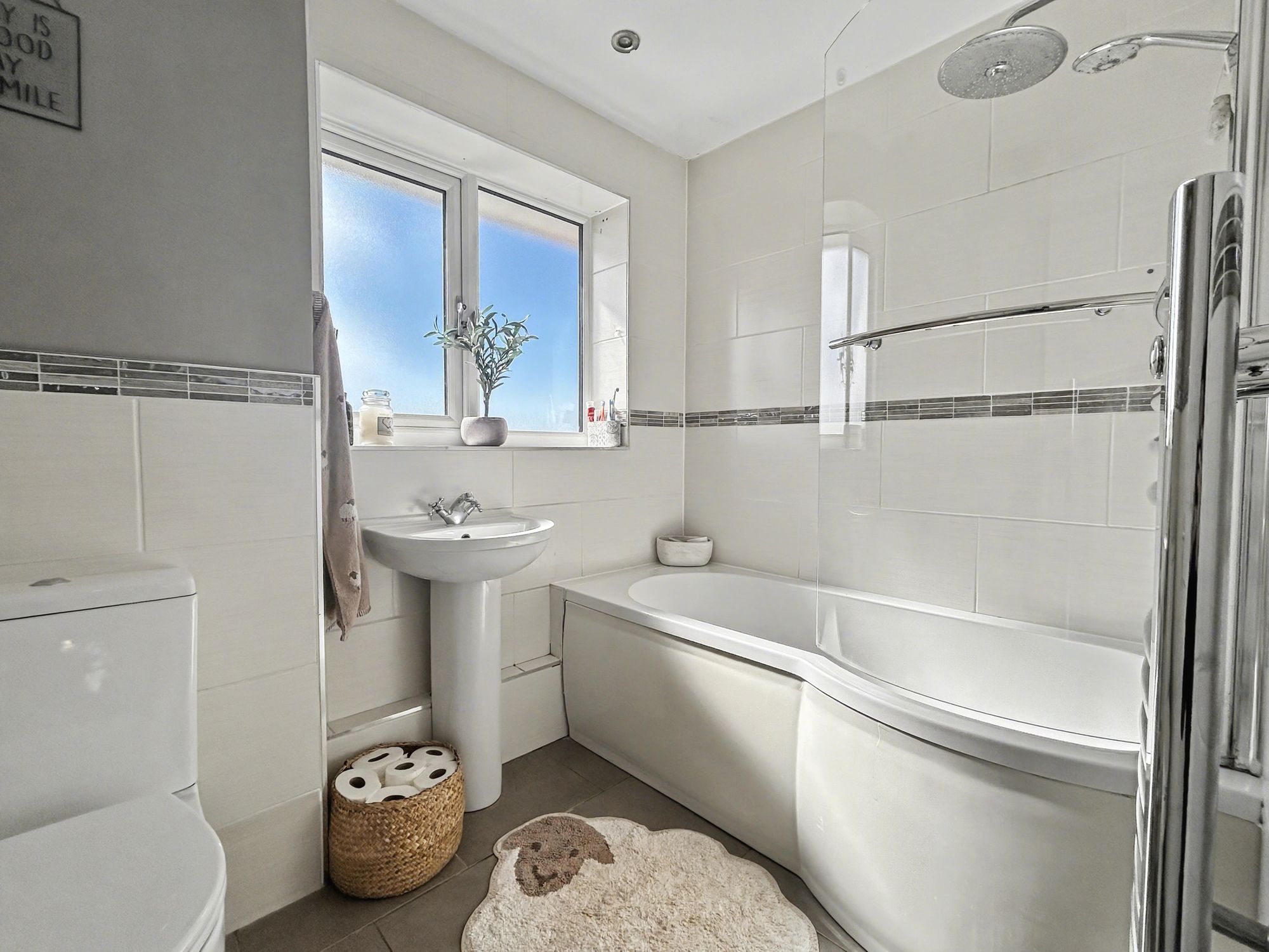 To the first floor, the landing includes an airing cupboard housing the hot water cylinder. There are three generously sized bedrooms, two of which benefit from fitted or built-in storage. The bathroom is fitted with an electric shower over the bath, alongside a separate WC.