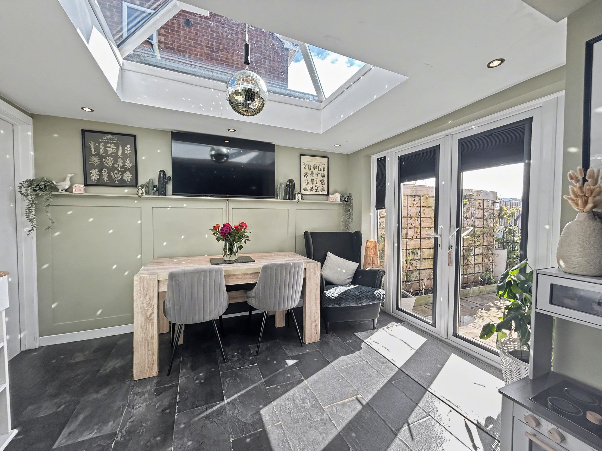 The open-plan kitchen diner has been thoughtfully designed with a range of base units and wall display cabinets, complemented by a built-in pantry and under-stairs storage cupboard. The dining area, complete with spotlighting, provides access to both the garage and the rear garden, with double doors opening directly onto the patio. Off the kitchen is a useful guest cloakroom/utility room, which also provides internal access to the garage.