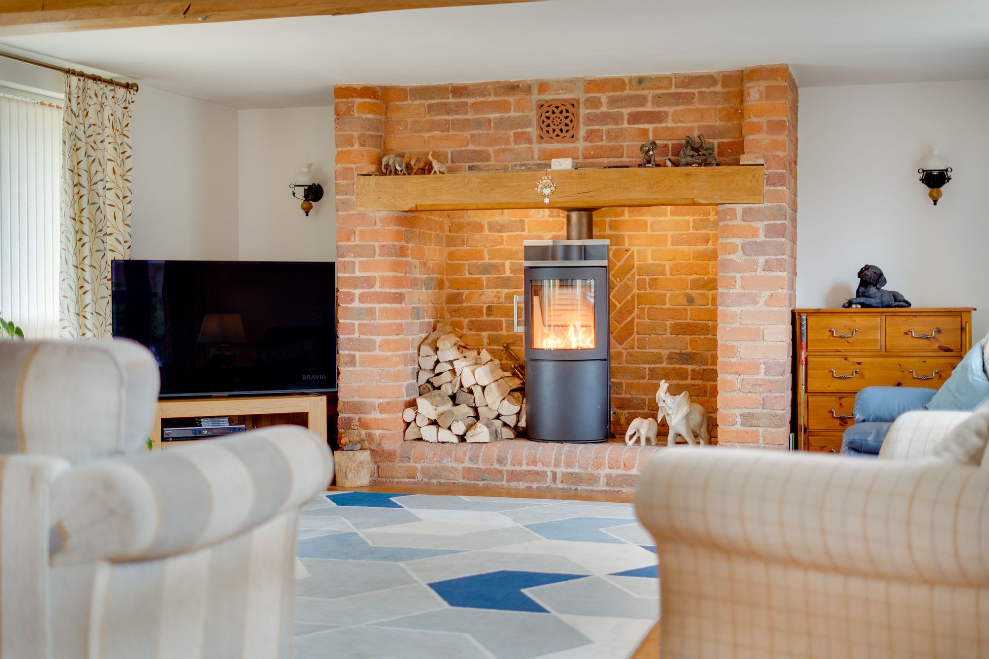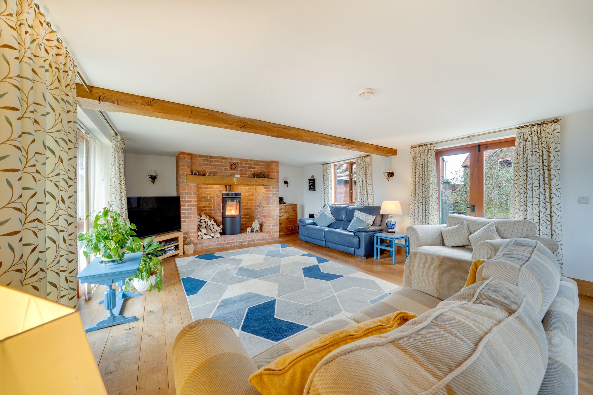 Living space is generous and thoughtfully arranged. The main reception room forms the heart of the home, flooded with natural light and anchored by a feature fireplace that creates a natural focal point. With ample room for both seating and dining, the space lends itself equally well to quiet evenings or entertaining on a larger scale, with glazed doors offering a connection to the gardens beyond.