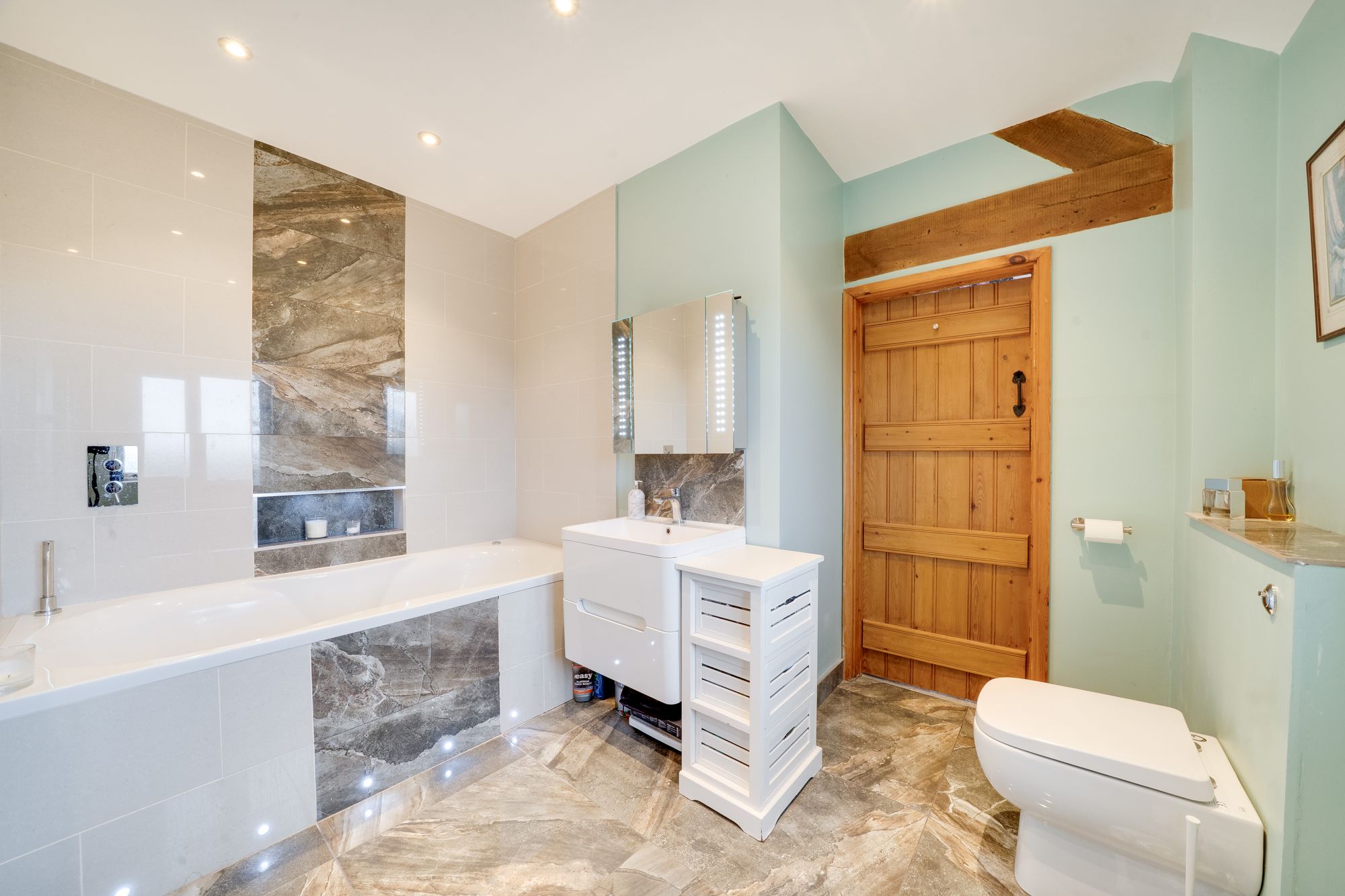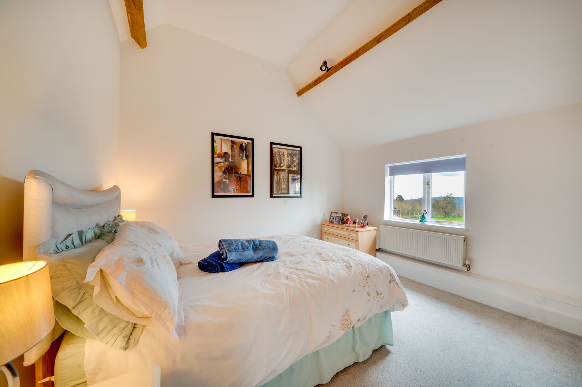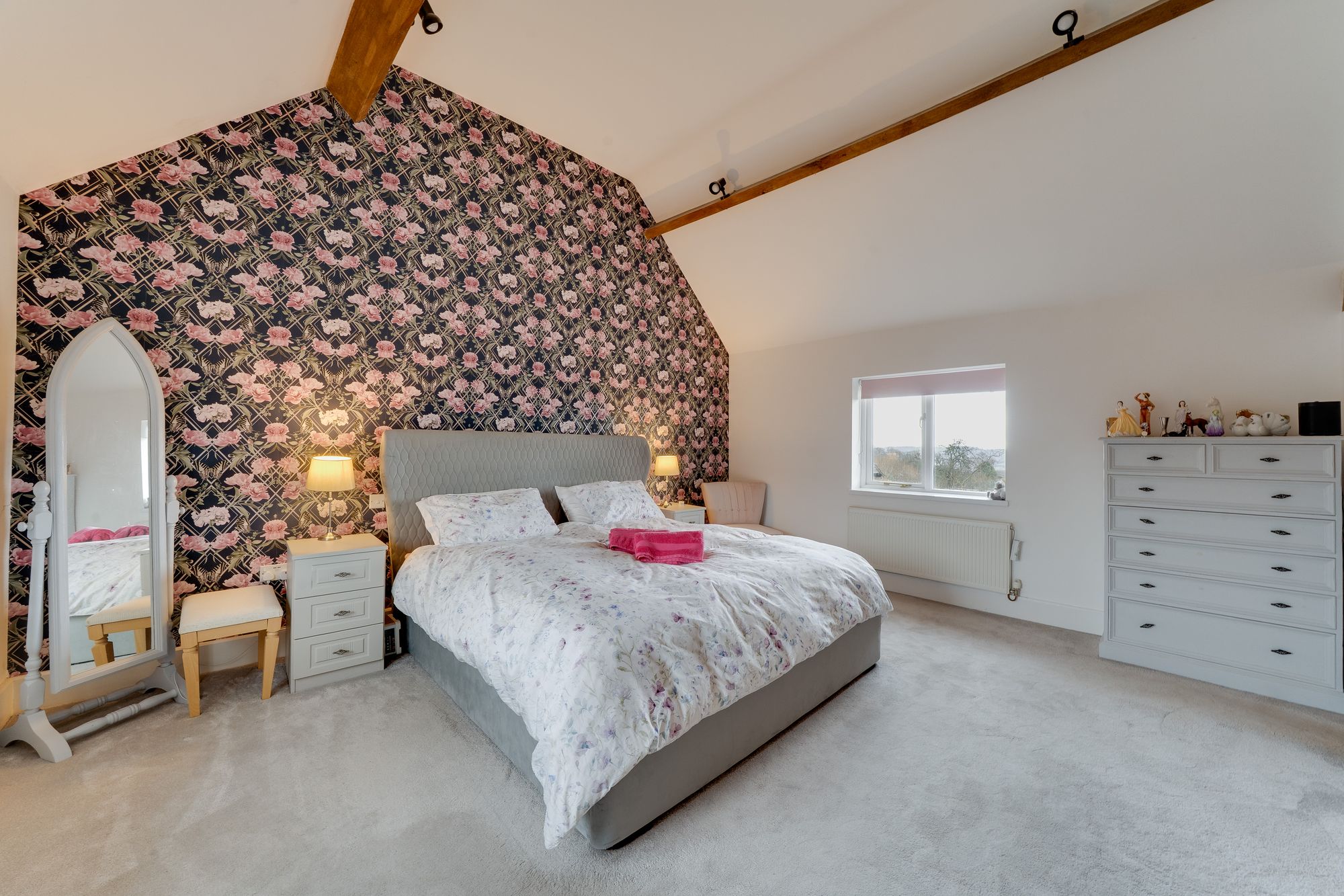 Upstairs, the accommodation continues to impress. Three spacious double bedrooms are arranged off a soft-carpeted landing, each benefitting from built-in storage and its own ensuite, ensuring privacy and comfort for family members and guests alike. The principal bedroom is particularly noteworthy, featuring exposed beams, far-reaching countryside views and a luxurious ensuite bathroom with jacuzzi bath and separate shower.