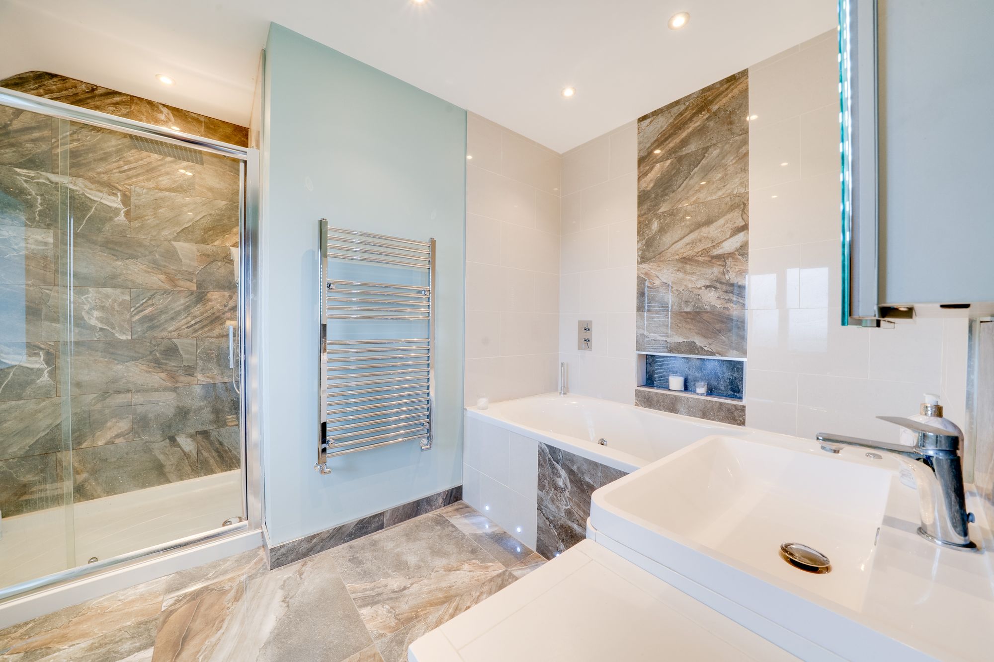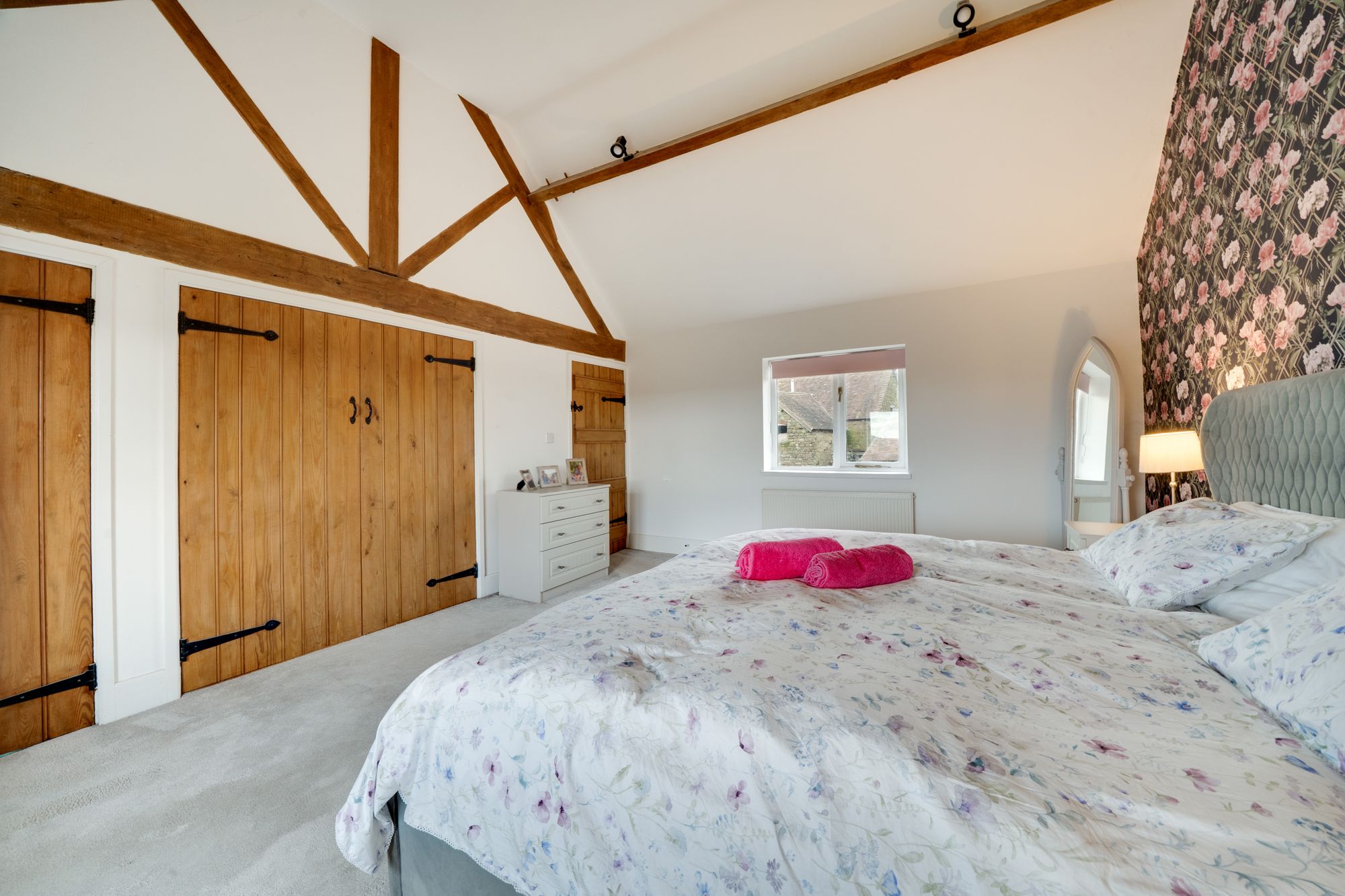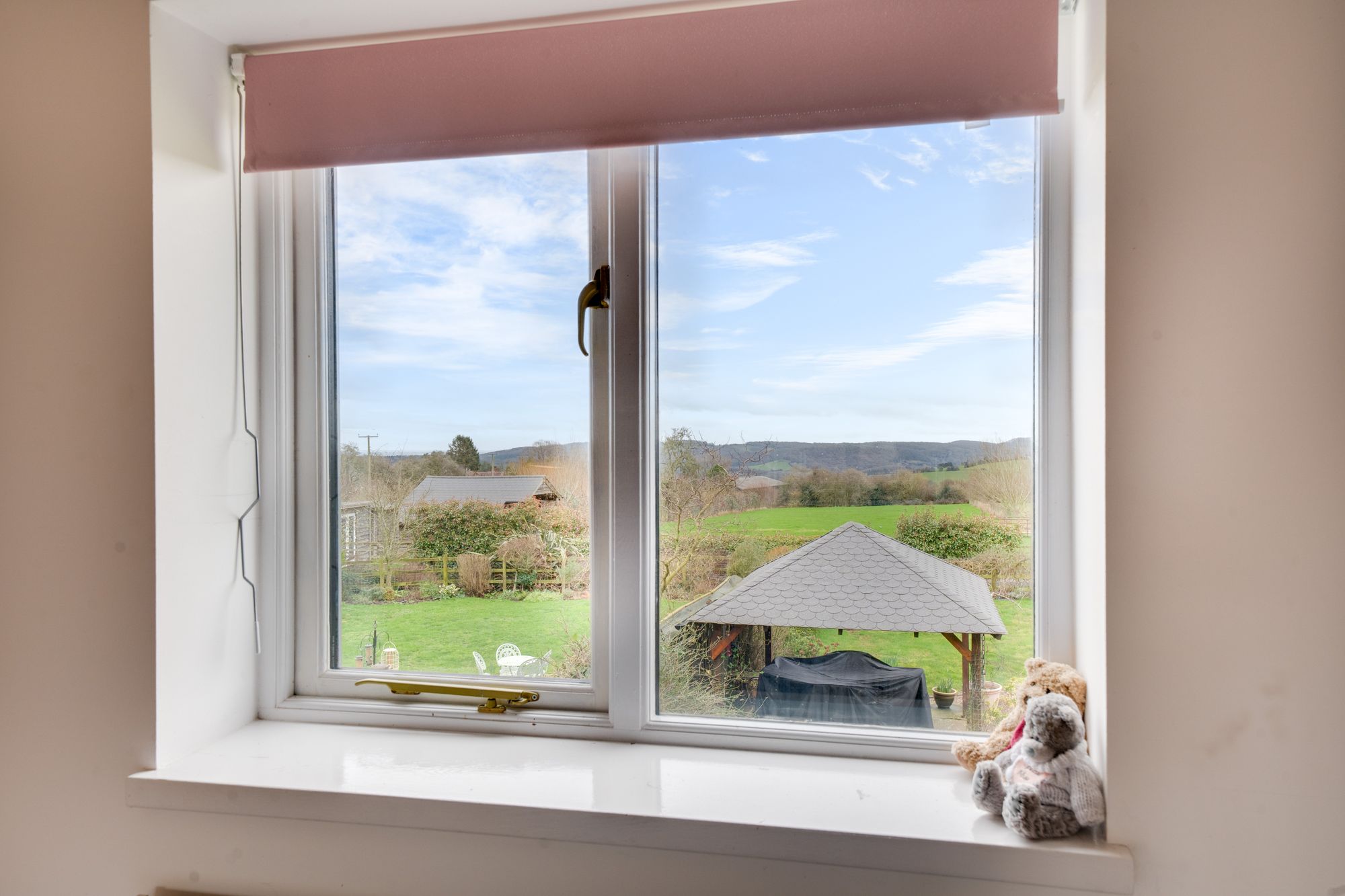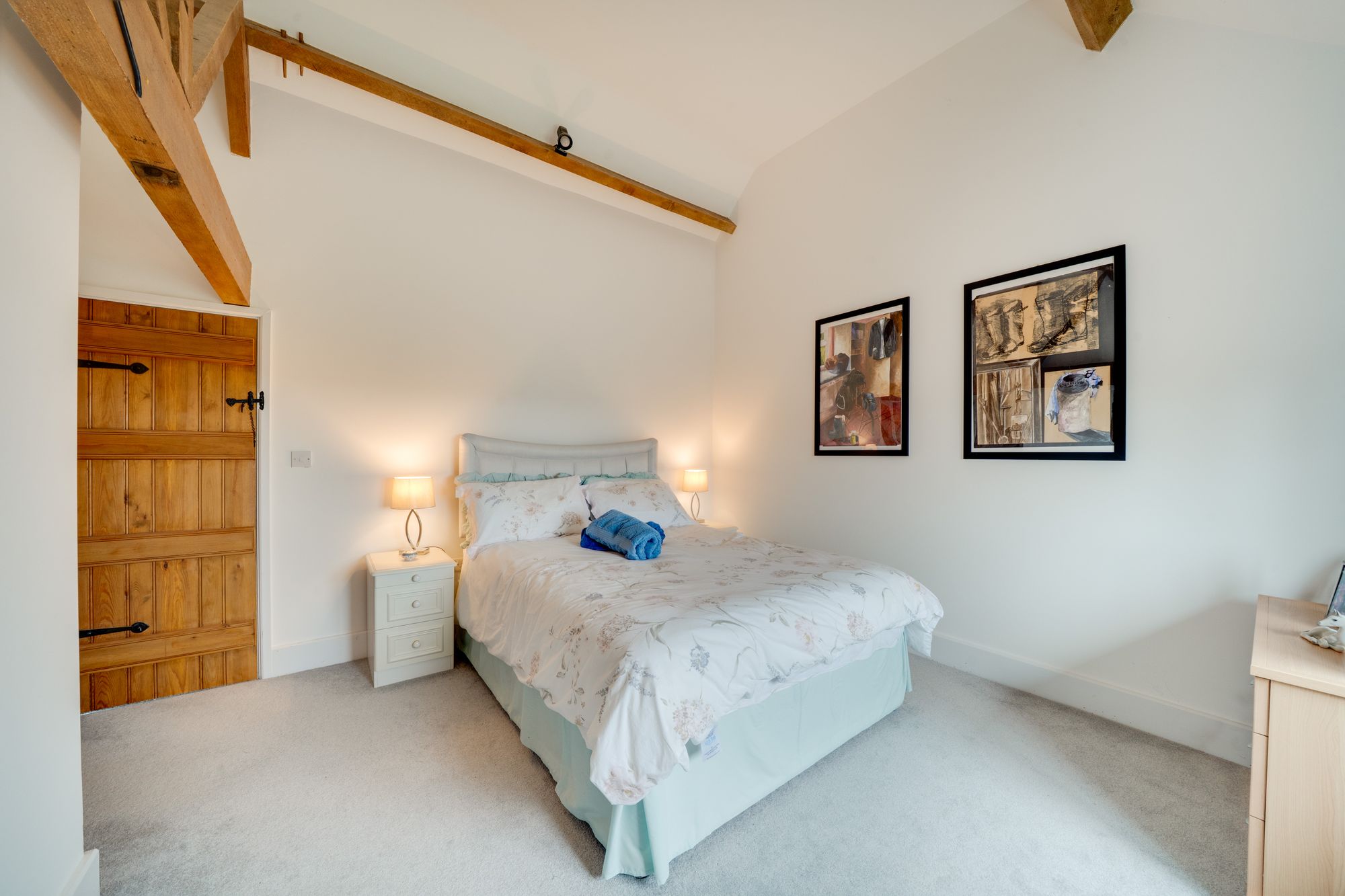 Upstairs, the accommodation continues to impress. Three spacious double bedrooms are arranged off a soft-carpeted landing, each benefitting from built-in storage and its own ensuite, ensuring privacy and comfort for family members and guests alike. The principal bedroom is particularly noteworthy, featuring exposed beams, far-reaching countryside views and a luxurious ensuite bathroom with jacuzzi bath and separate shower.