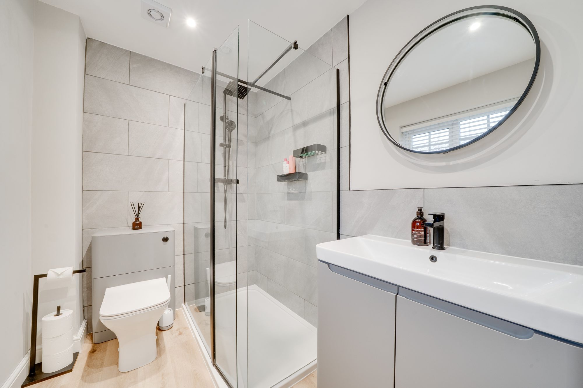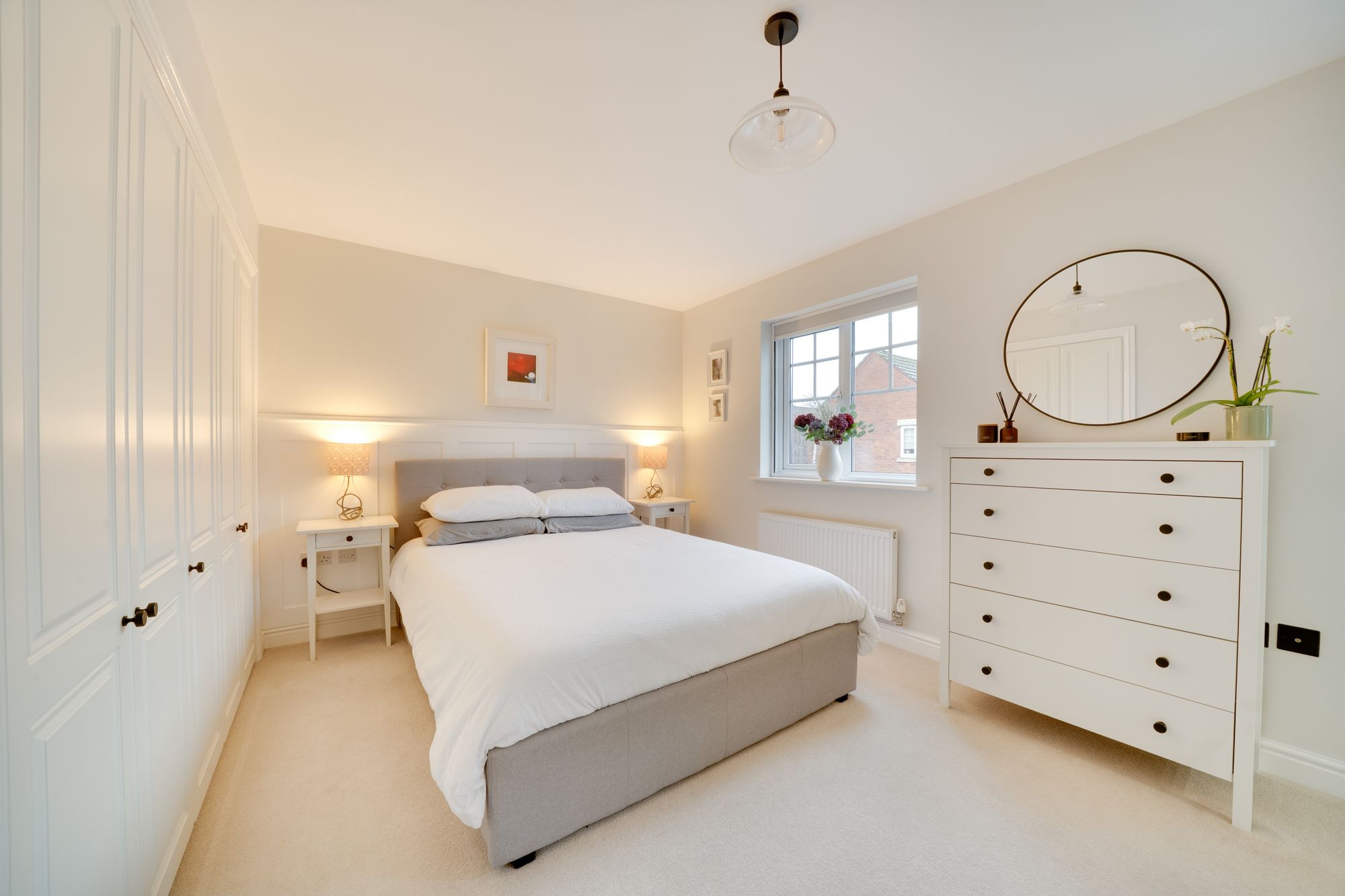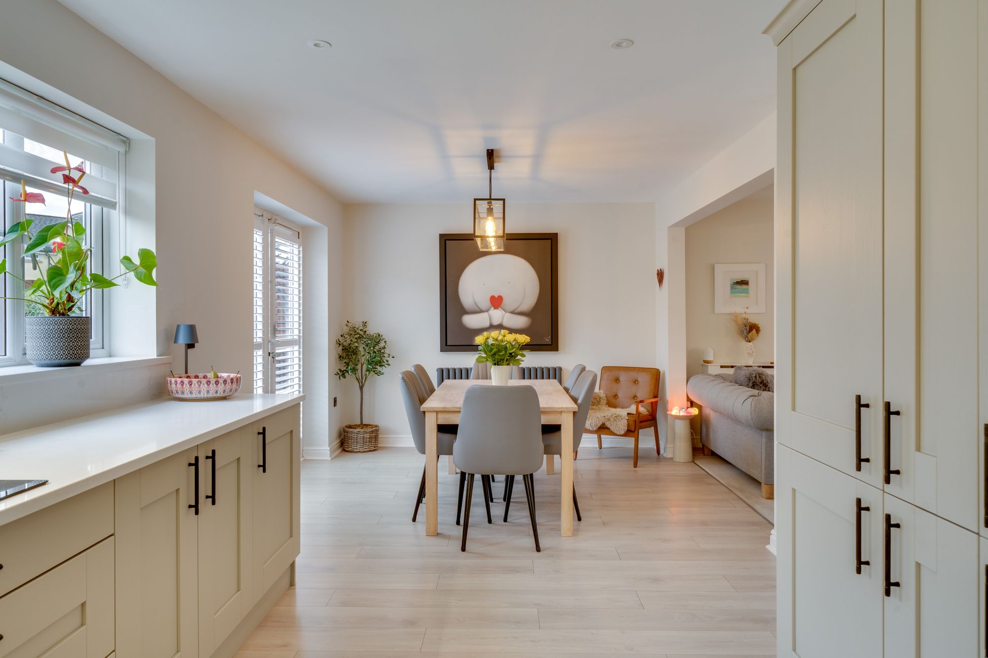 The spacious breakfast kitchen has been stylishly refitted and offers a generous range of wall and base units with quartz worktops, inset sink unit and splash backs. Also offering integrated oven, and induction hob with extractor over. The open plan dining area offers generous space for a dining suite and enjoys French doors providing a pleasant aspect over the garden. Conveniently placed just off the kitchen area is a separate utility room, fitted with matching wall and base units, space for further appliances, and a side access door.