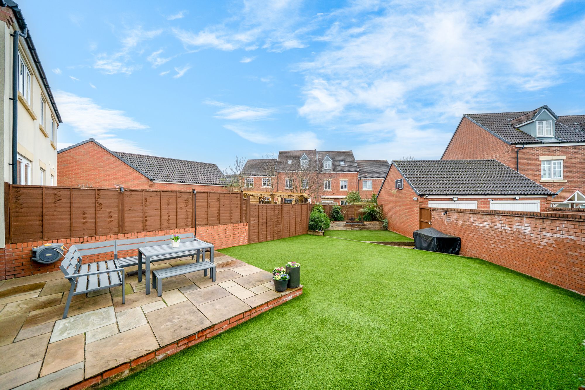 To the front of the property is a low-maintenance, full width, block paved forecourt. To the side of the property, the driveway affords off road parking and access to the garage with up and over front door, electric power & light, and side access door into the rear garden. The private rear garden has been attractively landscaped and is mainly laid with artificial grass for ease of maintenance. This level garden is ideal for families and those who enjoy outdoor entertaining, and is complete with raised railway sleeper flower beds with integral seating.