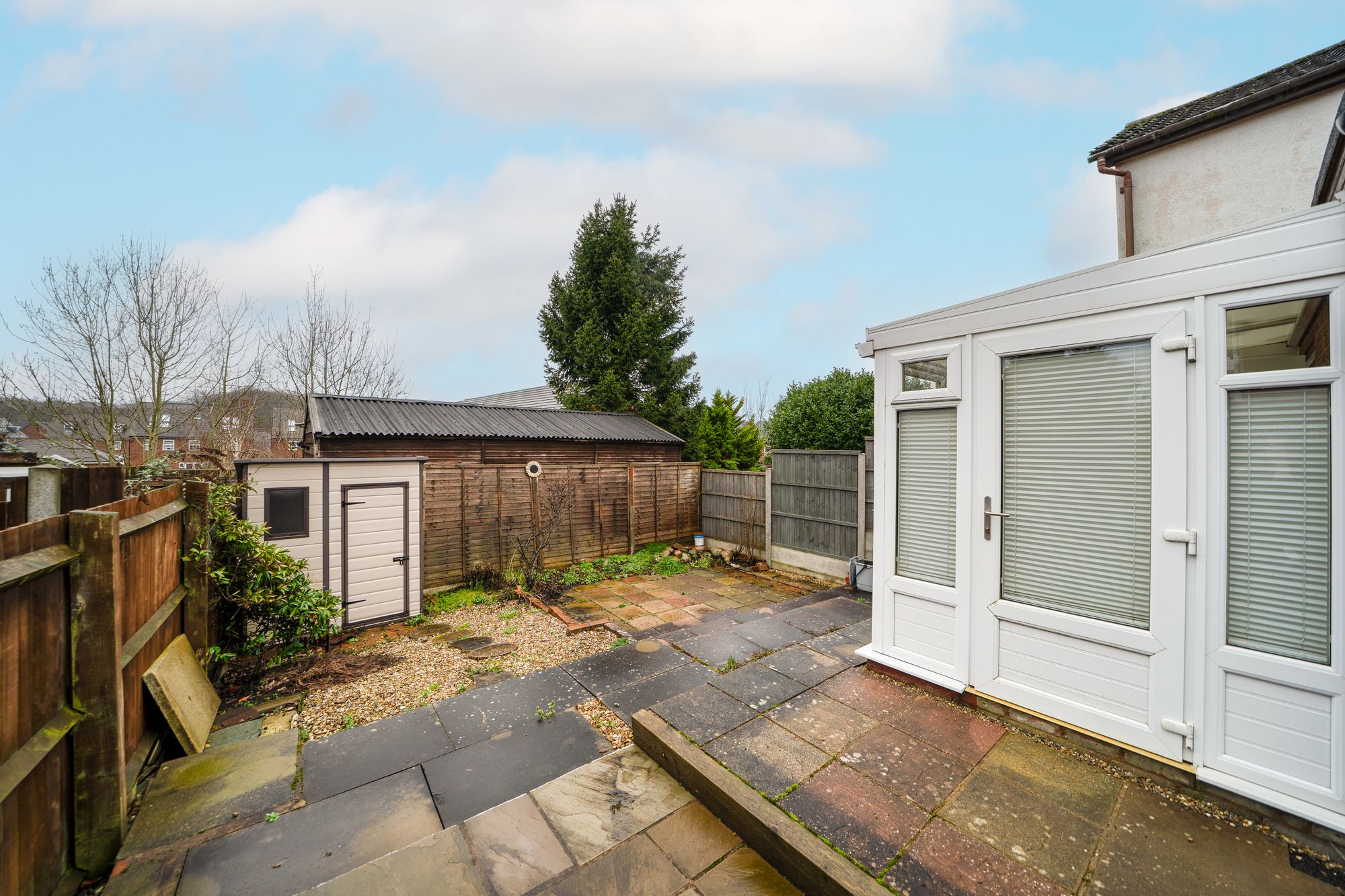 To the rear, the property benefits from a modern fitted kitchen/diner, designed to offer both functionality and a sociable layout. The kitchen area is fitted with contemporary units and ample work surfaces, flowing naturally into the dining space, ideal for everyday family life and entertaining. From here, doors lead directly into a conservatory, providing an additional reception area with views over and access to the garden, creating a light-filled extension of the living space.