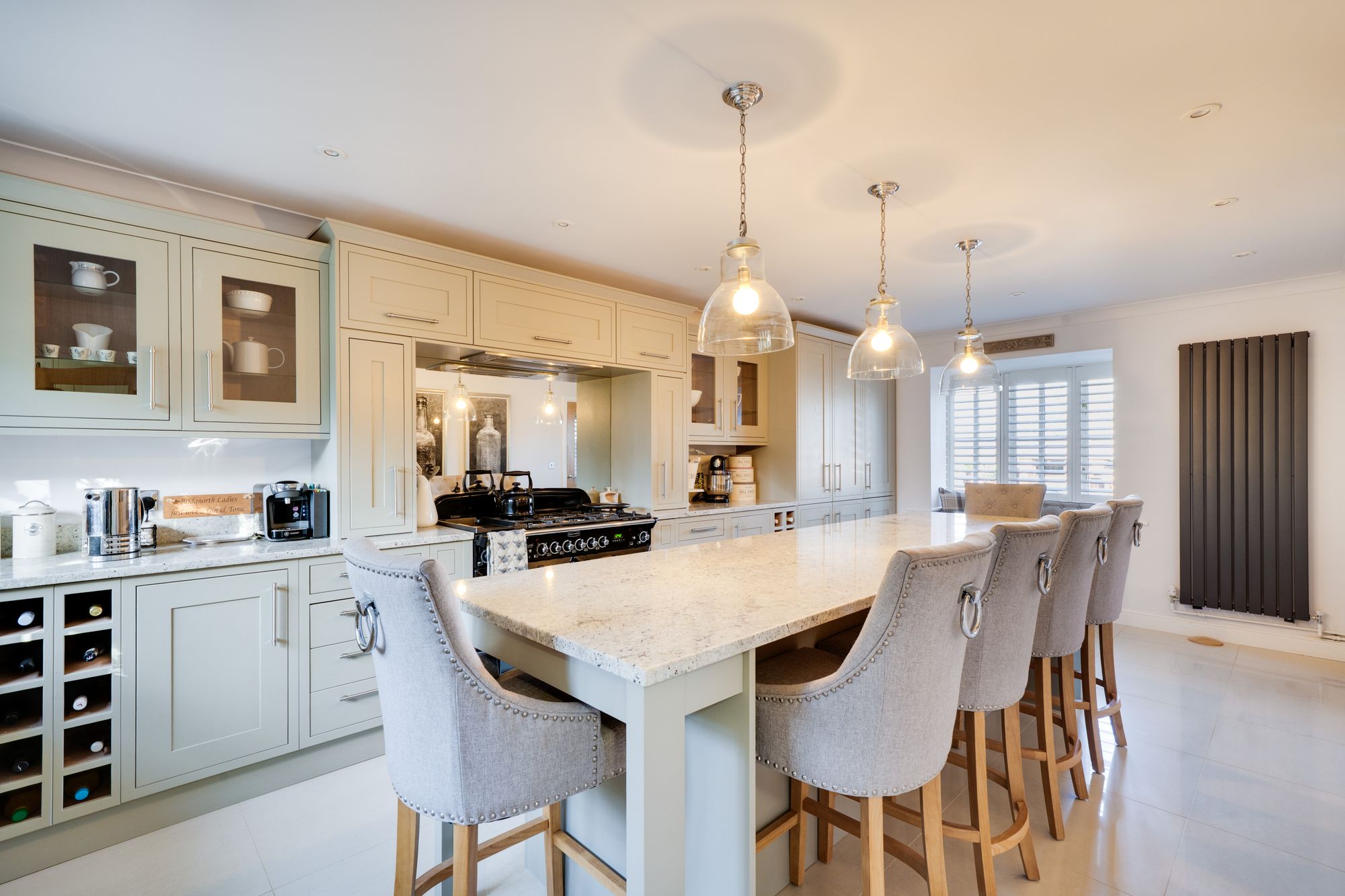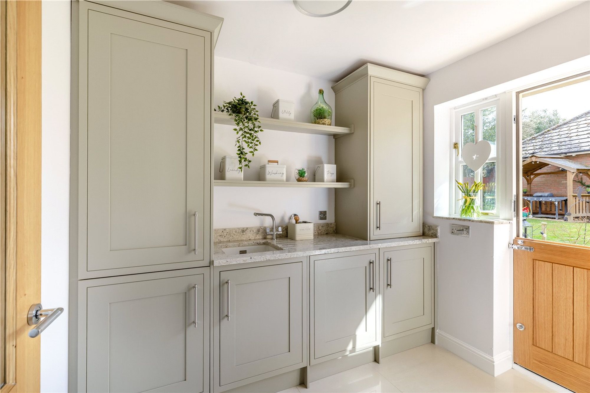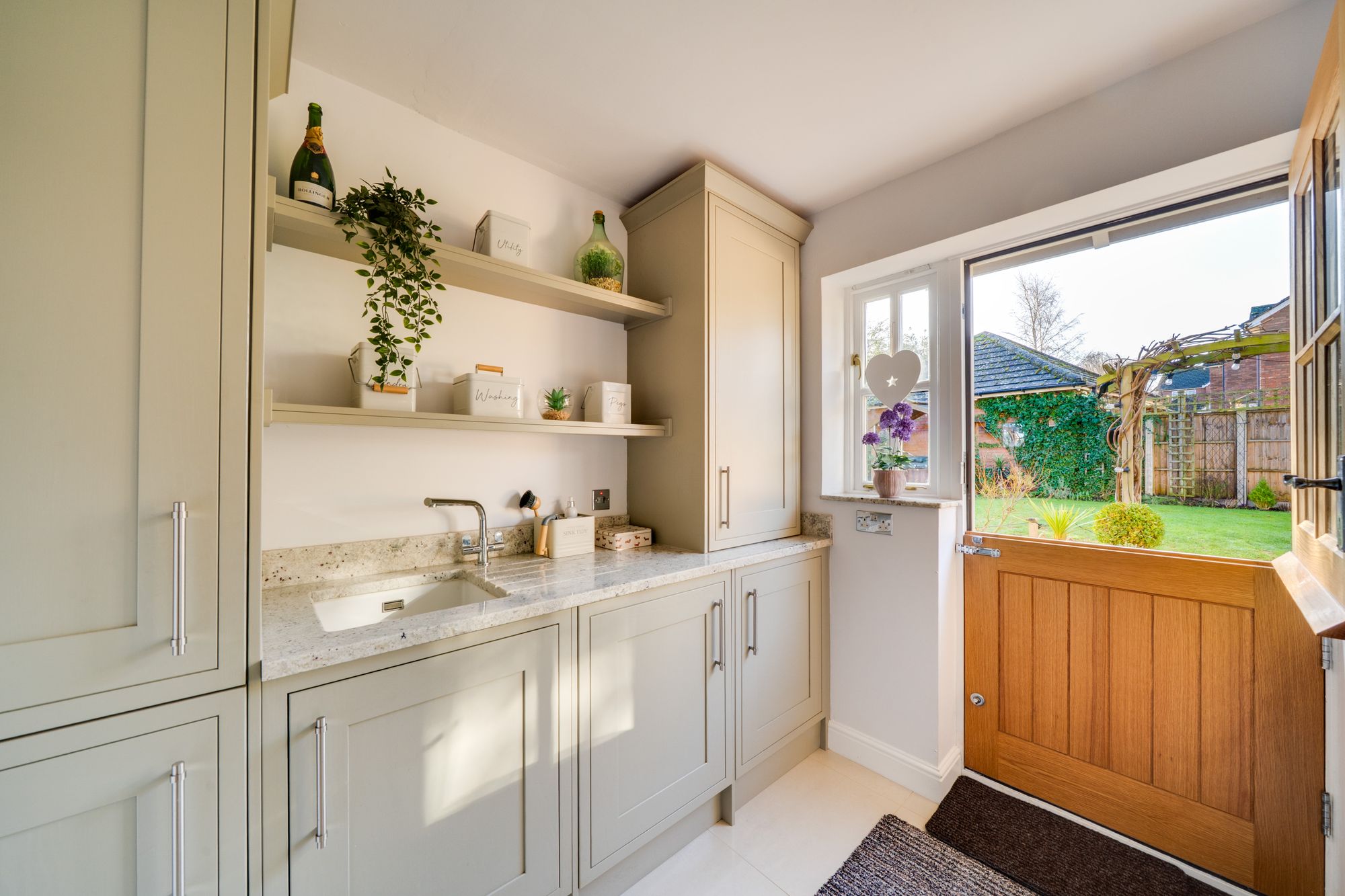 The beautifully appointed dining kitchen spans the full length of the house, with large windows at either end to allow plenty of light. The kitchen is fitted with a generous range of high quality wall and base units centred around the Rangemaster cooker with mirrored splashback. At the heart of the kitchen is a large central island providing seating up to six people, ideal for entertaining and modern day to day living. The kitchen is complete with integrated dishwasher. Just off the kitchen is a matching utility with integrated white goods and access door to the rear garden.