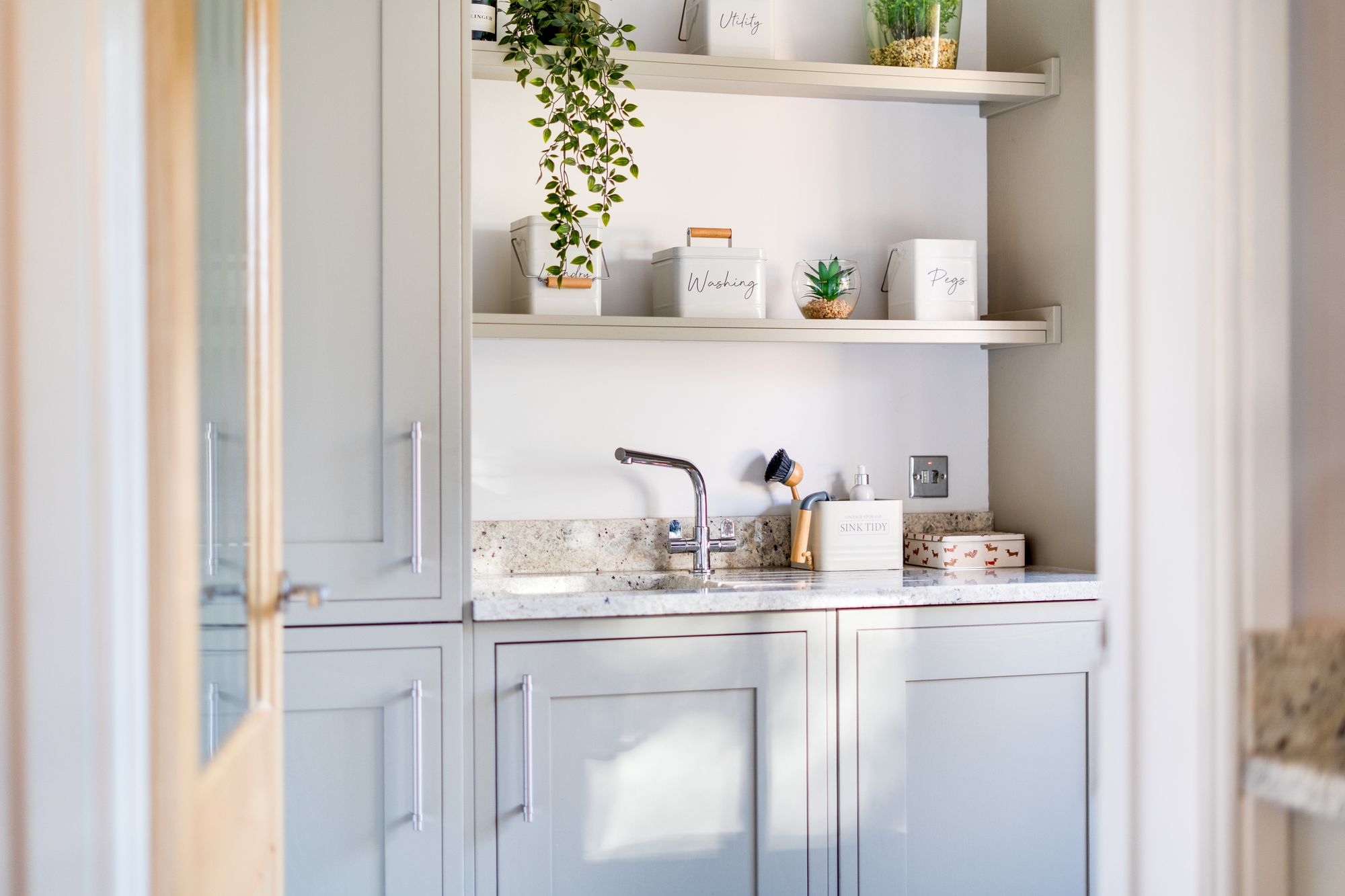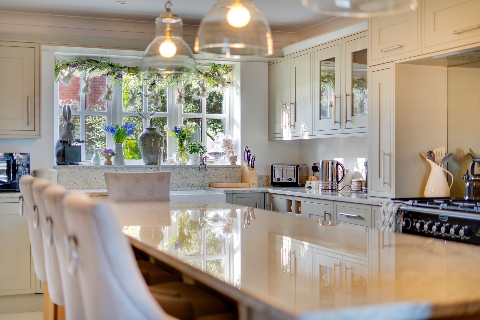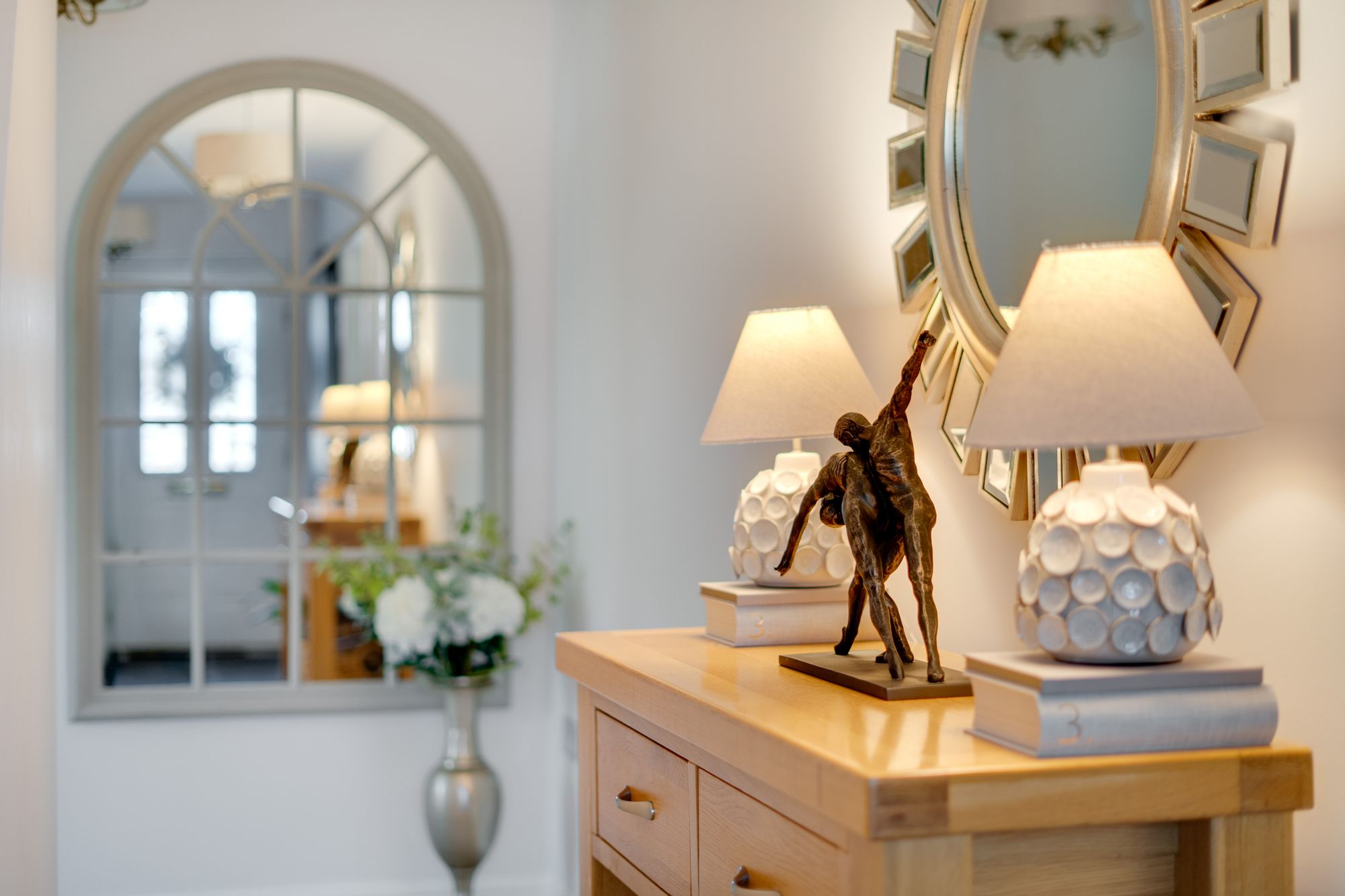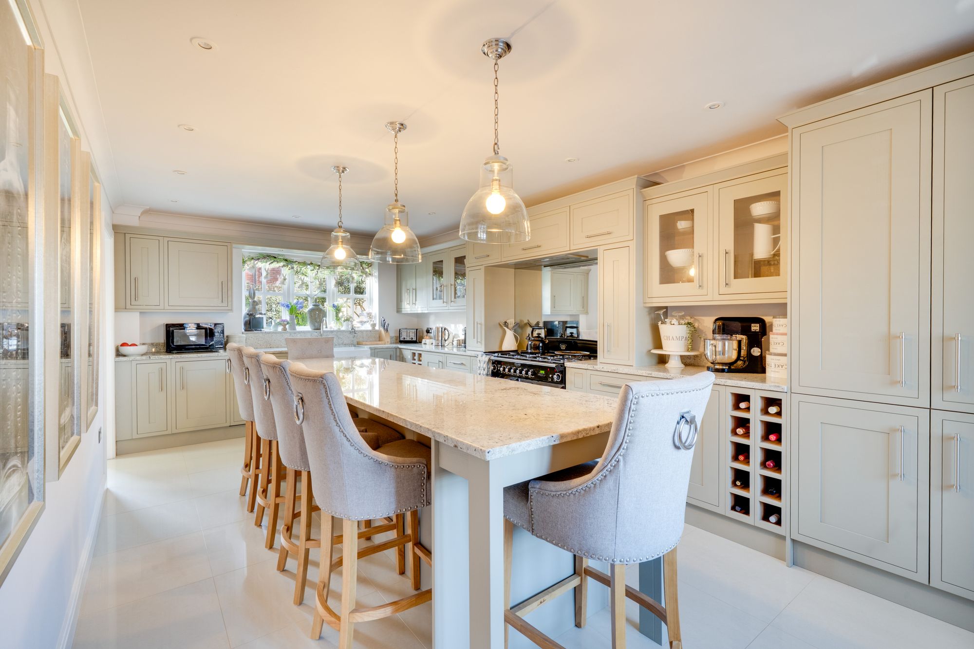The beautifully appointed dining kitchen spans the full length of the house, with large windows at either end to allow plenty of light. The kitchen is fitted with a generous range of high quality wall and base units centred around the Rangemaster cooker with mirrored splashback. At the heart of the kitchen is a large central island providing seating up to six people, ideal for entertaining and modern day to day living. The kitchen is complete with integrated dishwasher. Just off the kitchen is a matching utility with integrated white goods and access door to the rear garden.