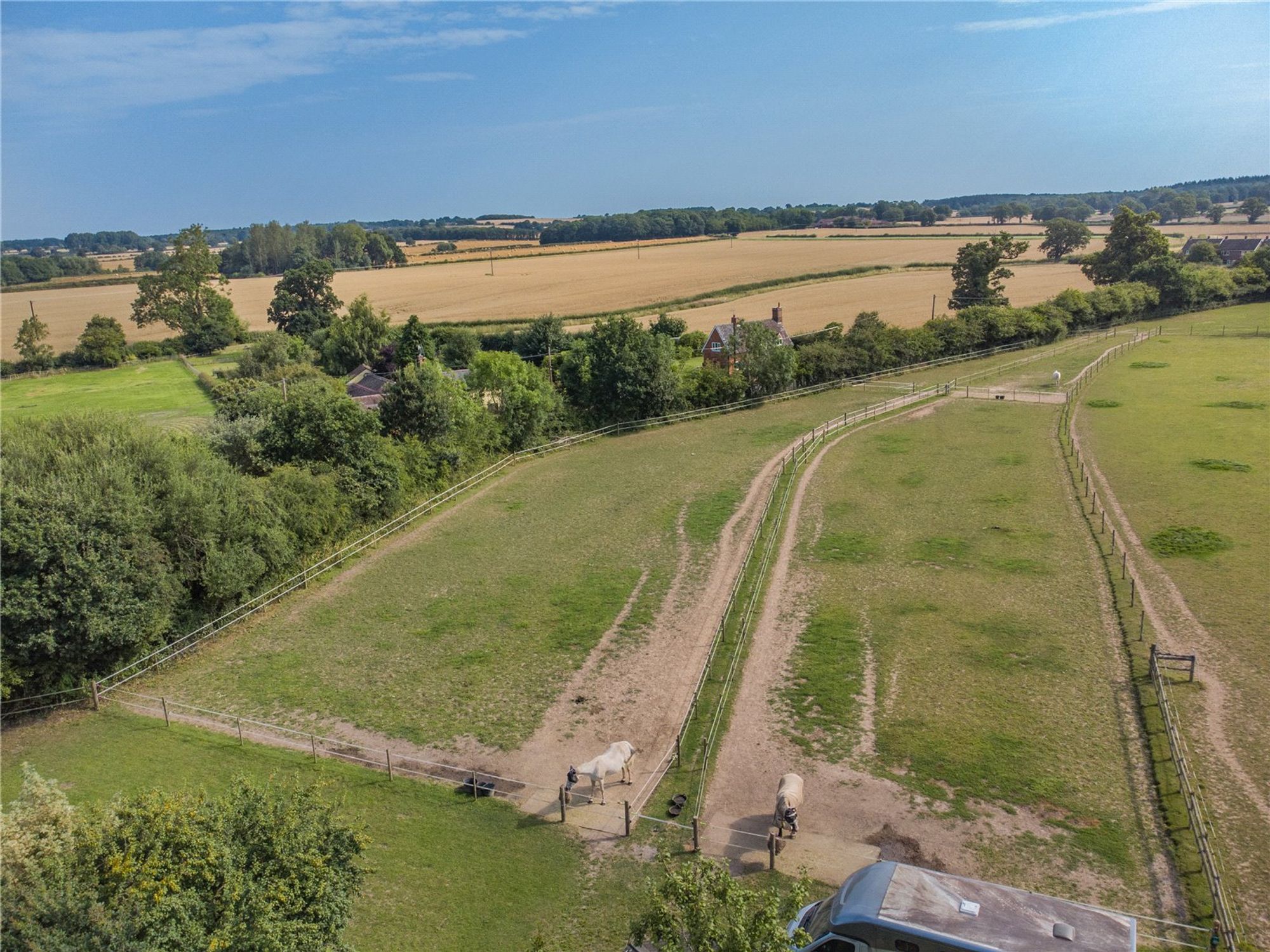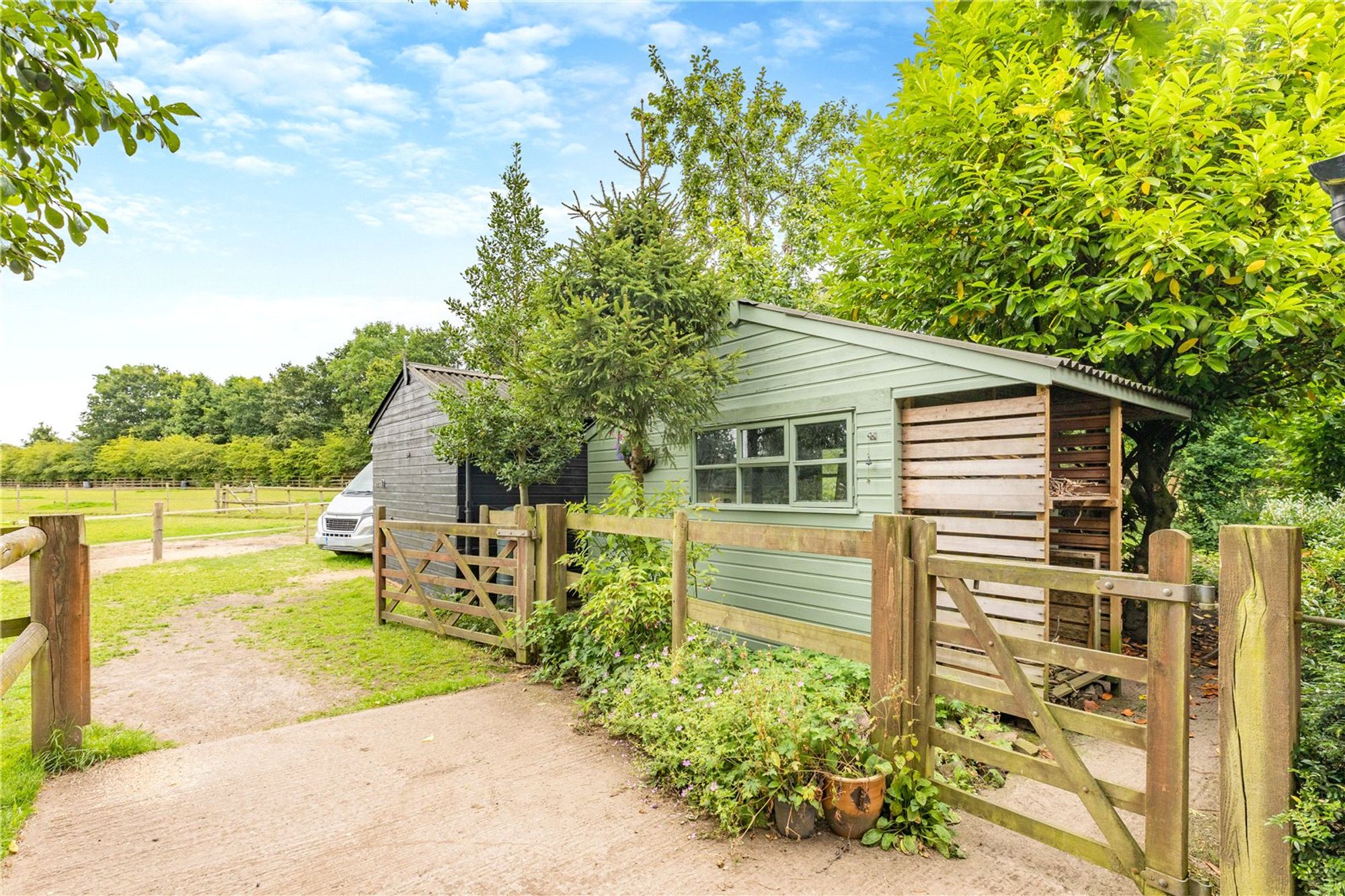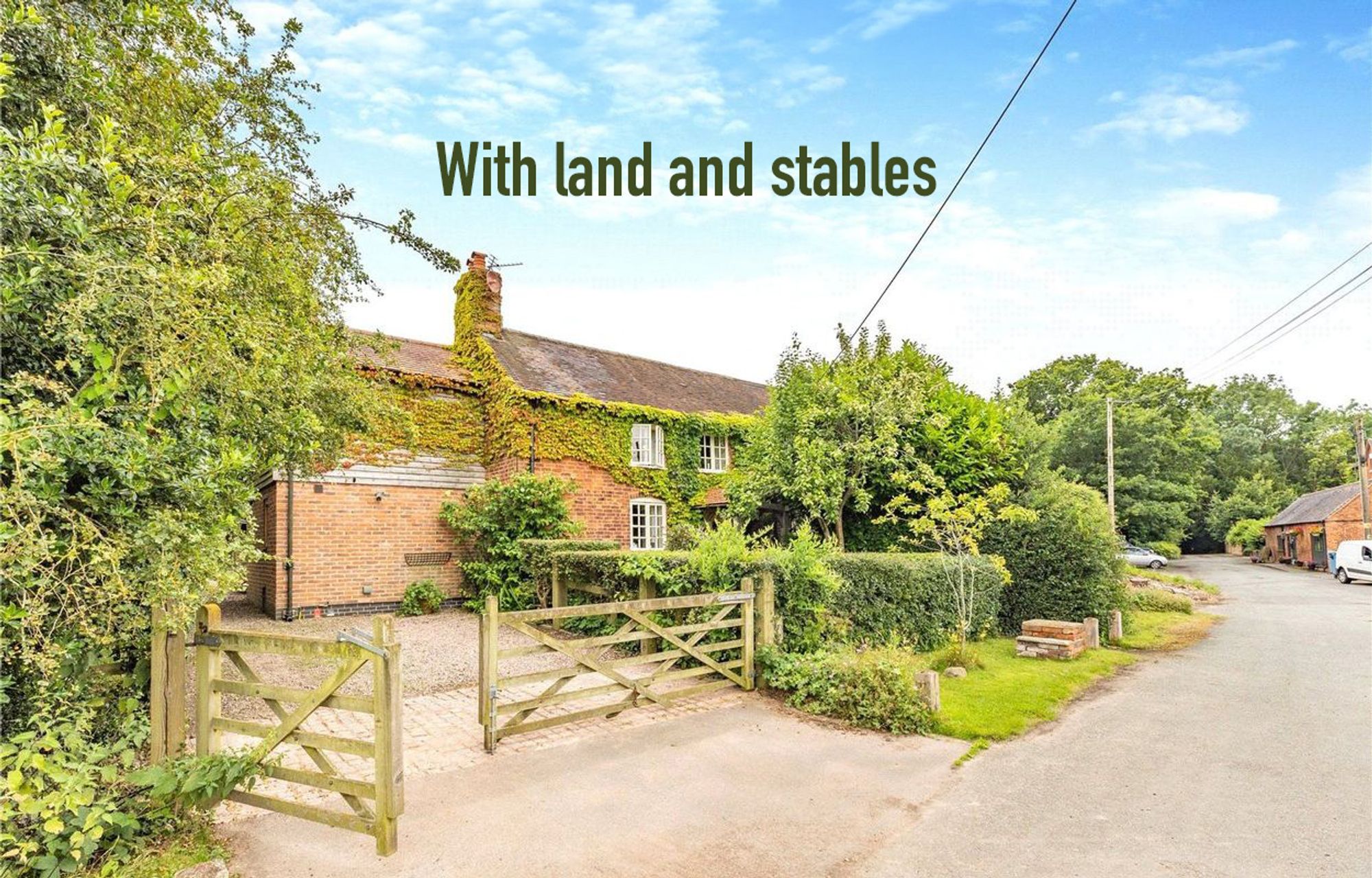 Externally, a gated gravelled driveway provides ample parking and side access to the garden, stables and paddock. The pretty rear garden includes a large paved patio sitting area, lawn and mature trees and shrubs.